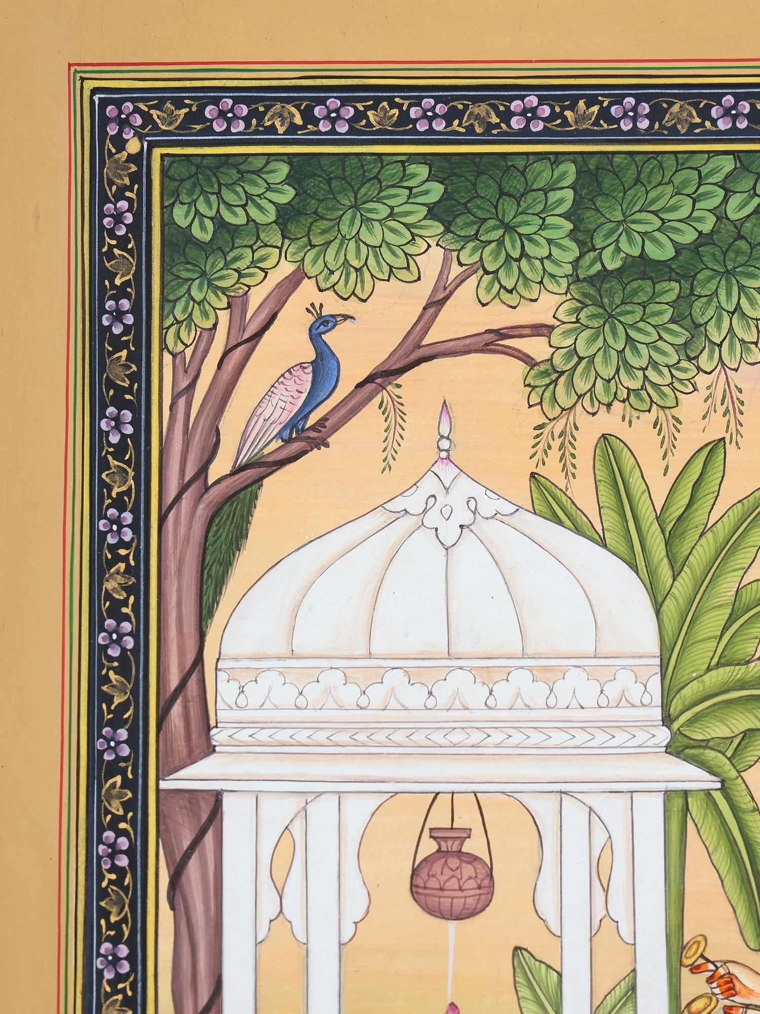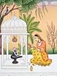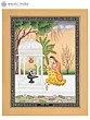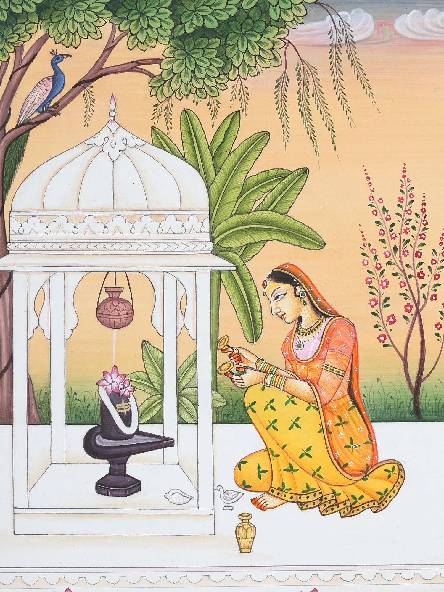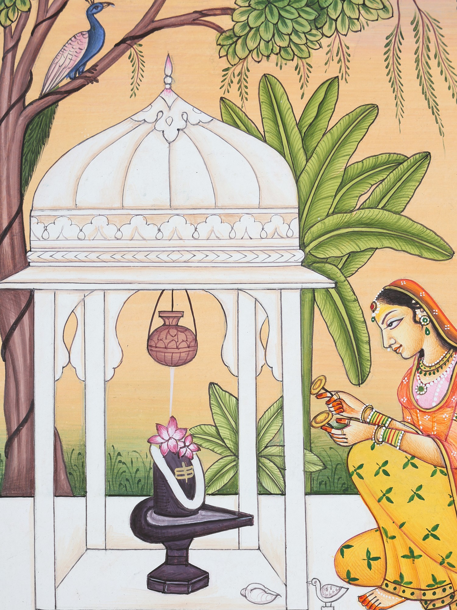 A female devotee, kneeling on one knee, is worshiping the Shiva Linga with a lotus pond in the foreground. She has placed offerings of fresh lotuses and a garland of white flowers on the Linga, which is nothing but an iconic form of Bhagawan Shiva. She is singing hymns in praise of her Lord, accompanied by hand cymbals (manjira). Milk dripping from a pot (kalash) above does abhishek of Bhagawan Shiva. It is said in Sanskrit: ‘abhishekpriya hi Shiva, alankarapriya hi Vishnhuh’; i.e. Shiva is pleased with abhisheka and Vishnu when He is adorned.