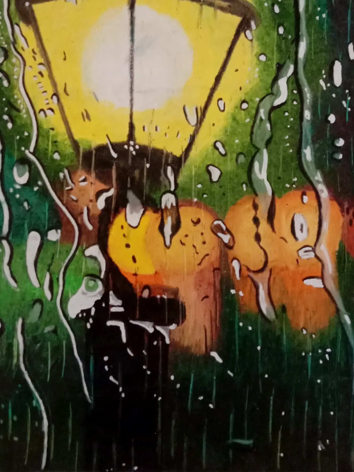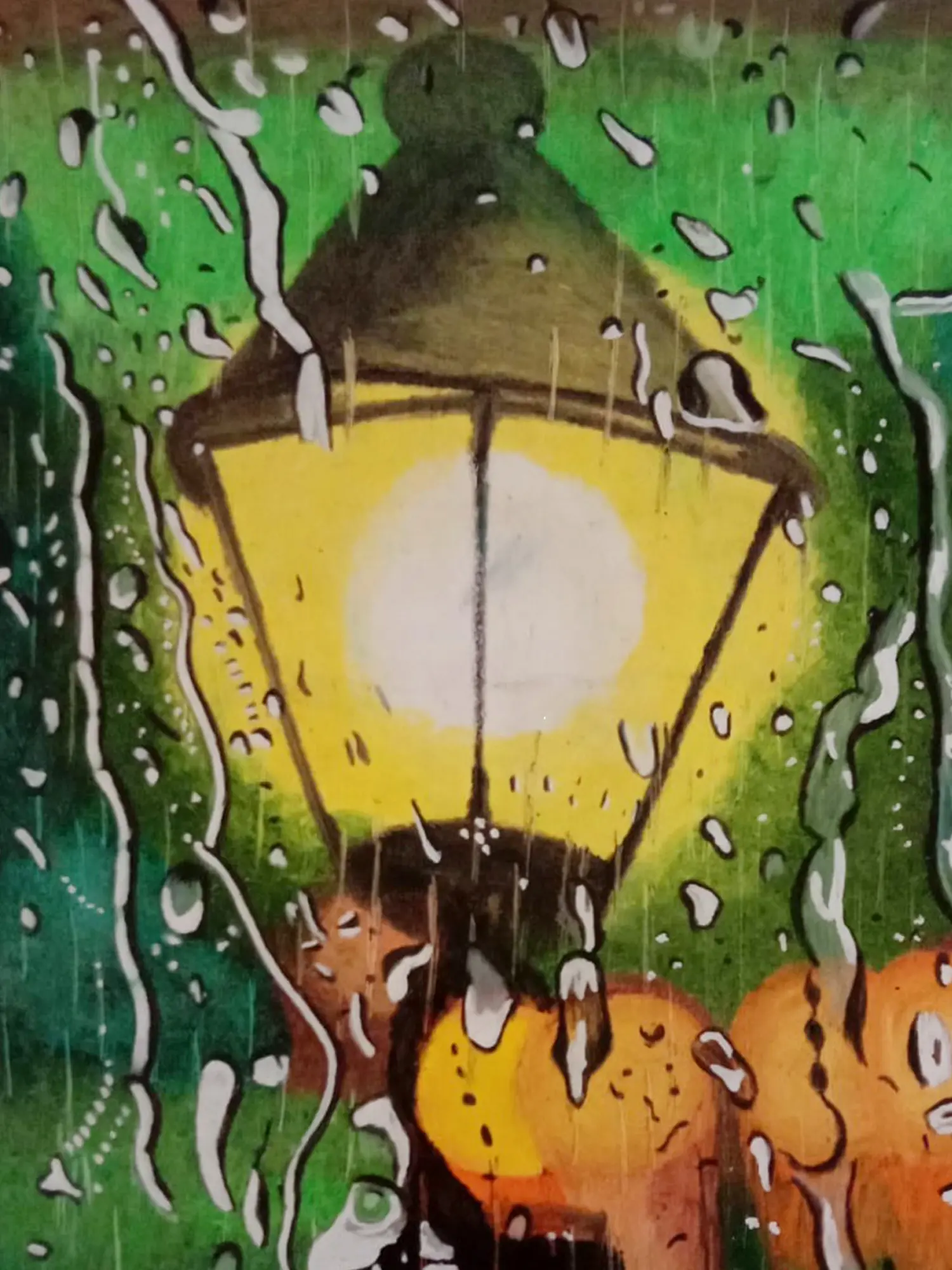 In the painting "Rainfall Street Light" by Kush Gupta, a romantic ambiance unfolds as raindrops cascade on the lamplight, transforming the scene into a poetic dance. Executed with Oil Pastel on Paper, Gupta captures the intimacy of a rainy night. The play of light and shadow reveals the enchanting chaos of raindrops, resembling musical notes on the street.