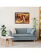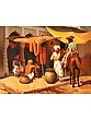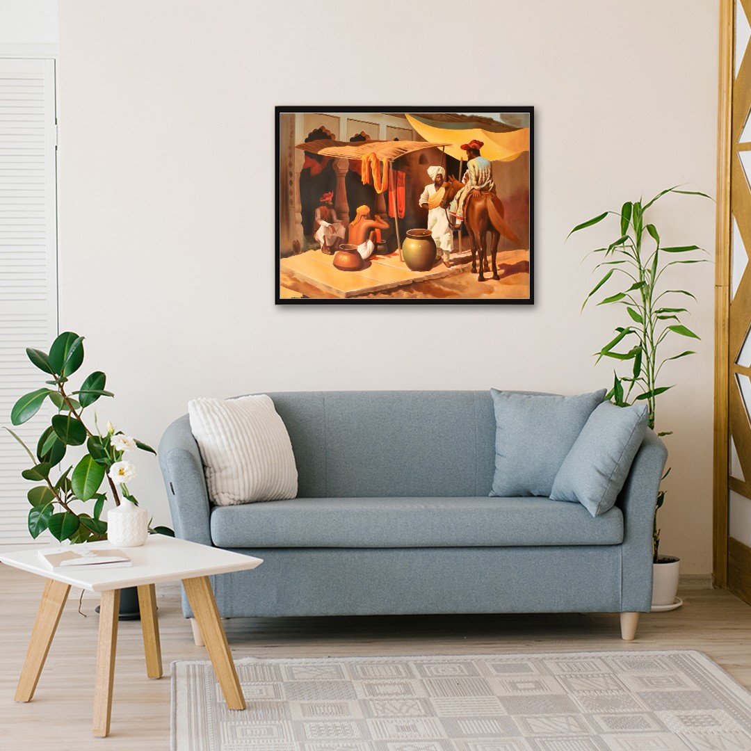 Here is a depiction of Anup Gomay in which the king's officials or the merchant is collecting his dyed garment or taxes. In the canvas, one could see the boiling copper cauldron with coloured water. The dyed apricot clothes are hanging on a man-made drying stand. The labourers are busy with their tedious work as their masters discuss the imposed taxes and the upcoming battle between the marwars and the sultanas. The artist has canvassed the pain of the rangrez community who is crushed between the domain of war and free labour.