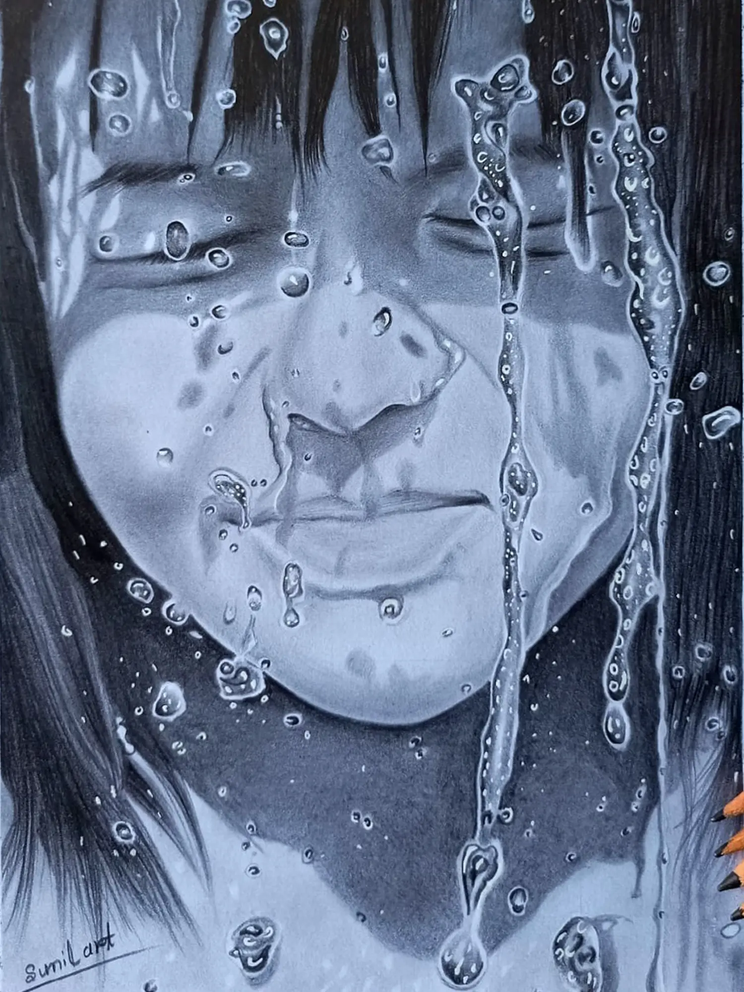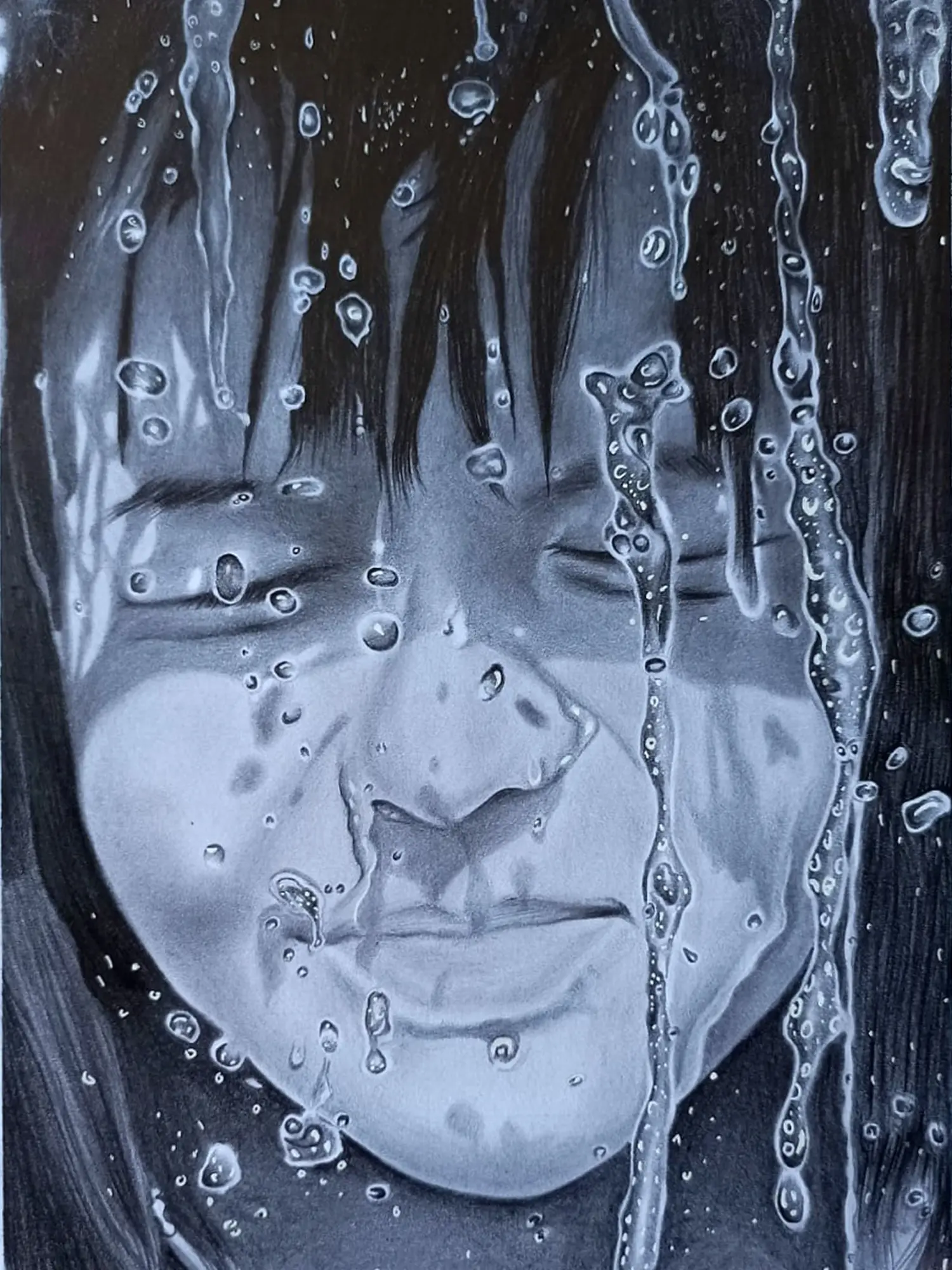 With detail, the graphite portrait of water effect on the face captures the ephemeral beauty of liquid grace. Each stroke mirrors the fluidity of nature, depicting the interplay of light and shadow on the skin's surface. The artwork transcends conventional boundaries, inviting viewers to immerse themselves in the ethereal realm of sensory perception. Through the subtle nuances of expression, it evokes a sense of wonder and introspection, prompting contemplation on the transient nature of existence.