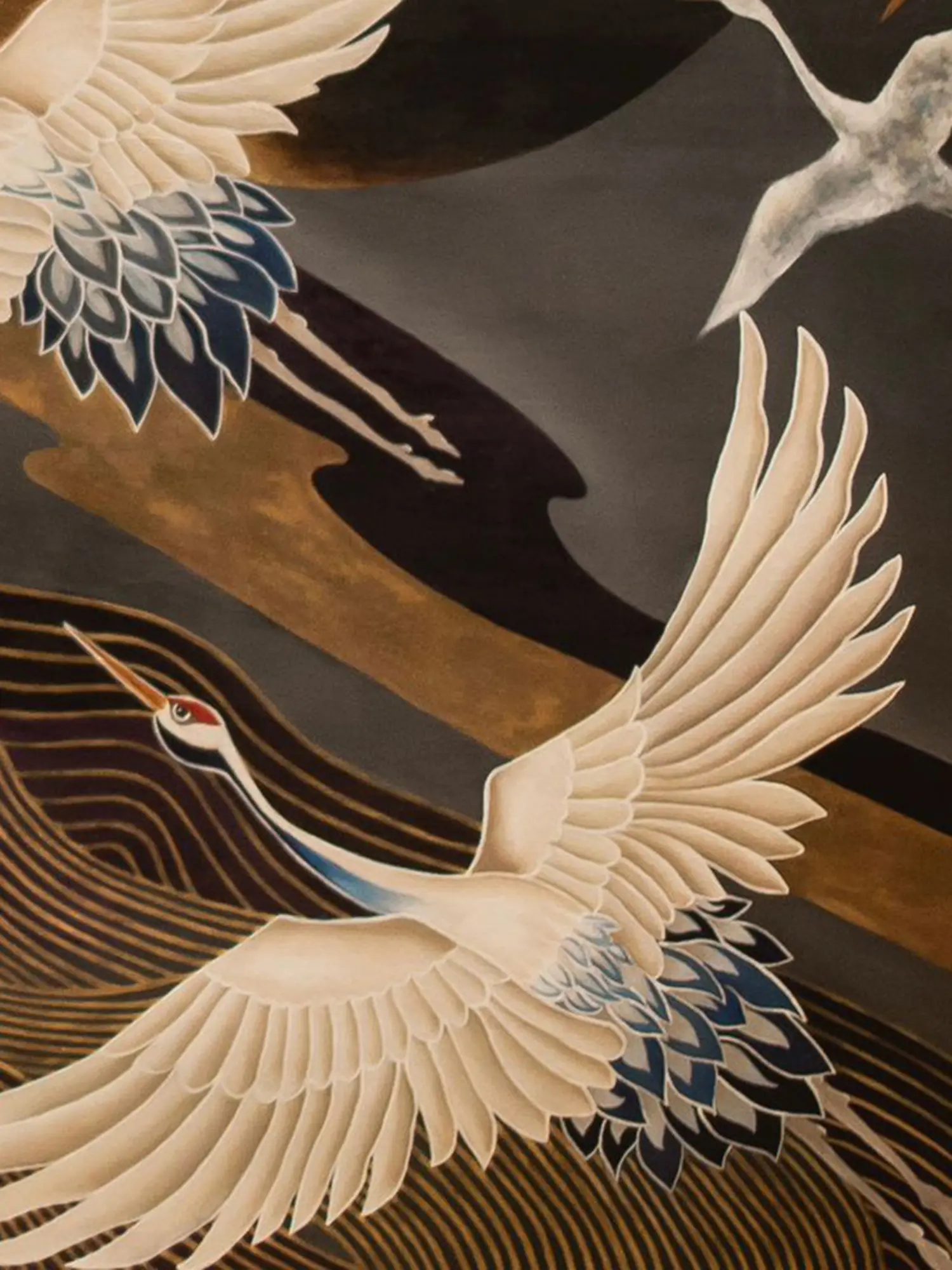 The red-crowned crane holds profound significance in numerous cultures, particularly in East Asia. In Japan, it is considered a sacred bird, a symbol of longevity, good fortune, and marital fidelity. Legend tells of the crane's ability to live for a thousand years, earning it a place of honor in mythology and folklore. Folktales often depict cranes as benevolent spirits, capable of granting wishes and offering protection. They are frequently featured in traditional Japanese art, often seen as messengers of the gods or as symbols of purity and grace. Similarly, in Chinese culture, the crane represents immortality, nobility, and virtue. The artist’s masterful depiction of these majestic birds beautifully captures this deeply rooted cultural reverence.