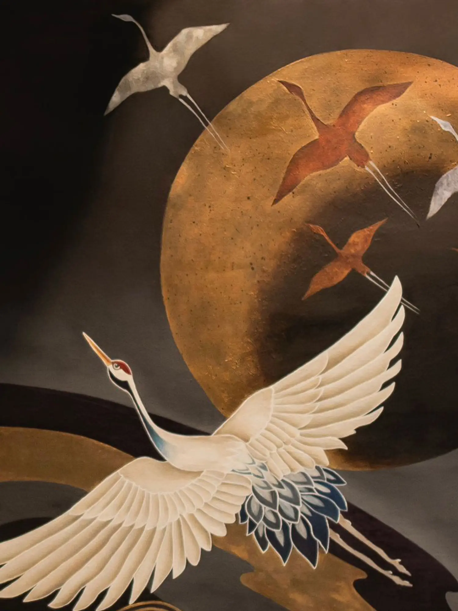 Measuring an impressive 48 inches in height and 36 inches in width, "The Red-Crowned Crane" commands attention and will undoubtedly become the focal point of any room. Its rich colors, intricate details, and powerful symbolism make it a stunning addition to both modern and traditional interior designs. Whether placed in a living room, study, or gallery setting, this painting will bring a sense of peace, serenity, and sophistication to its surroundings. Its presence is a subtle reminder of the timeless elegance of nature and the powerful cultural symbolism inherent in the crane's majestic form. The gold foil adds a touch of opulence that transforms this artwork into an heirloom-quality addition to your collection, bringing a wealth of culture and artistic expression to your home. The expansive size allows the viewer to fully immerse themselves in the intricate details of the artwork, appreciating the depth and complexity of the artist's vision.