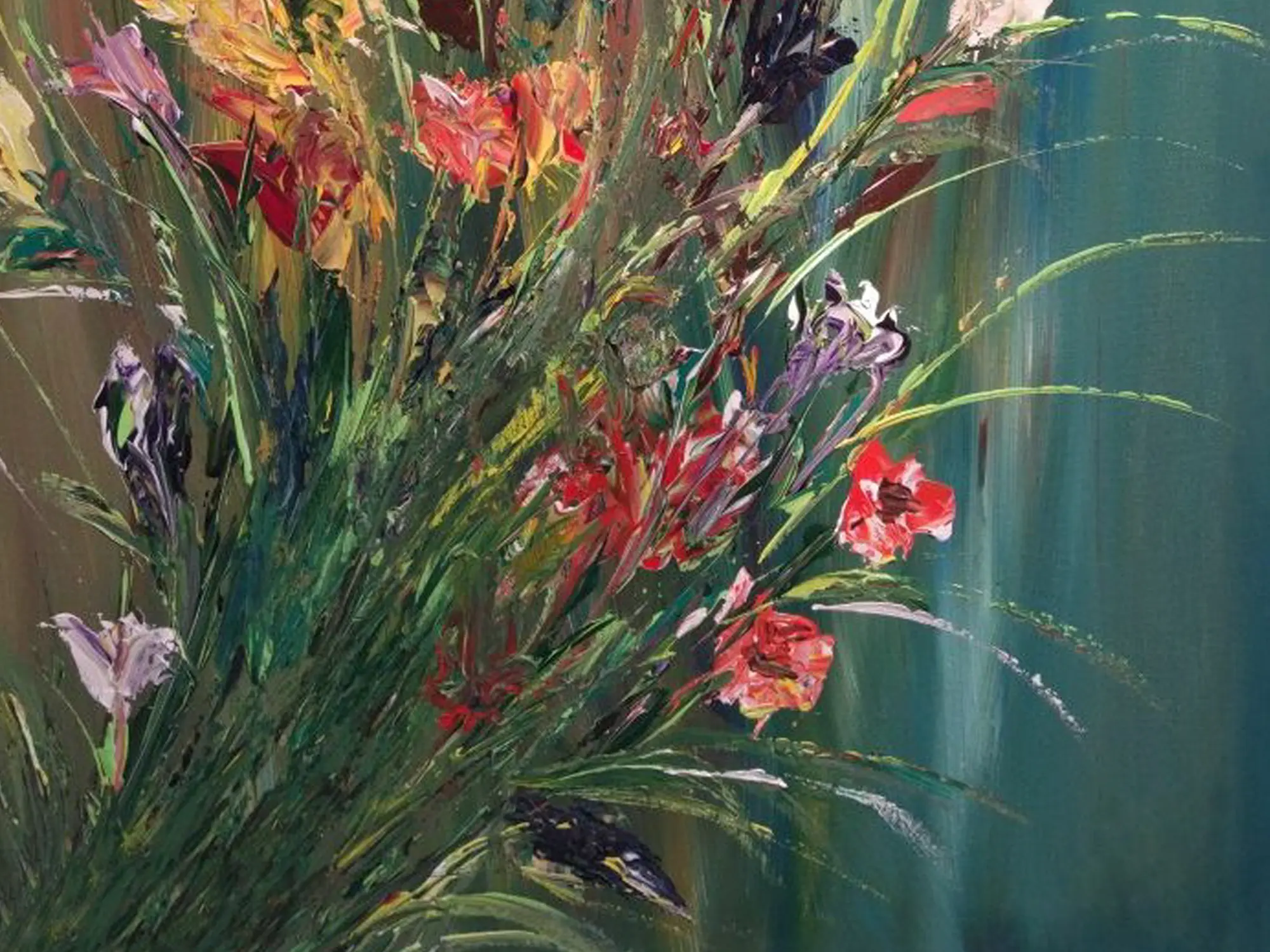 The interplay of light and shadow, captured by the artist's skilled hand, brings the flora to life with an almost tangible vibrancy. A harmonious palette of earthy greens, fiery reds, soft yellows, and deep purples creates a lively yet balanced composition that draws the eye across the 36-inch height and 24-inch width. You'll discover new details with every viewing, a testament to its intricate design.