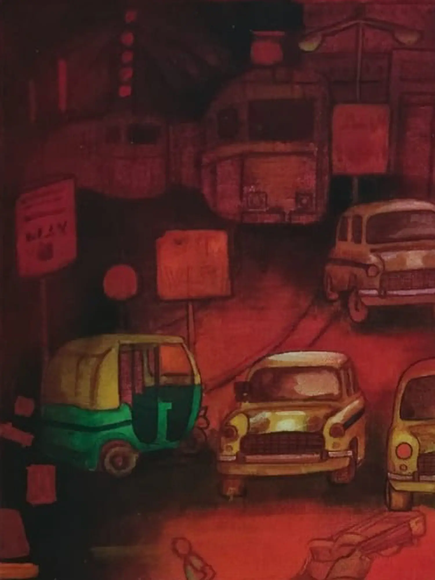 Kolkata My City - Night View Traffic | Charcoal And Acrylic On Canvas | By Payel Mitra