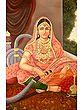 A sharp-featured, royally adorned lady is the subject of this stunning oil on canvas. The lady sits on a deep red rug, relaxedly placing her leg on bolsters, and holds the pipe of a Hukkah. The muted shade of her chunni (scarf) frames her face perfectly and the jeweled ornaments that shine on her body, are highlighted against the dark backdrop.