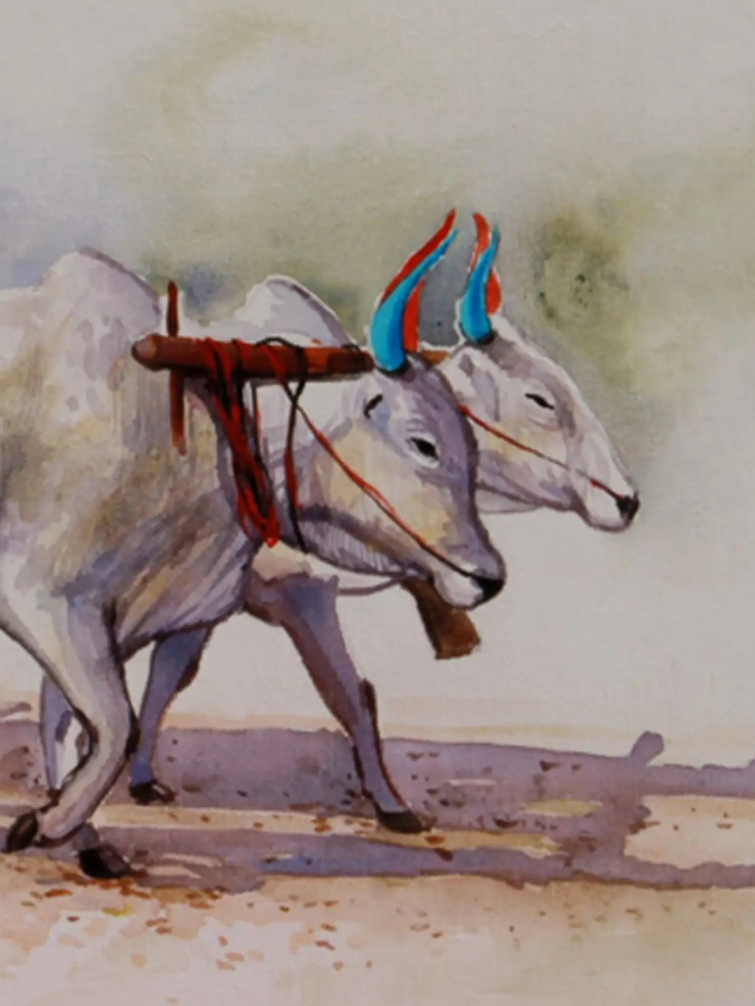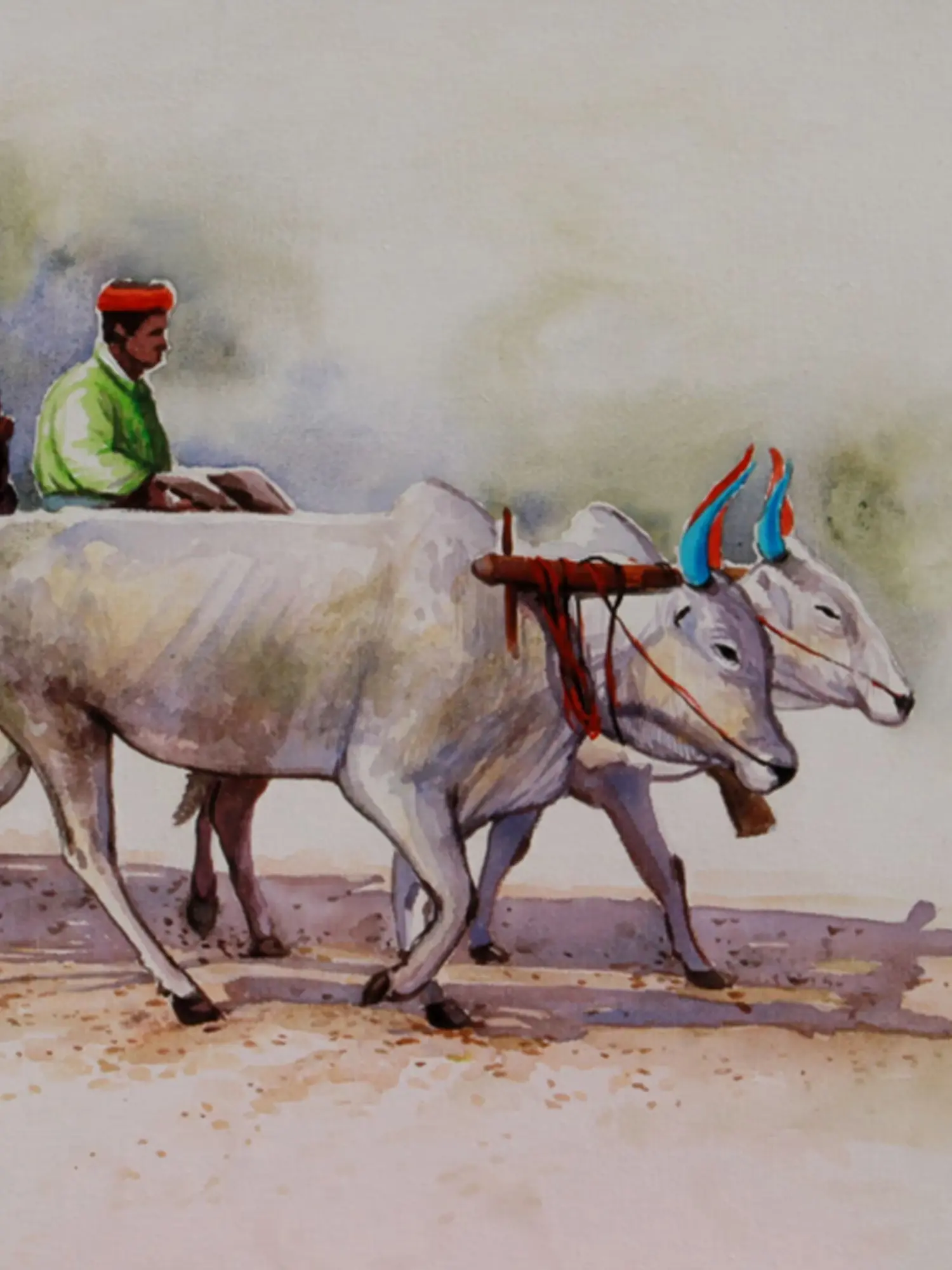 Man Riding A Bullock Cart | Watercolor Painting by Achintya Hazra