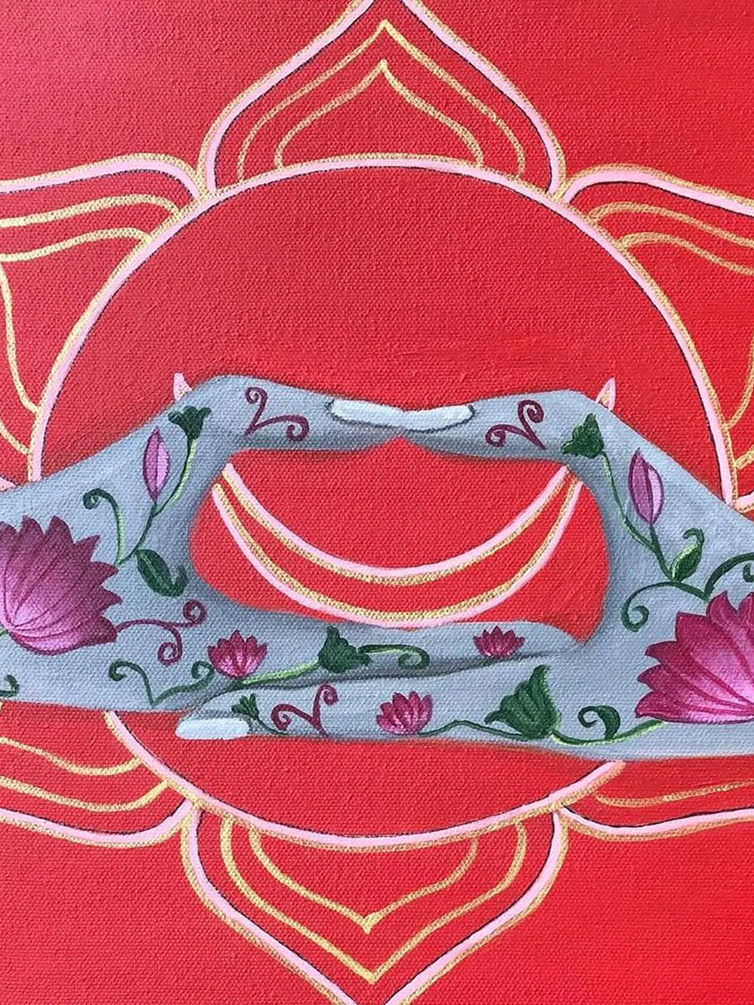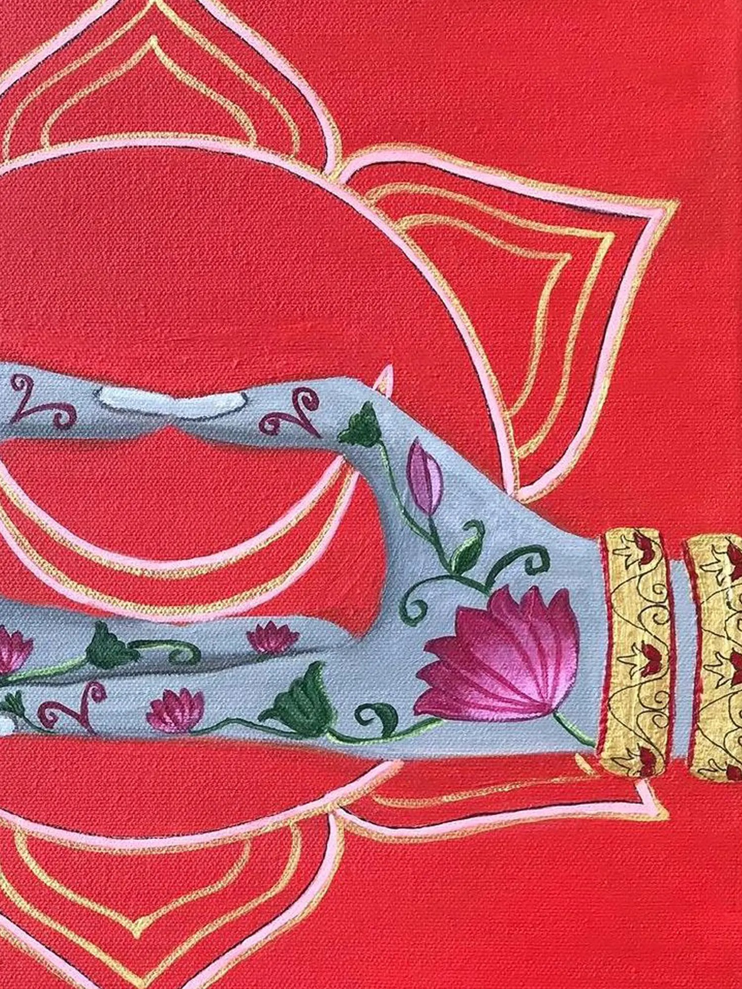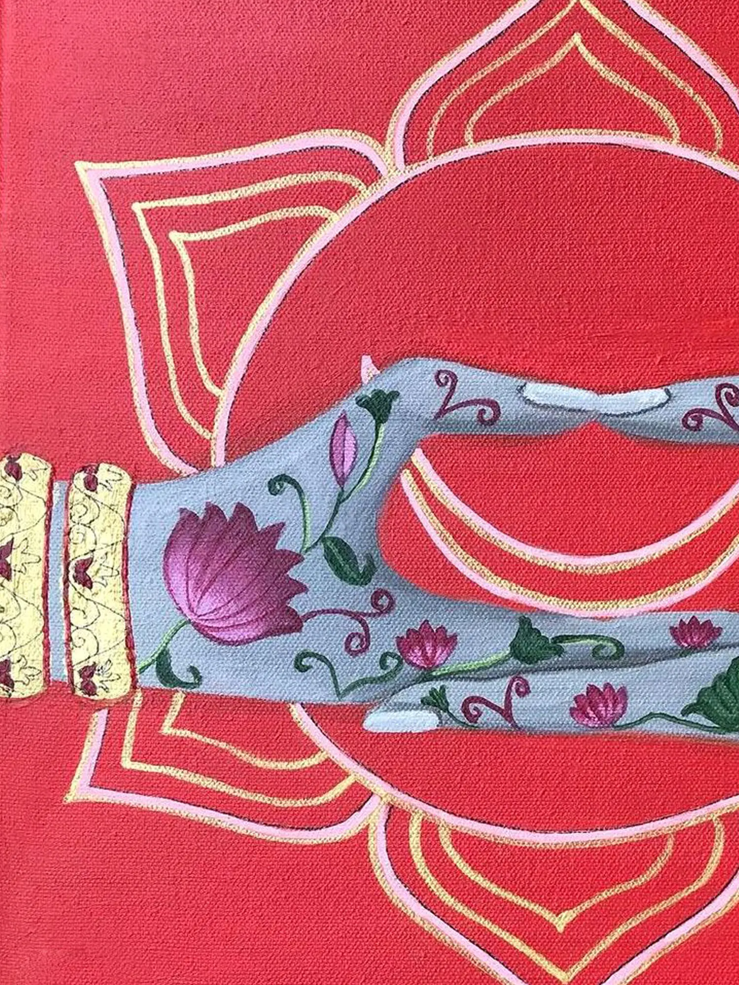 The artist, Kangana Vohra, masterfully blends symbolism and artistry to create a piece that is both visually stunning and energetically charged. The delicate details of the lotus blossoms intertwined with the elegant hand gesture serve as a gentle reminder to embrace your sensuality and allow yourself to feel joy, passion, and pleasure. With its dimensions of 24x24 inches, this piece serves as an evocative focal point for any room. This artwork is more than just a beautiful piece of art, it's an invitation to connect with your authentic self and embrace the flow of life.