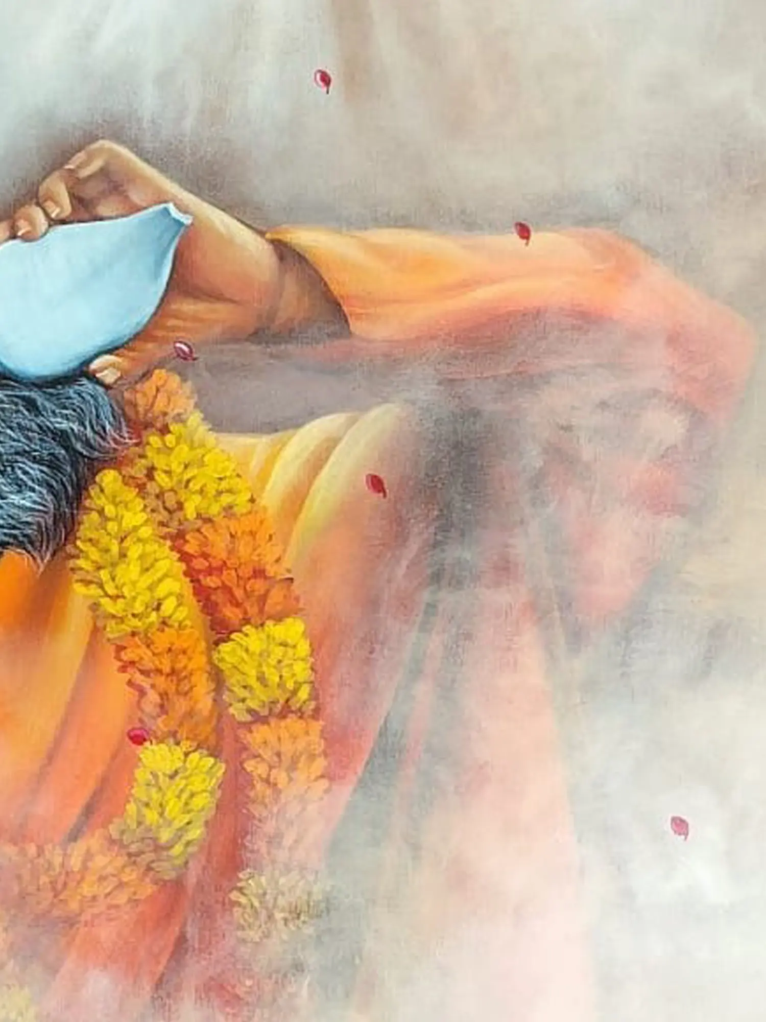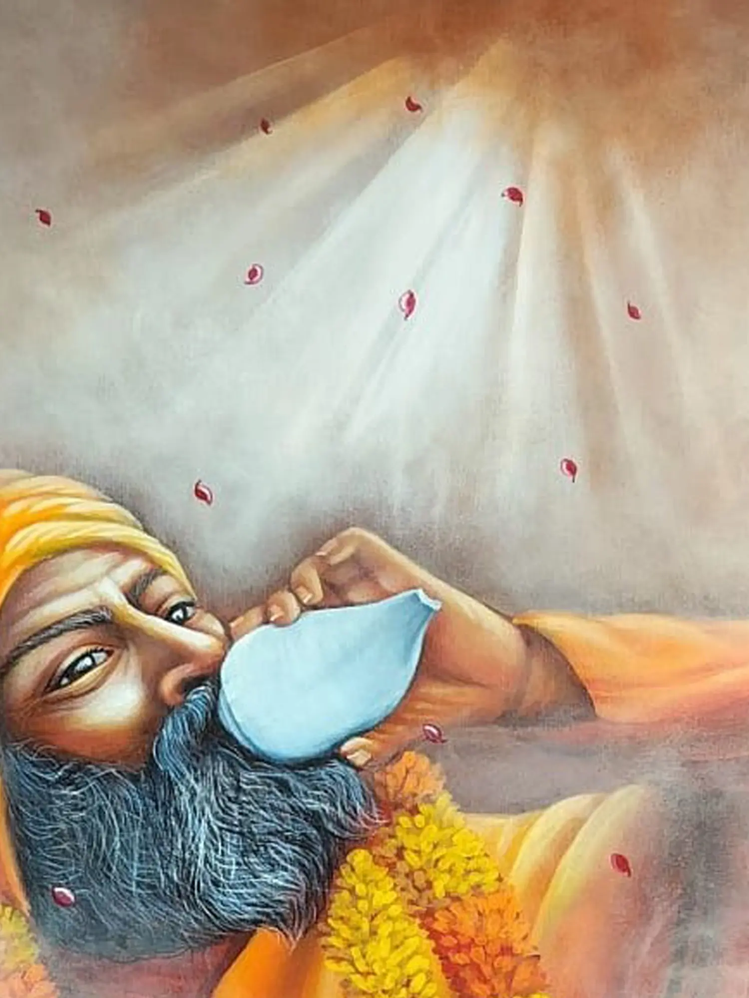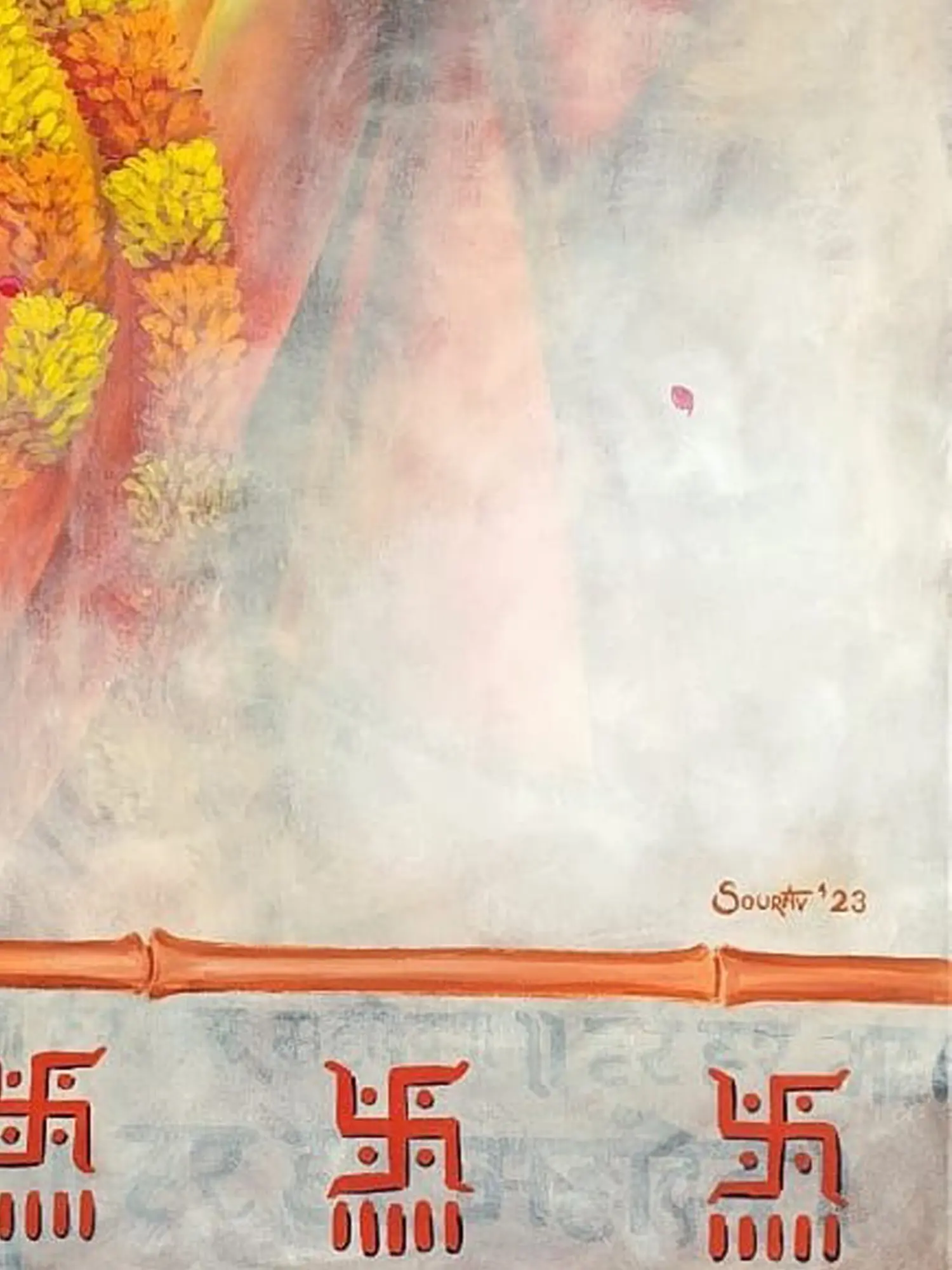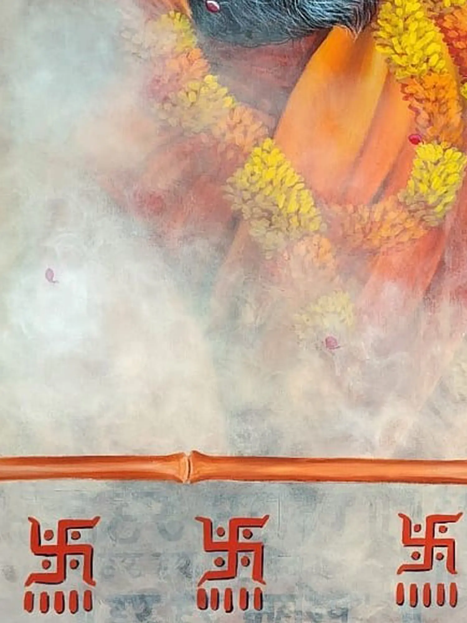 Dominating the composition, a dignified figure is depicted in a moment of quiet ritual, their gaze focused with introspective calm. Vivid saffron robes drape elegantly, complemented by a garland of marigolds, symbolizing purity and auspiciousness. The gentle cascade of rose petals and ethereal light filtering from above evoke a sense of divine blessing, creating an atmosphere of sacred grace. Below, the recurring Swastika symbol, a potent emblem of well-being and prosperity in various Eastern traditions, grounds the piece with a rich cultural significance. The entire composition unfolds across a substantial 48 inches in height by 36 inches in width, commanding attention with its scale and artistic presence.