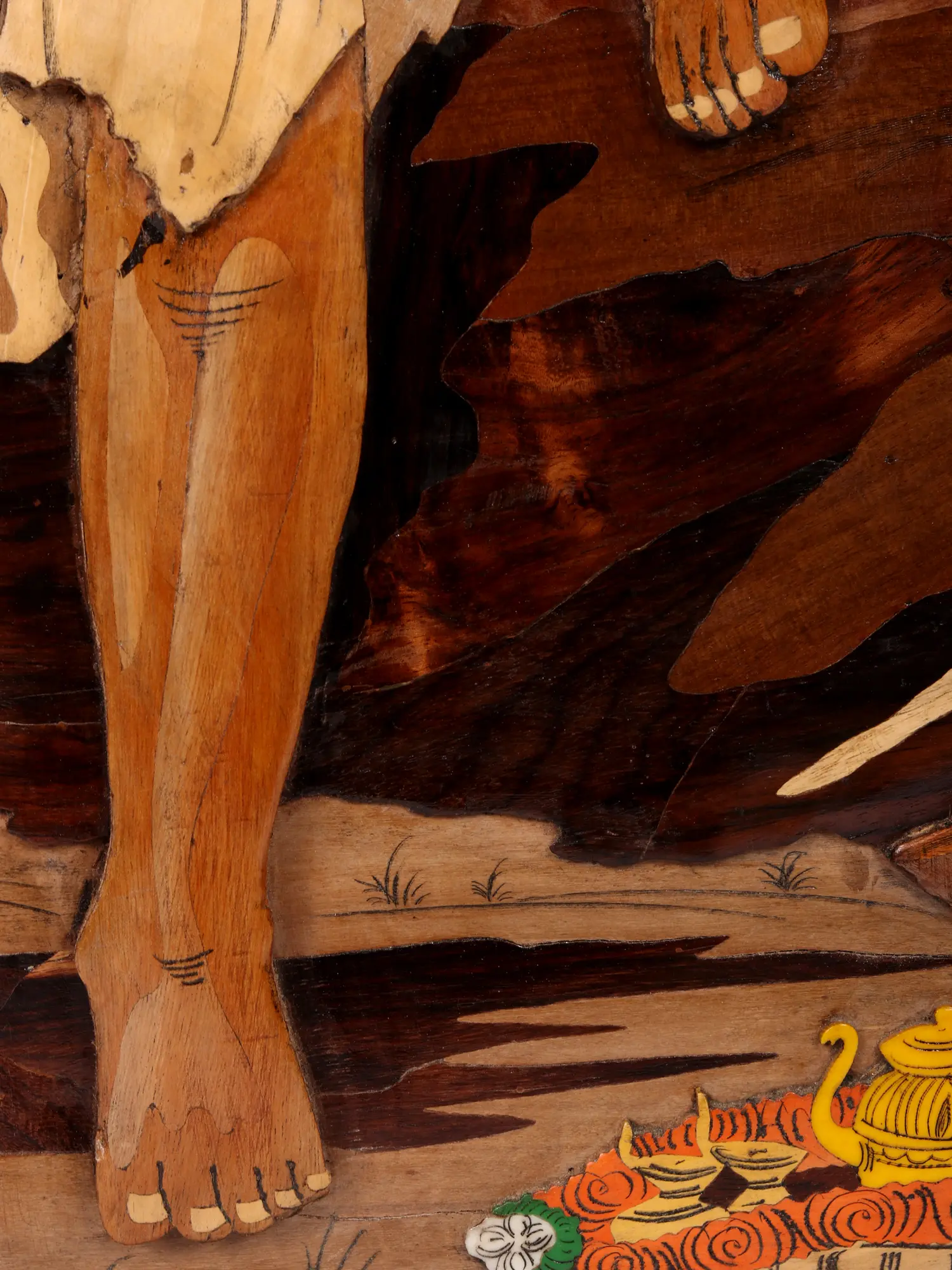 The natural colors of the wood are showcased to perfection, highlighting the subtle variations that lend character and warmth. Observe how the light plays across the varied grains and hues, from the soft glow of the halo to the earthy tones of the rock and the vibrant offering of fruits and tea. The intricately inlaid leaves forming the backdrop create a visual rhythm, drawing your eye to the central, commanding figure. The commanding scale, measuring 36 inches in height, 24 inches in width, and a substantial 2 inches in depth, ensures this artwork commands attention.