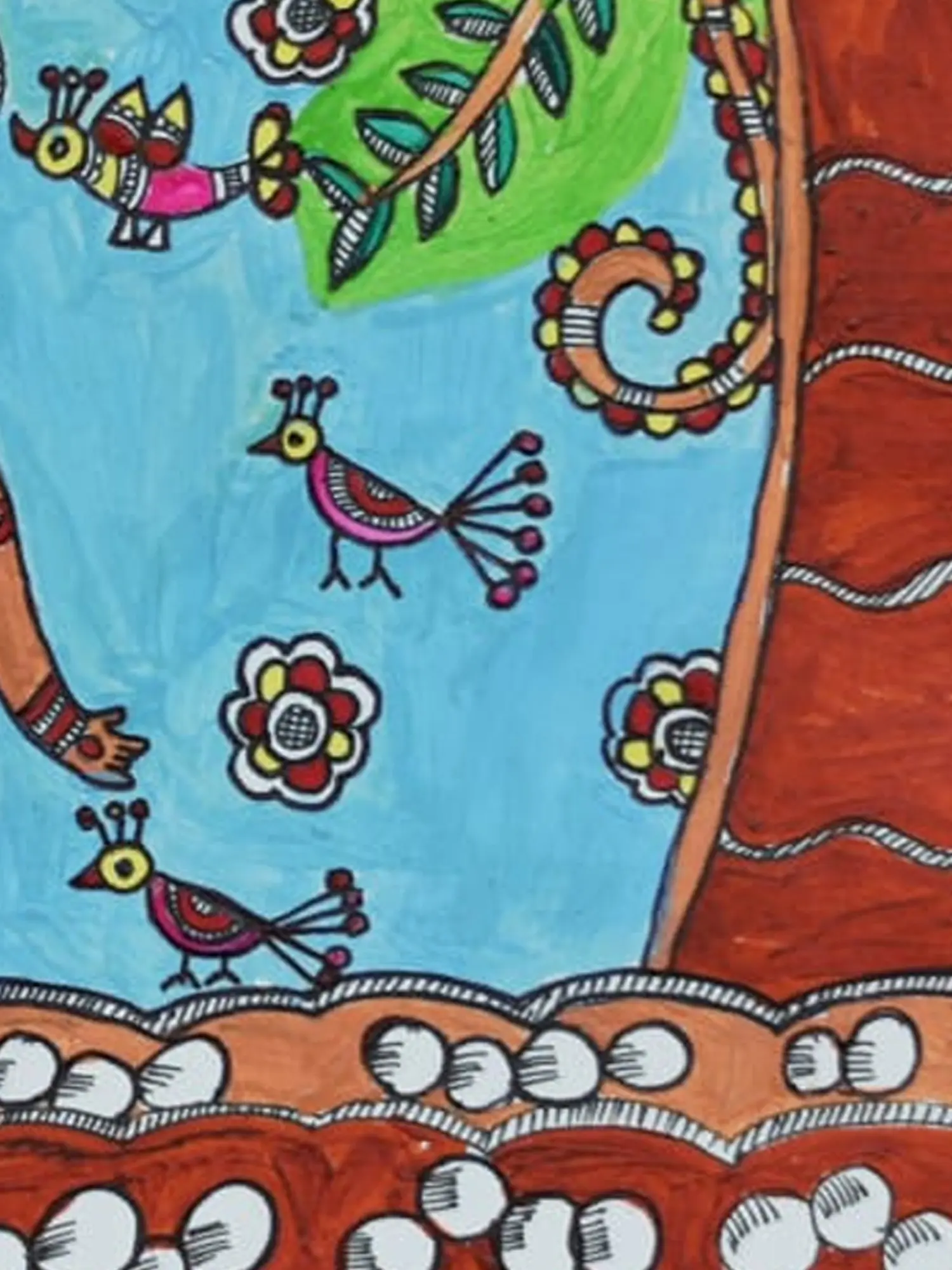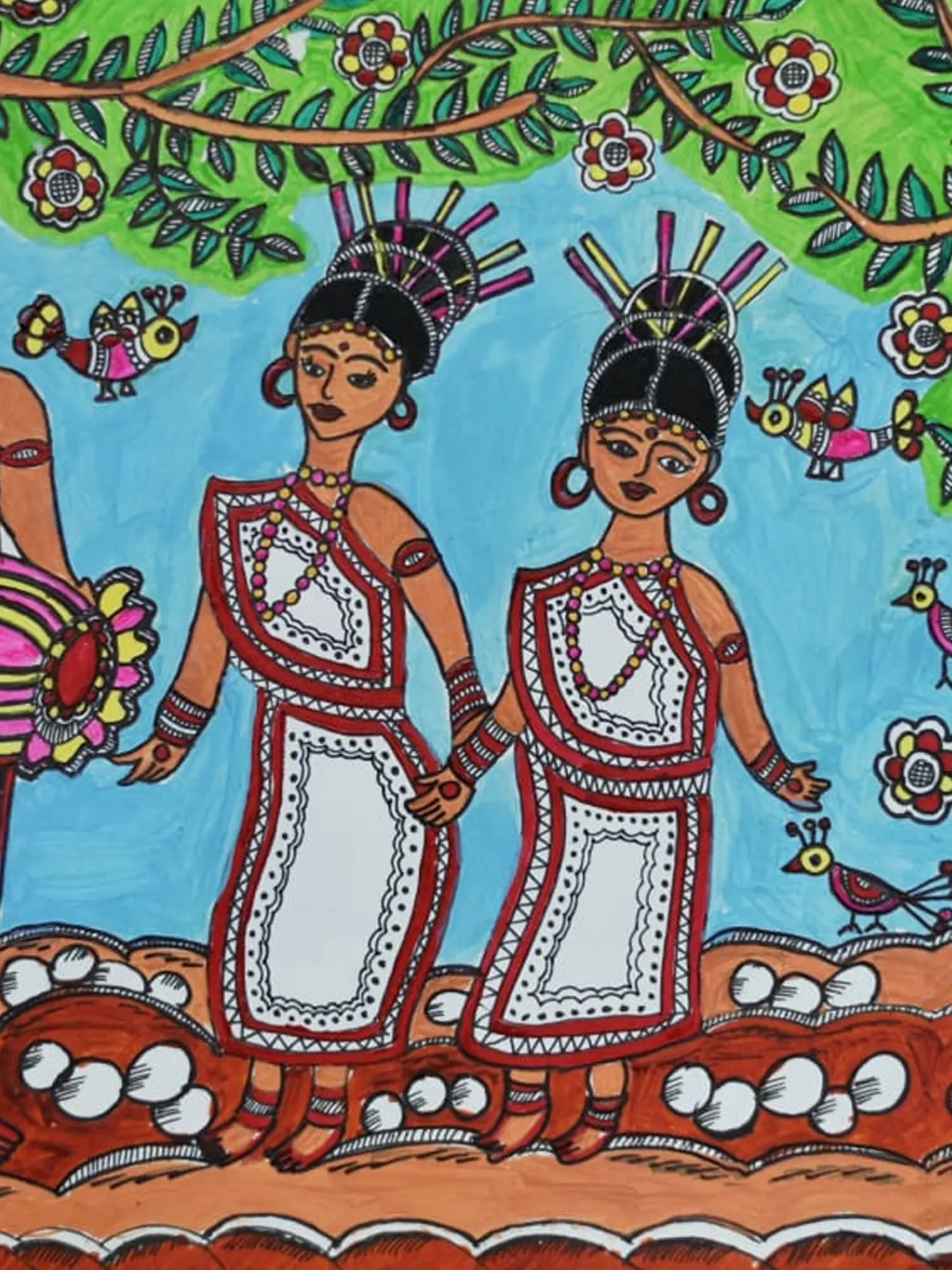 The background comes alive with exquisite depictions of birds, trees, and flowers, encapsulating the cultural richness and connection to nature inherent in the Sarhul Festival. The artist's meticulous detailing and use of traditional Madhubani elements create a visually stunning tableau that celebrates the spirit of this tribal celebration with timeless elegance.