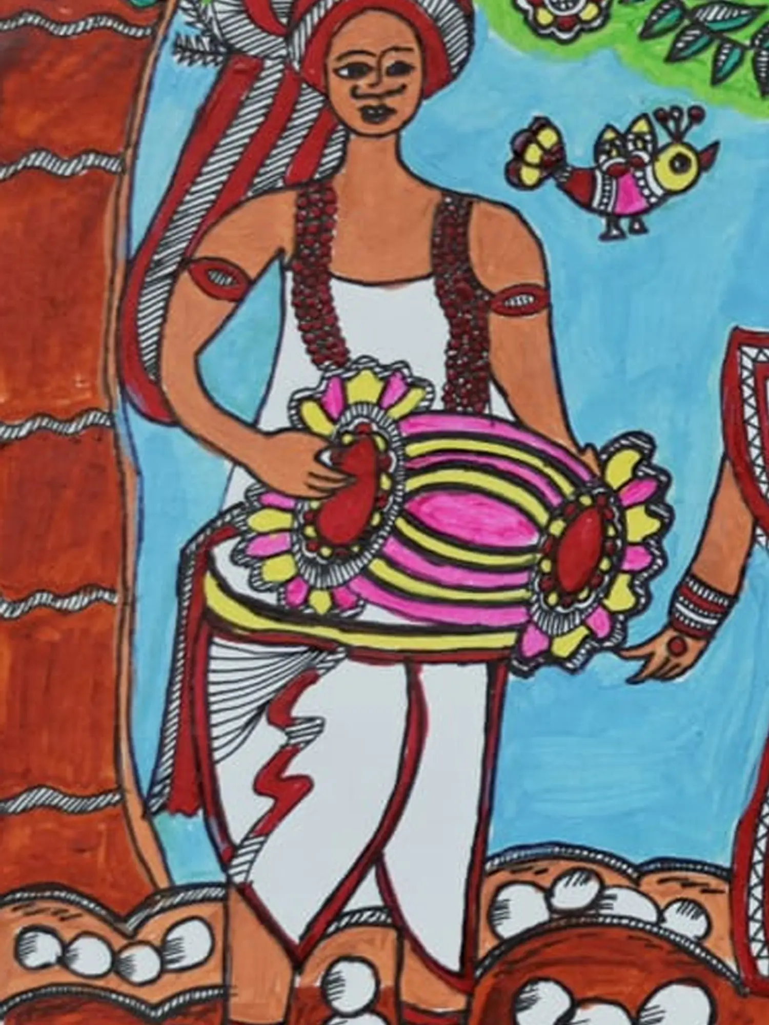 This captivating Color and Pen on Watercolor Paper intricately captures the essence of the Sarhul Festival through the lens of Madhubani art. The vibrant scene unfolds with a man joyously playing the Dhol, setting the rhythmic tone for celebration. Two women, adorned in tribal attire, gracefully dance in harmony with the festivities.