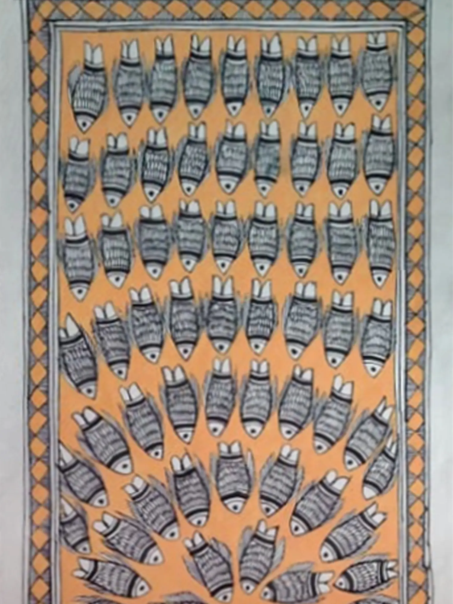 Archana Jha's Madhubani painting, crafted with natural colors on handmade paper, captures the enchanting beauty of a school of fish. Employing the traditional Madhubani pattern, the artwork unfolds on a pastel orange background, creating a harmonious and soothing visual contrast. The intricate black and white depictions of the fishes within the Madhubani style showcase Jha's mastery of this ancient art form.