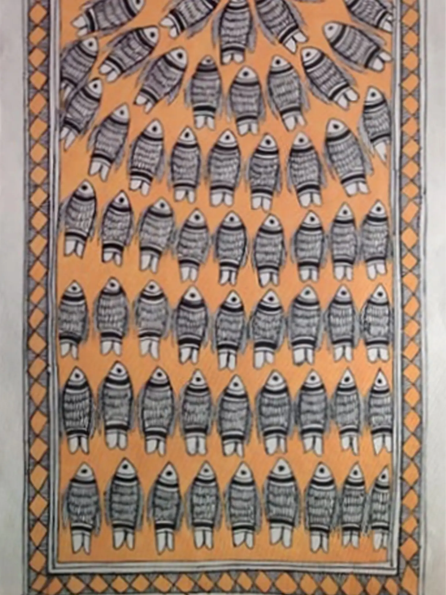 The marriage of vibrant hues, traditional patterns, and the portrayal of aquatic life results in a captivating piece that not only celebrates the cultural heritage of Madhubani but also brings the dynamic energy of a fish school to life on the canvas.