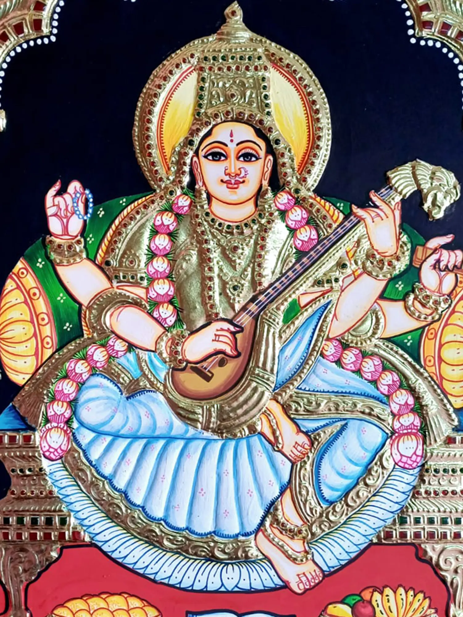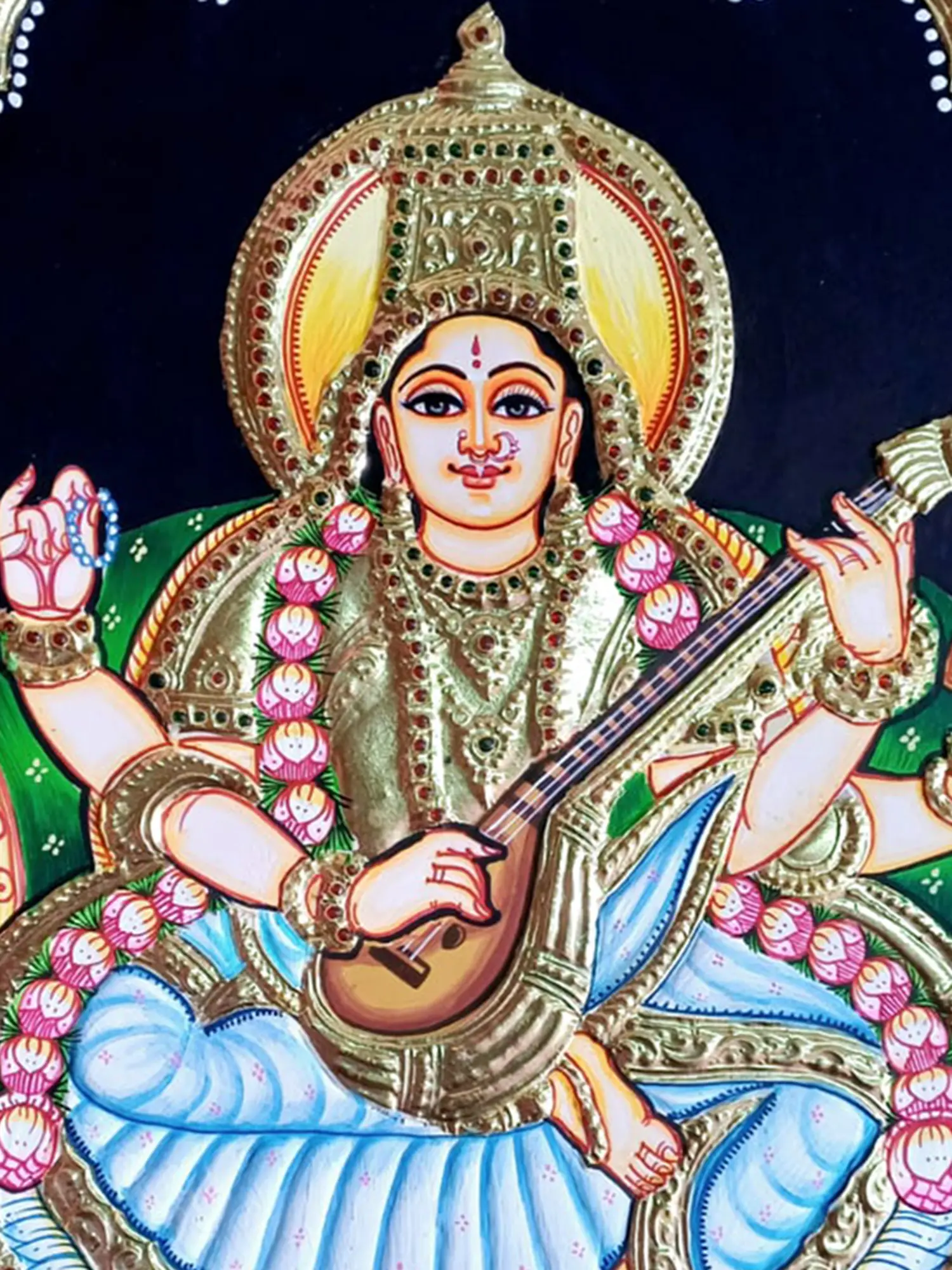 In this Tanjore painting, Devi Saraswati, the Hindu goddess of wisdom, is depicted as a divine queen, holding the Veena in her hands.
