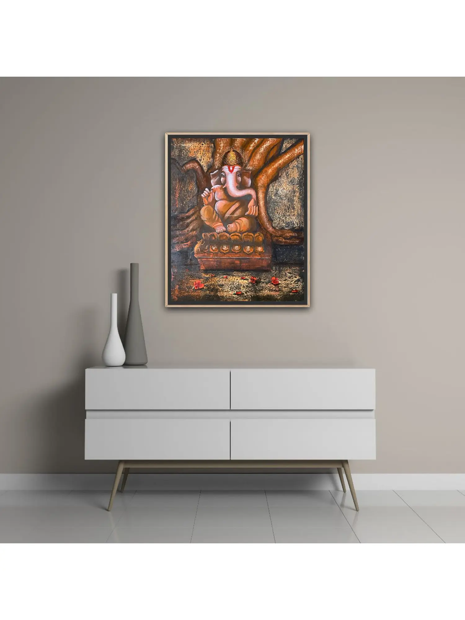 This artwork draws inspiration from the revered Hindu deity known as the remover of obstacles and the patron of arts and sciences. Its depiction is steeped in rich cultural traditions, symbolizing prosperity, good fortune, and wisdom. You'll find resonance with the enduring legacy and spiritual significance that this figure holds within ancient narratives and contemporary devotion.