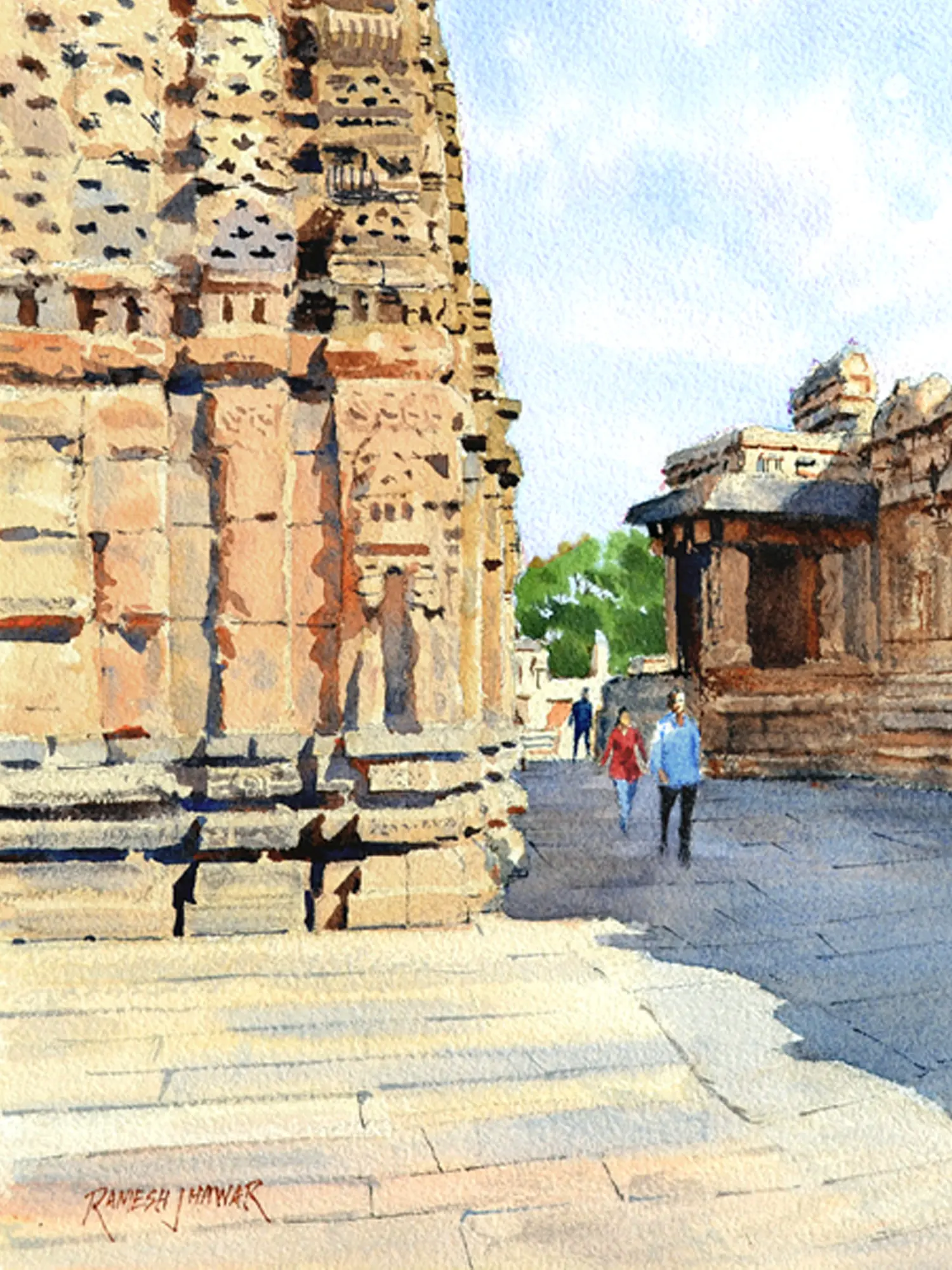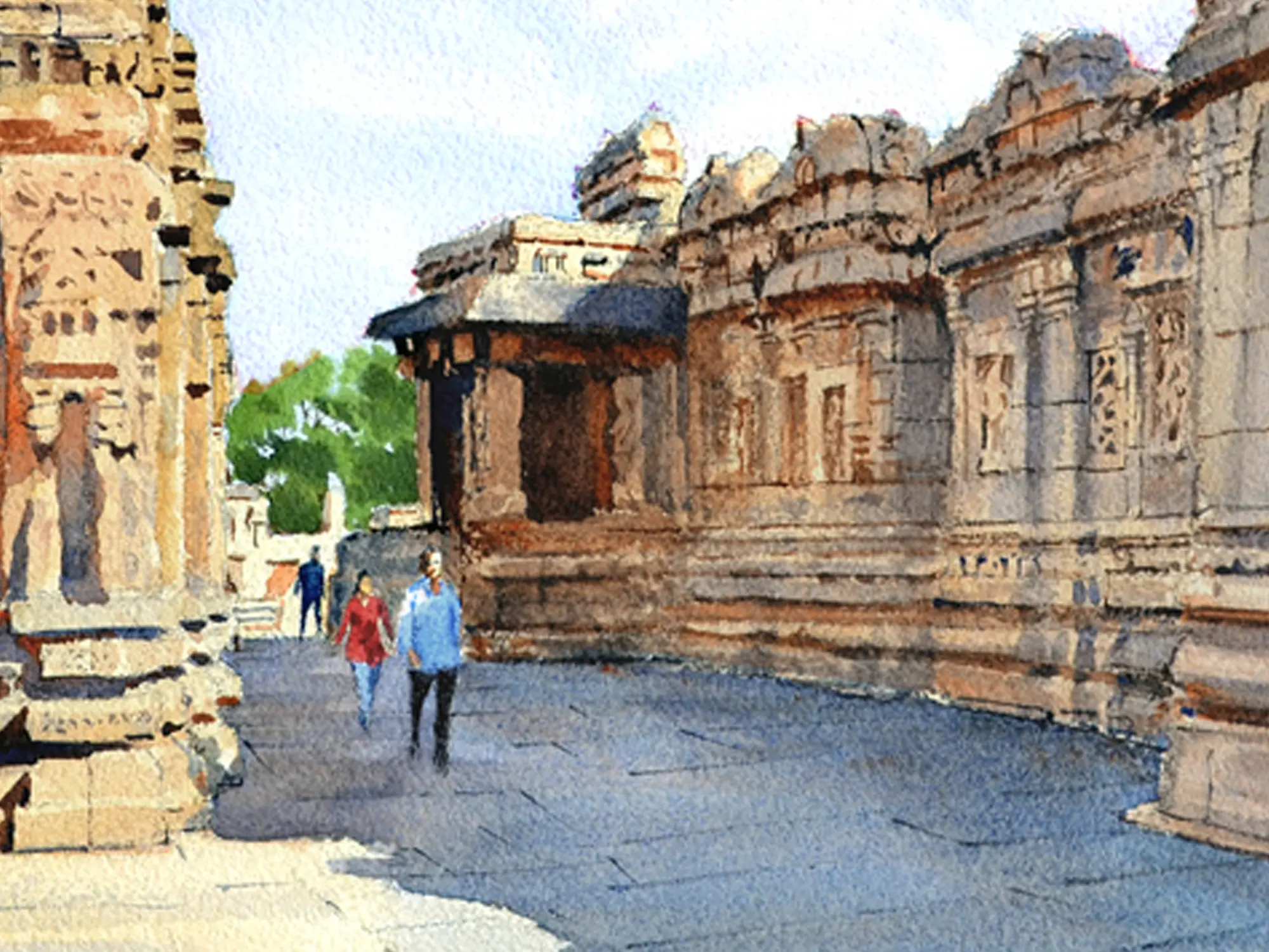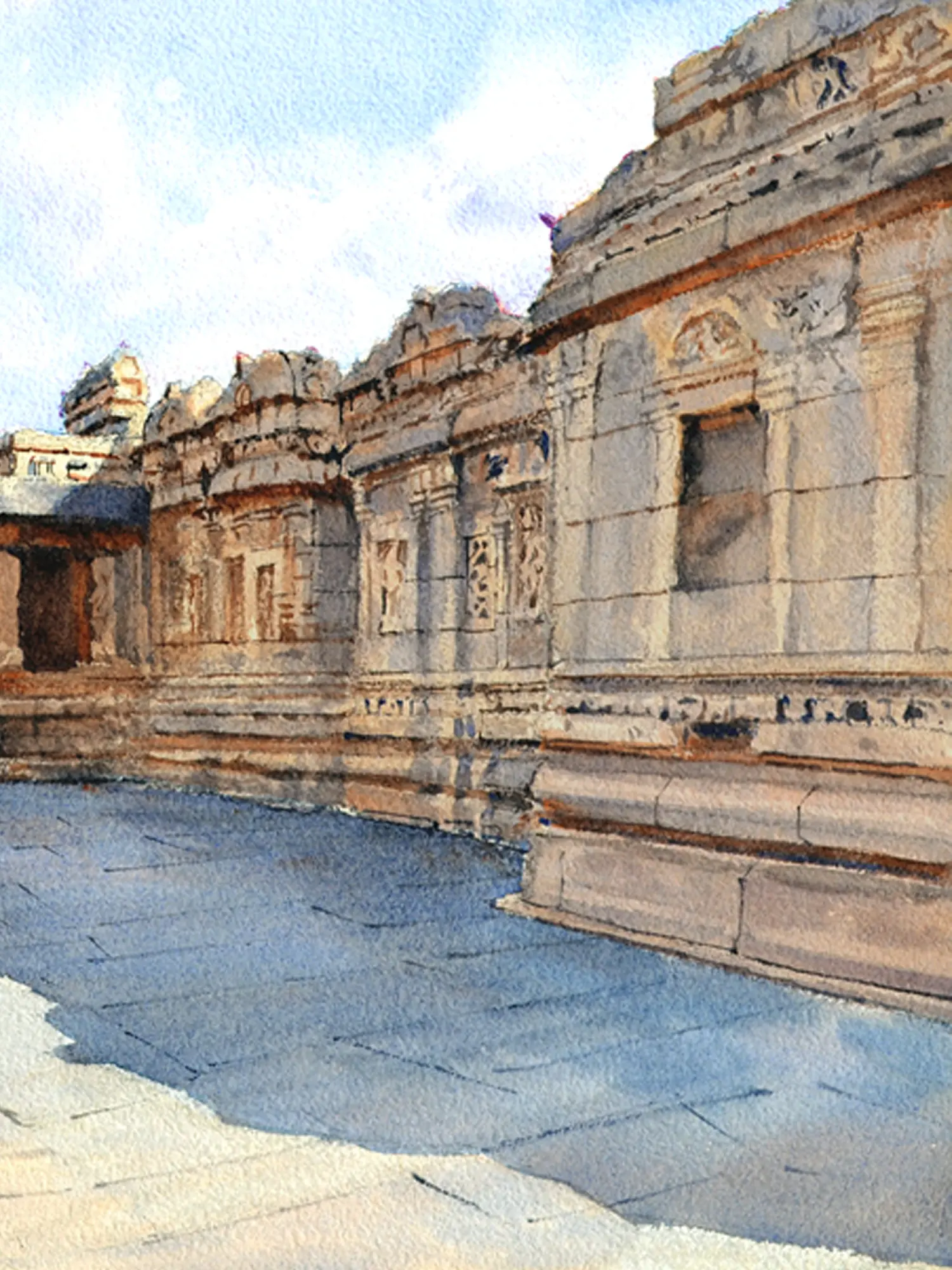 The artist has masterfully conveyed the weathered grandeur of the temple's facade and the serene expanse of its courtyard. Observe how the soft washes of color suggest the warmth of the sun on stone, while the precise rendering of architectural details offers a compelling sense of scale. Measuring 12.00 inches in height and 16.00 inches in width, the composition draws the viewer into the scene, allowing for a deep appreciation of its contemplative atmosphere.