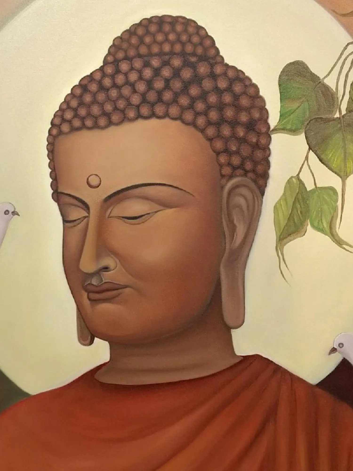 The canvas presents a captivating portrait, centered around the serene visage of Lord Buddha, radiating an aura of deep wisdom and compassion. Flanking this enlightened figure are two doves, their pure white plumage rendered with delicate precision, symbolizing peace and the universal spirit. Above, the iconic Bodhi tree leaves gently frame the scene, hinting at the site of Buddha's enlightenment. The subtle halo behind Buddha’s head illuminates his tranquil expression, drawing the viewer into a moment of profound stillness.