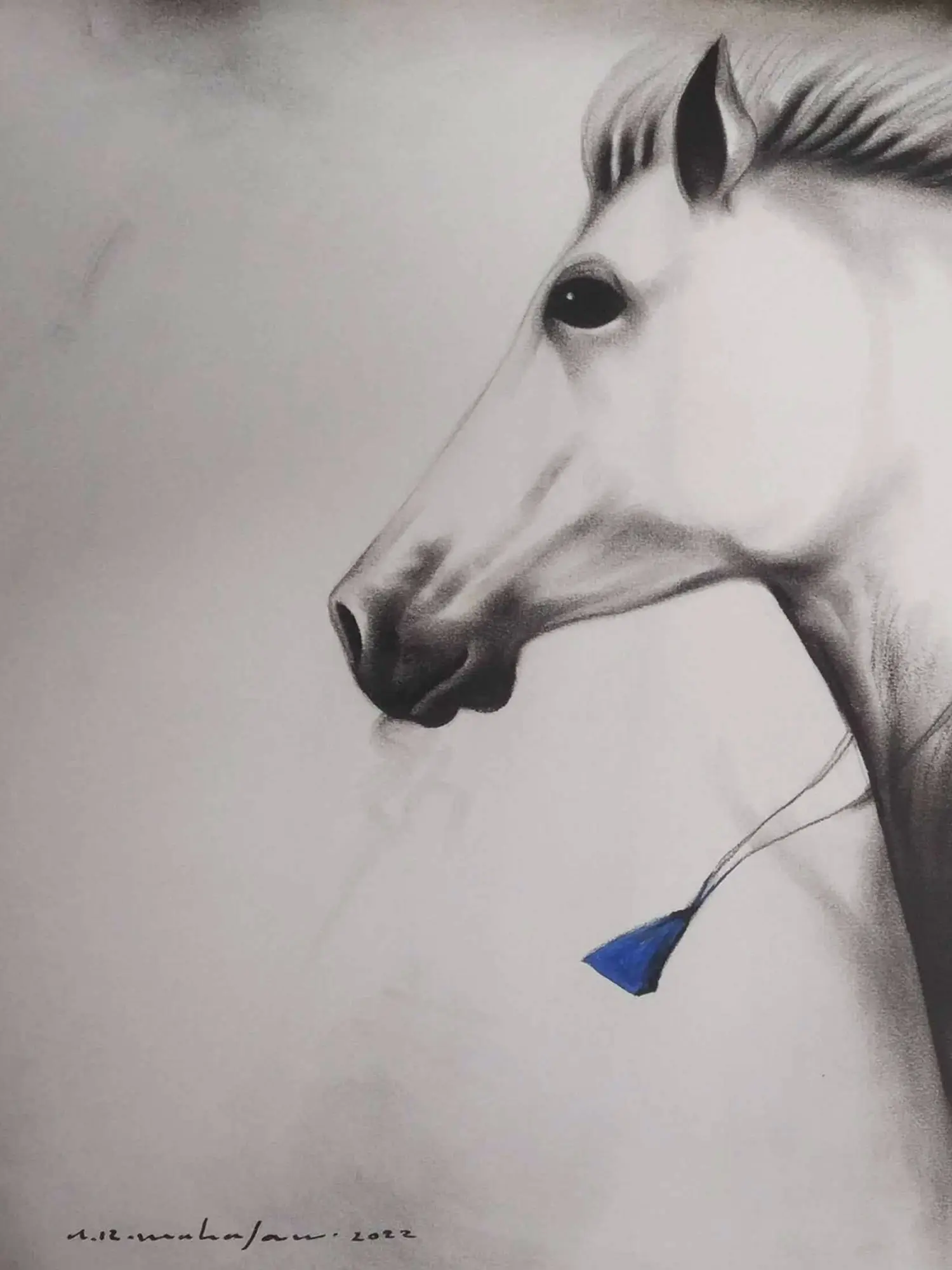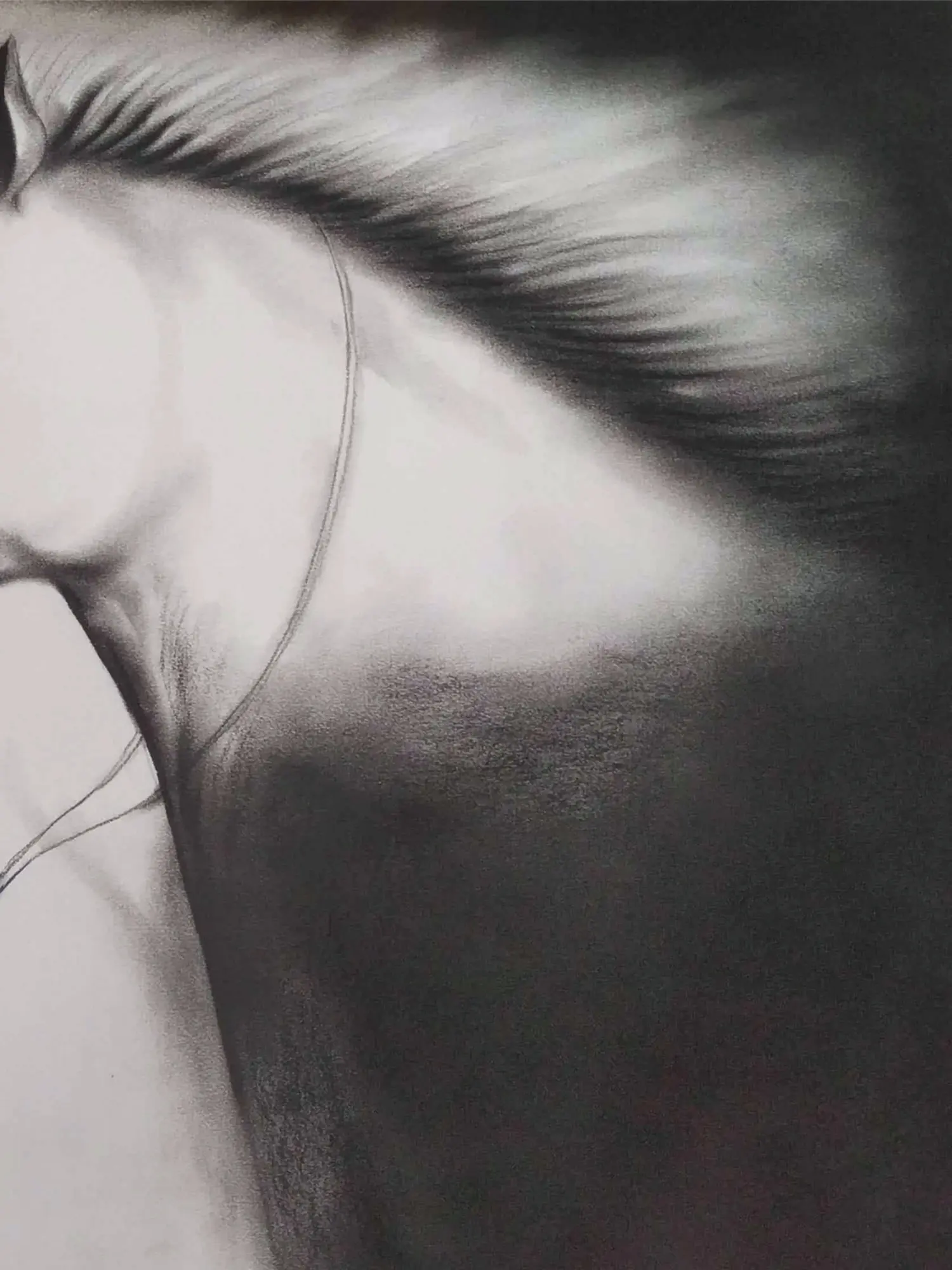 "Sharp Glance" is an arresting horse painting rendered with charcoal on paper, capturing the essence of equine grace and strength. The artist's skilled use of charcoal brings forth a level of detail and texture that elevates the portrayal of the horse's powerful gaze. Each stroke on the paper serves as a testament to the raw beauty and majesty inherent in the subject.