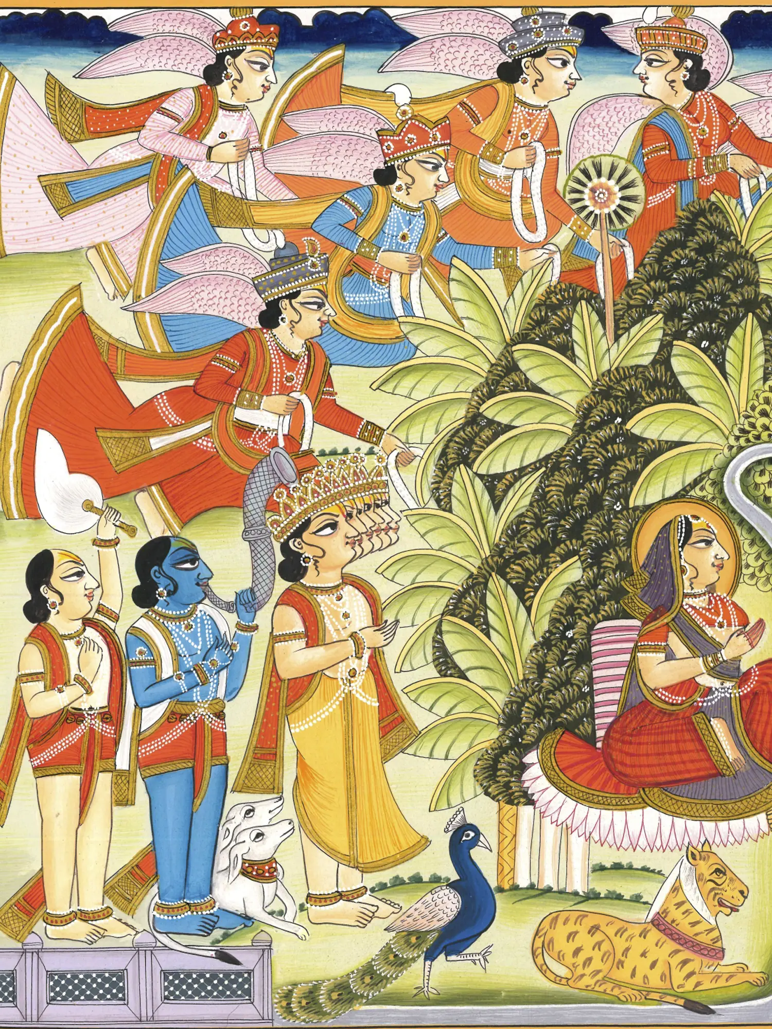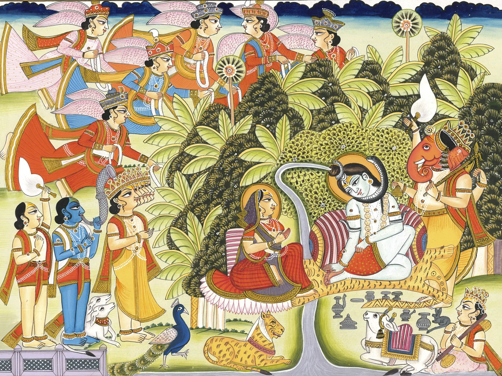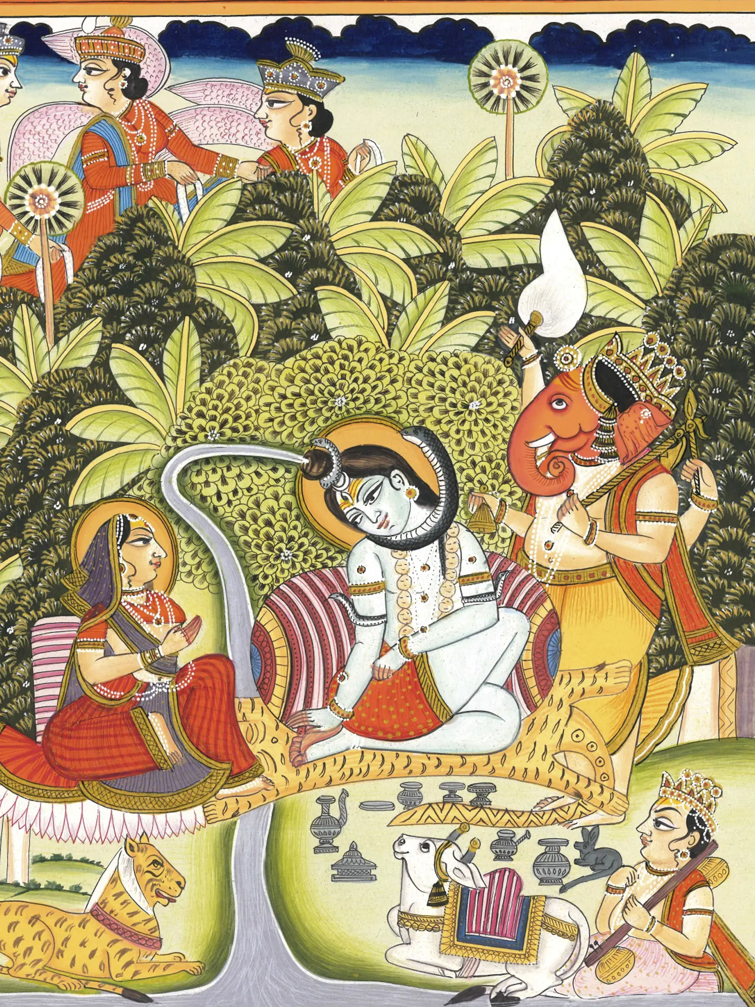 Nandi and Devi’s tiger sit guarding the sacred space, along with Narada, Mushaka (Ganesha’s mount), Ganesha with a fly whisk, Mayura and Shadamukha (six-headed) Karttikeya, and Bhairava with his dogs. On the horizon, heavenly beings fly with garlands, approaching the snowy court of Shiva, where Mahadeva and Mahadevi reside, exuding auspiciousness and nourishing all beings.