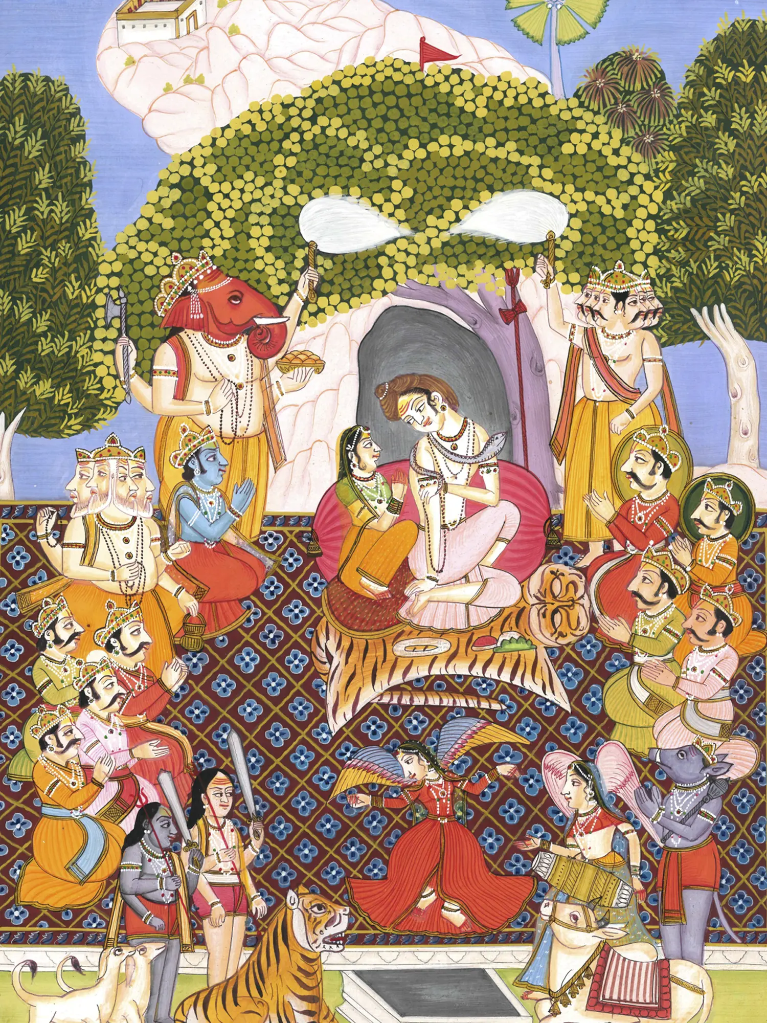 Immerse yourself in a scene of divine serenity and cosmic grandeur. This exquisite artwork captures a pivotal moment, inviting you to witness the majestic presence of deities amidst the awe-inspiring peaks of Mount Kailasha. You'll be drawn into its narrative, feeling the spiritual energy and artistic devotion that emanates from every brushstroke.