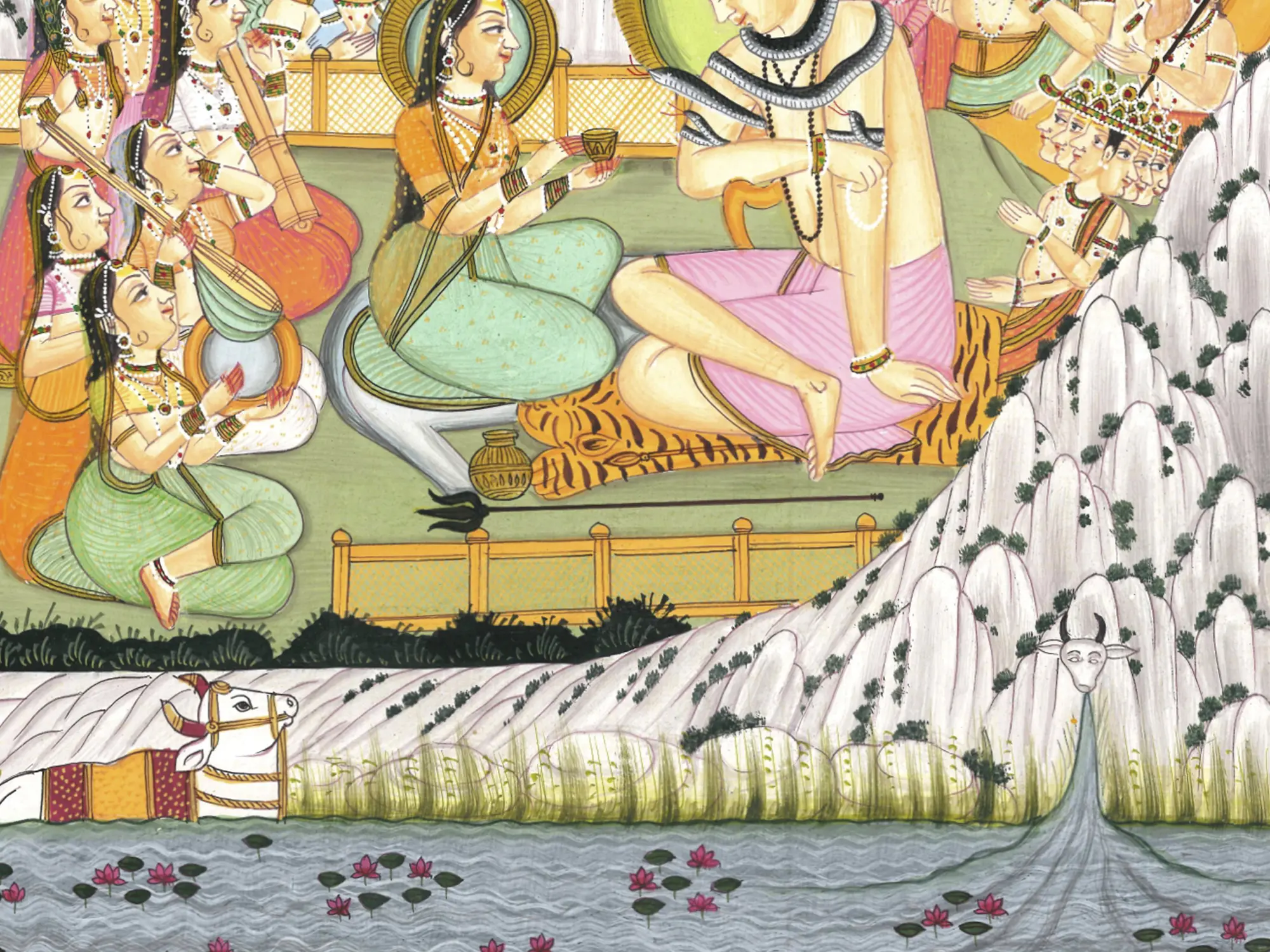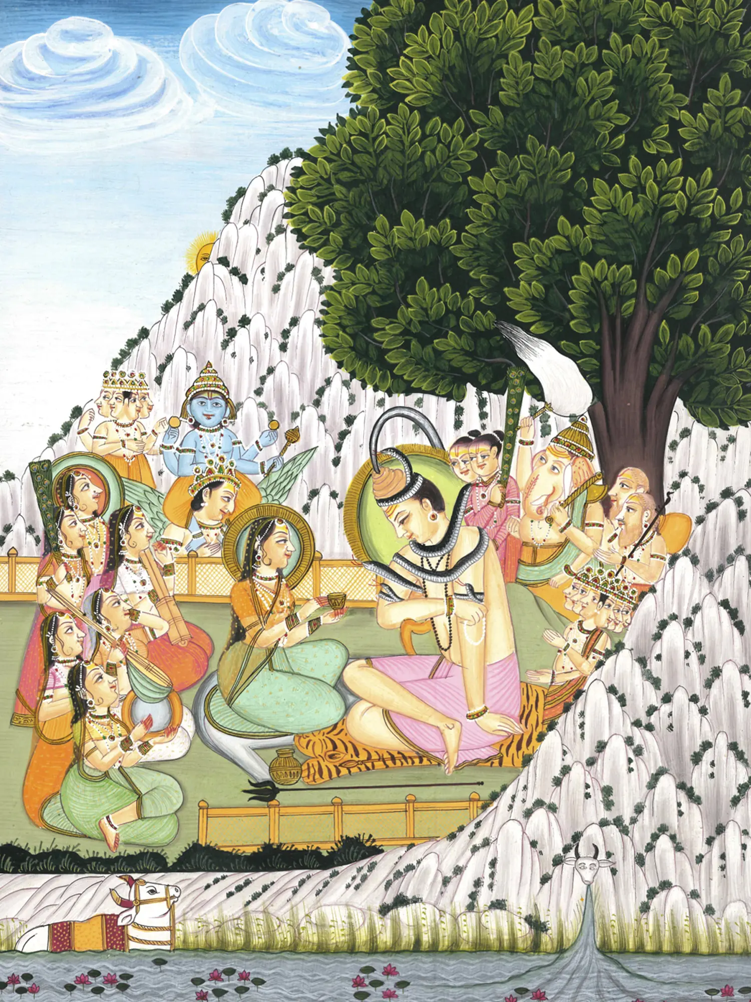 The foreground of the painting is marked by the presence of Nandi, and the sacred river Ganga, emerging from Gomukha (literally, cow’s mouth) depicted astutely in the lower right section of the artwork. A traditional floral border surrounds the scene, giving it the beauty of classic Rajput miniatures.