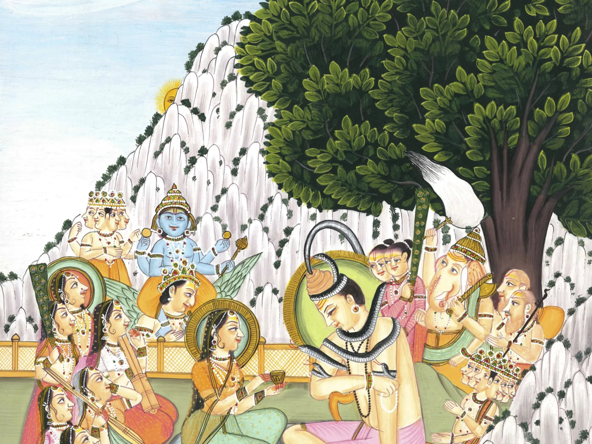 On the side of Parvati are various goddesses playing musical instruments, singing the praises of Shiva and Parvati. Near the towering Kailasha mount are Brahma and Vishnu mounted on Garuda and in the background is the Sun or Suryadeva, peeking from behind the mountain to gaze at this heavenly scene.
