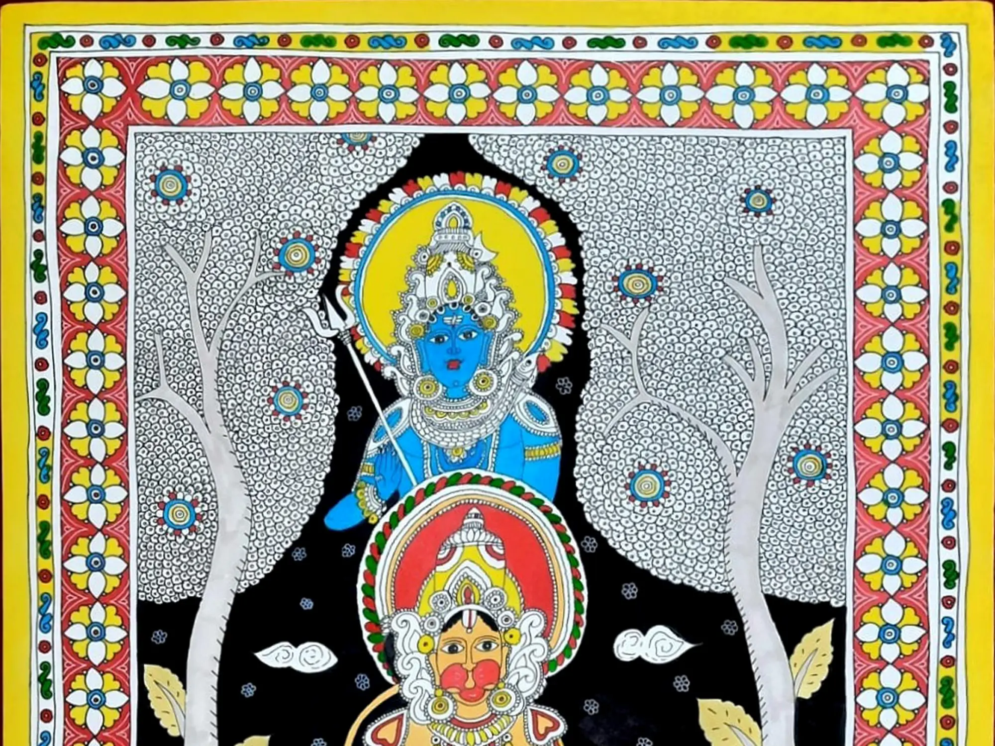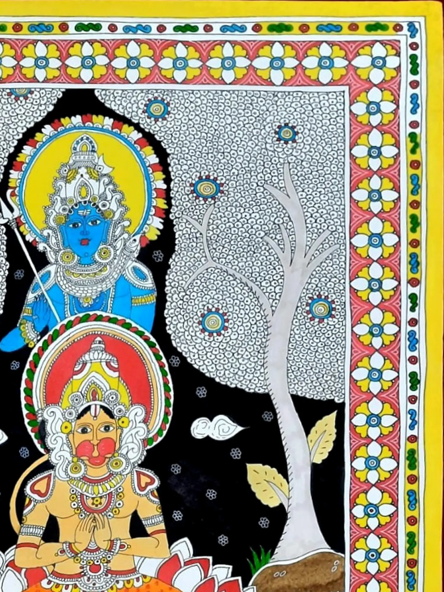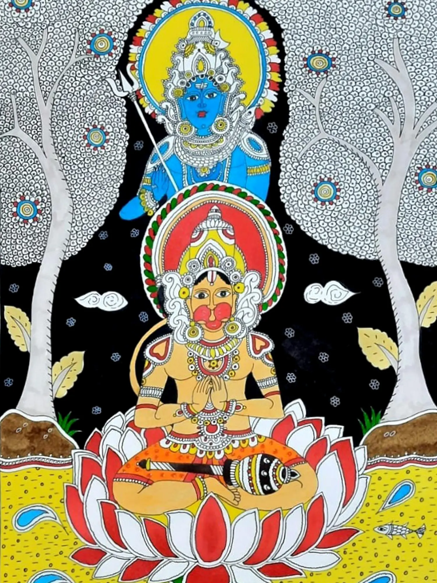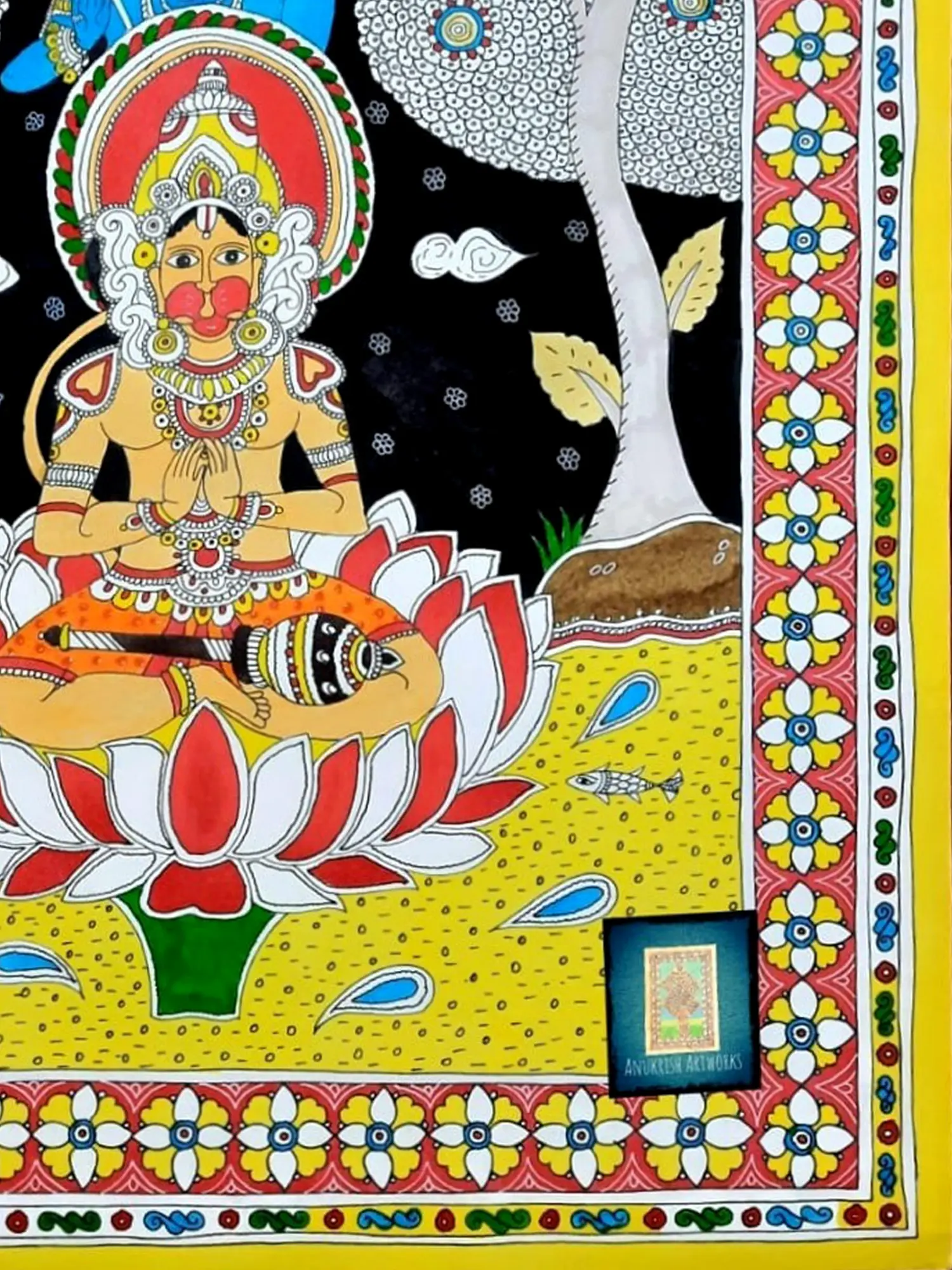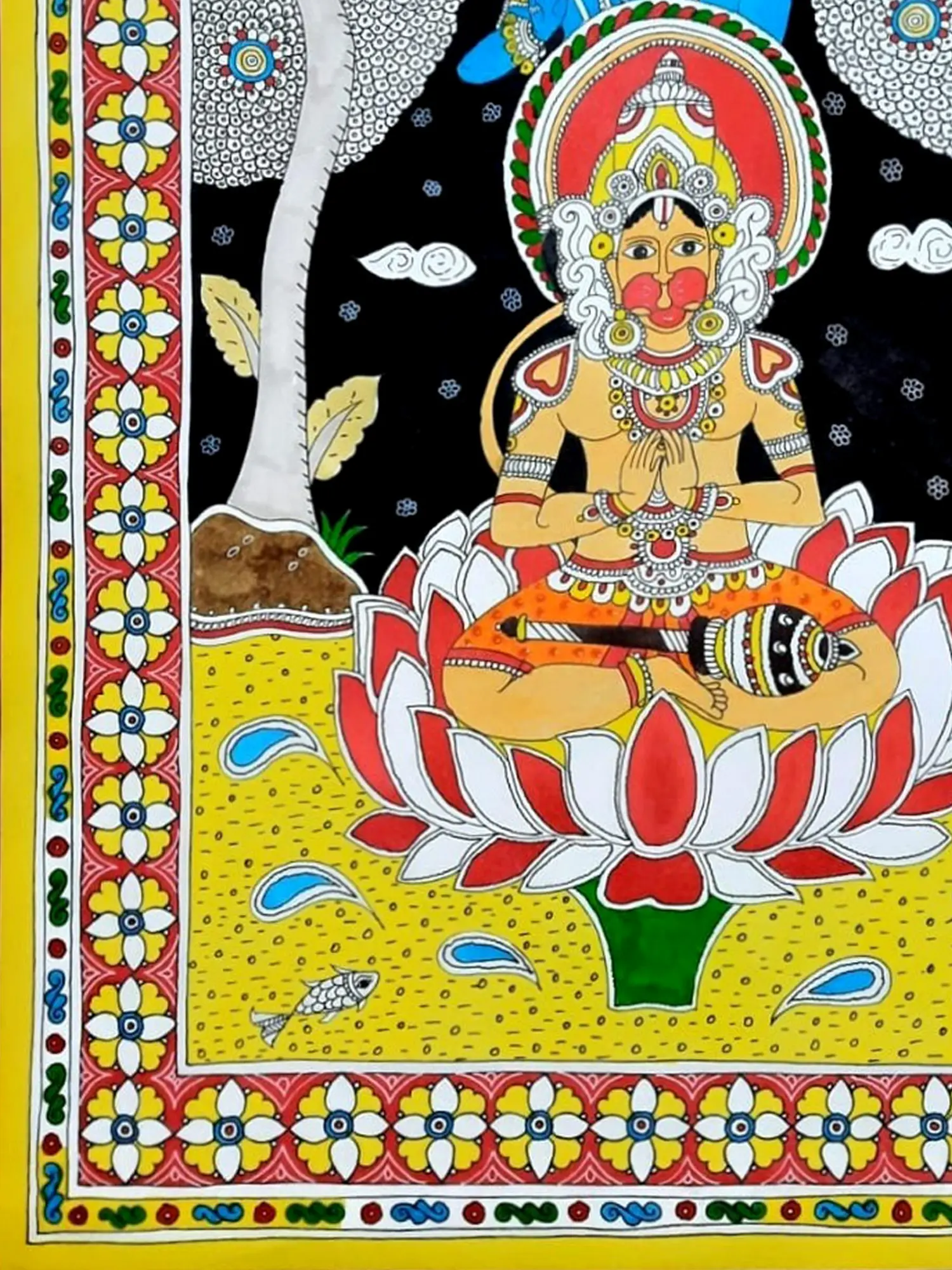 Observe how the dynamic composition unfolds, drawing your eye through the rich symbolism. The vibrant yellow background, punctuated by delicate patterns and playful fish, contrasts with the stark black of the nocturnal sky behind the figures. The central lotus, a symbol of purity and enlightenment, cradles Hanuman in a posture of humble reverence, while Lord Rama presides from above, his serene blue form radiating divine grace. The intricate floral borders further enhance the piece, framing the narrative with traditional motifs.