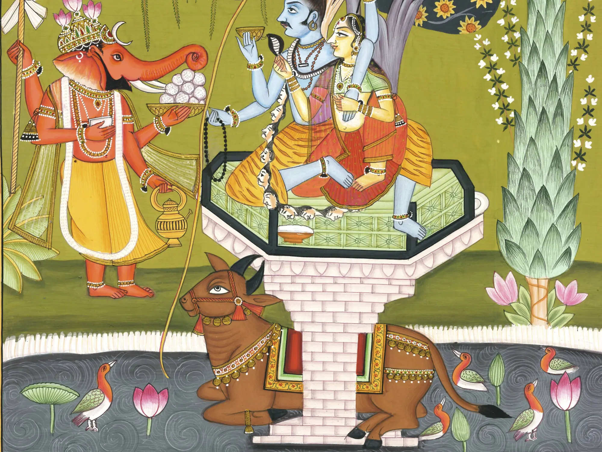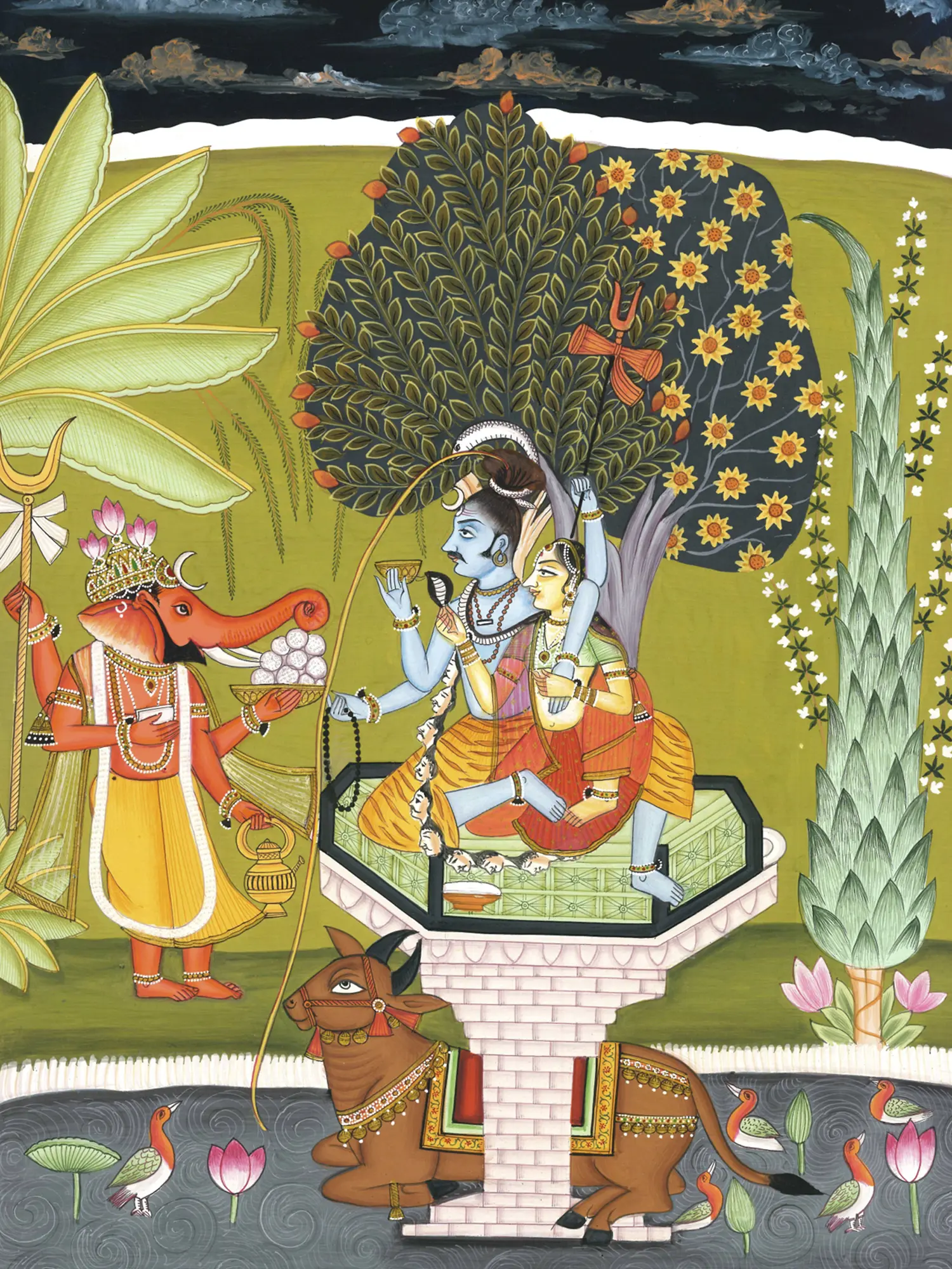 The auspicious son of Shiva-Parvati, revering his powerful parents, this watercolor painting depicts a divine scene of Kailash, the abode of Mahadeva, in the idiom of Mewar school of Rajput painting. Against a blooming background of trees, floral vines, and lush hilltops, Shiva and Parvati are enthroned on a marble throne, emerging from a pillar that grows from the water in the foreground. The four-armed Shiva is adorned with a golden stream of Ganga, serpents, and a garland of heads which he shares with Parvati, who sits on his lap, embracing him. Intertwined beautifully, Shiva and Parvati in this form symbolize the perfect balance of Purusha and Prakriti- the male and female energies, which form, sustain, and restart the Creation.