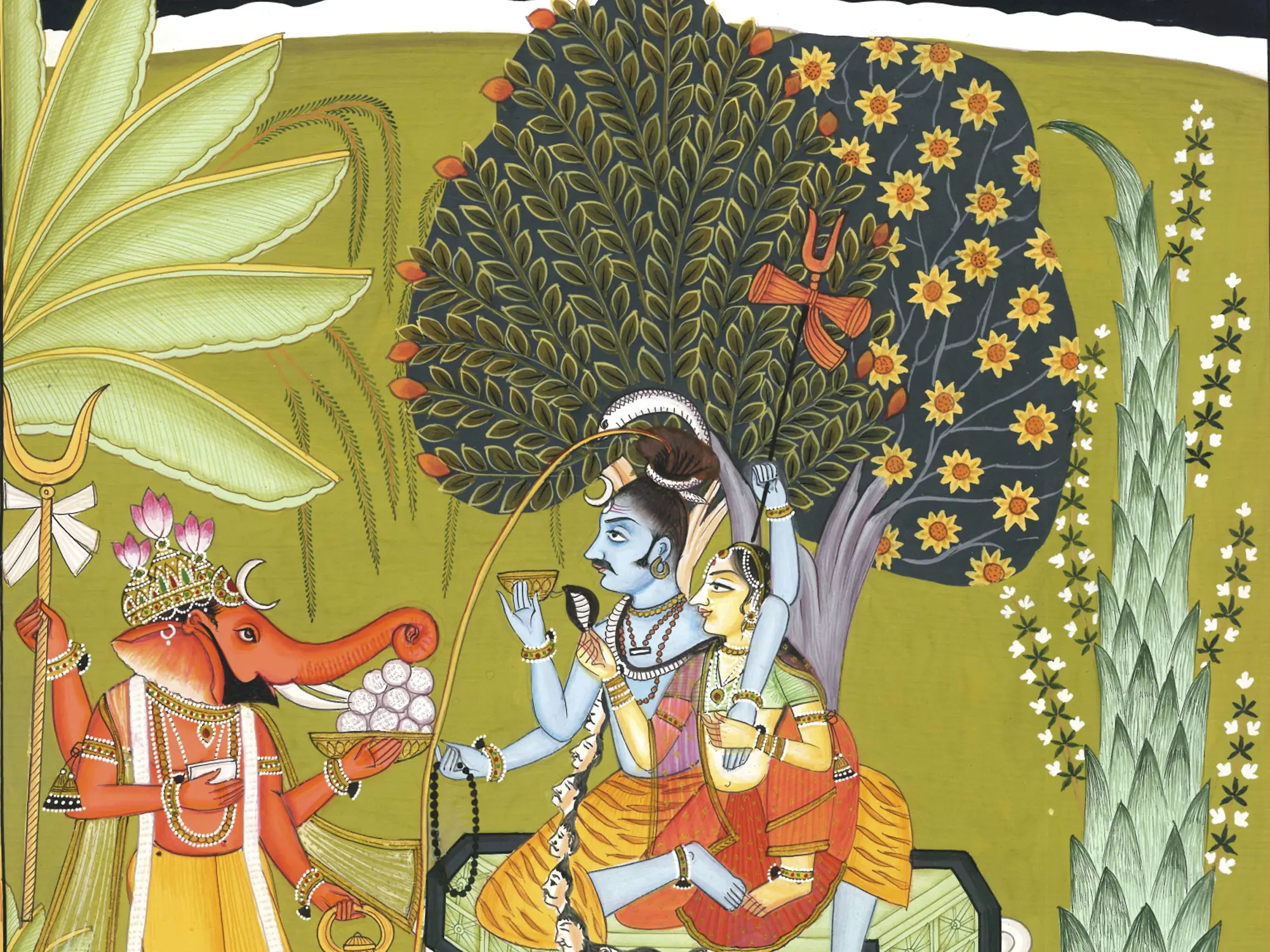 In front of the supremely divine parents of the Universe, stands Ganesha, represented as an adult man, with a beard and a well-formed body, a characteristic of Mewar school in depiction of Ganesha. Chaturbhuja or four-armed Ganesha holds a two-pronged weapon, Veda, a pot of water, and a plate of Modaka. Facing his parents in an animated pose, Ganesha seems to be offering them the sweets with reverence and affection, evoking their powers as the omnipresent Shiva-Shakti who are the seed of Srishti (creation).