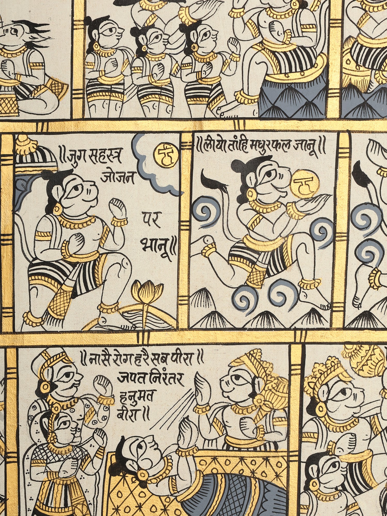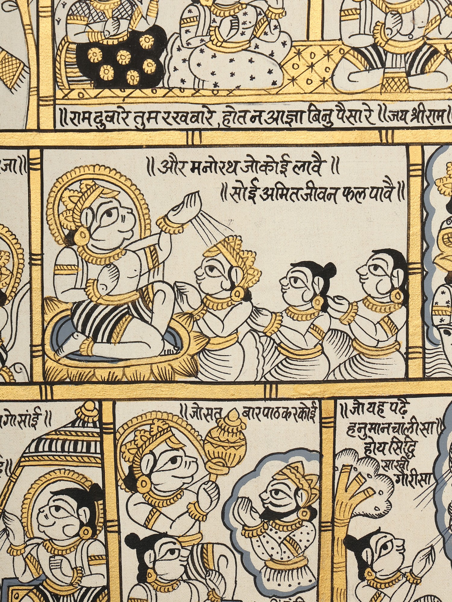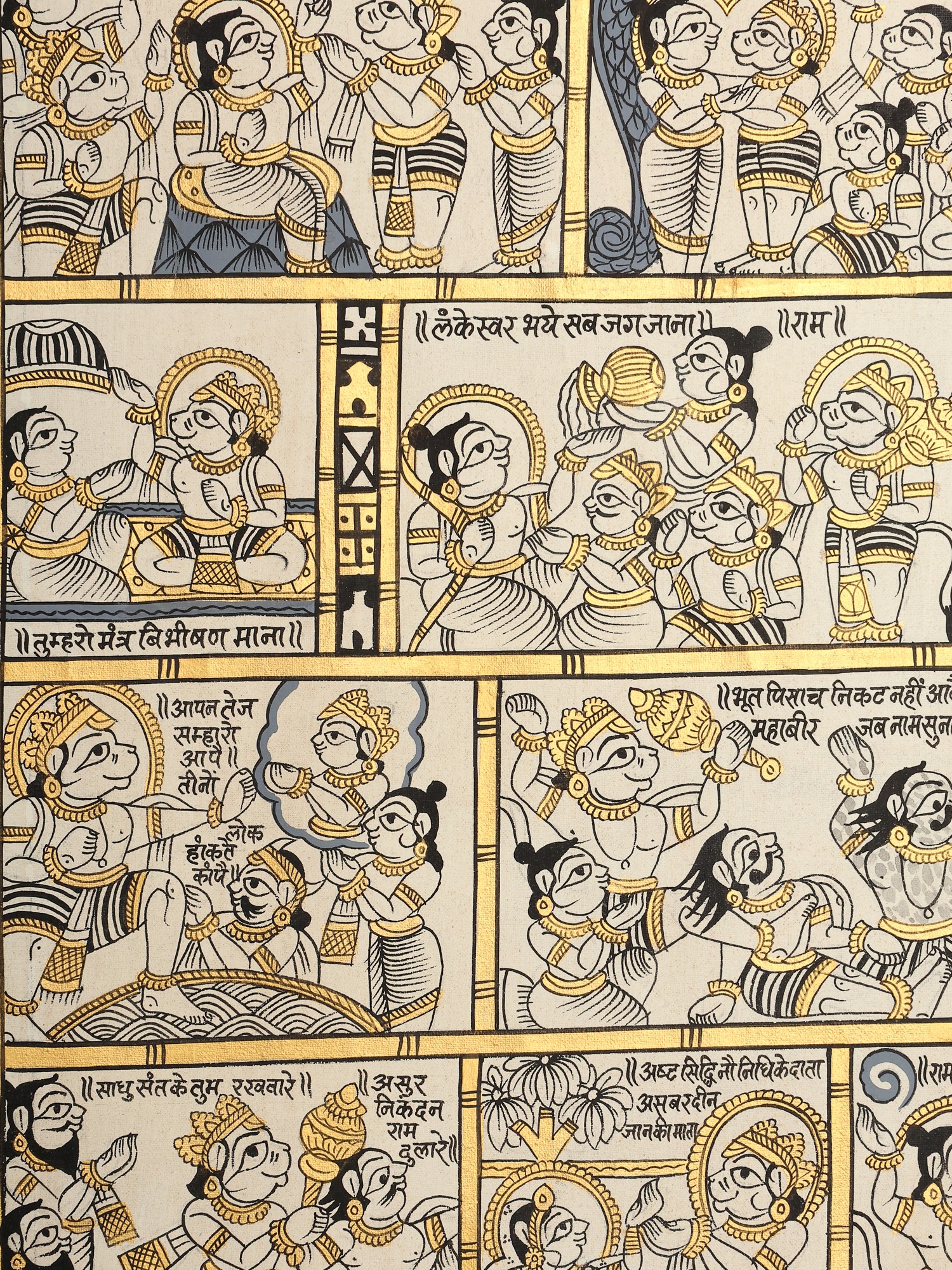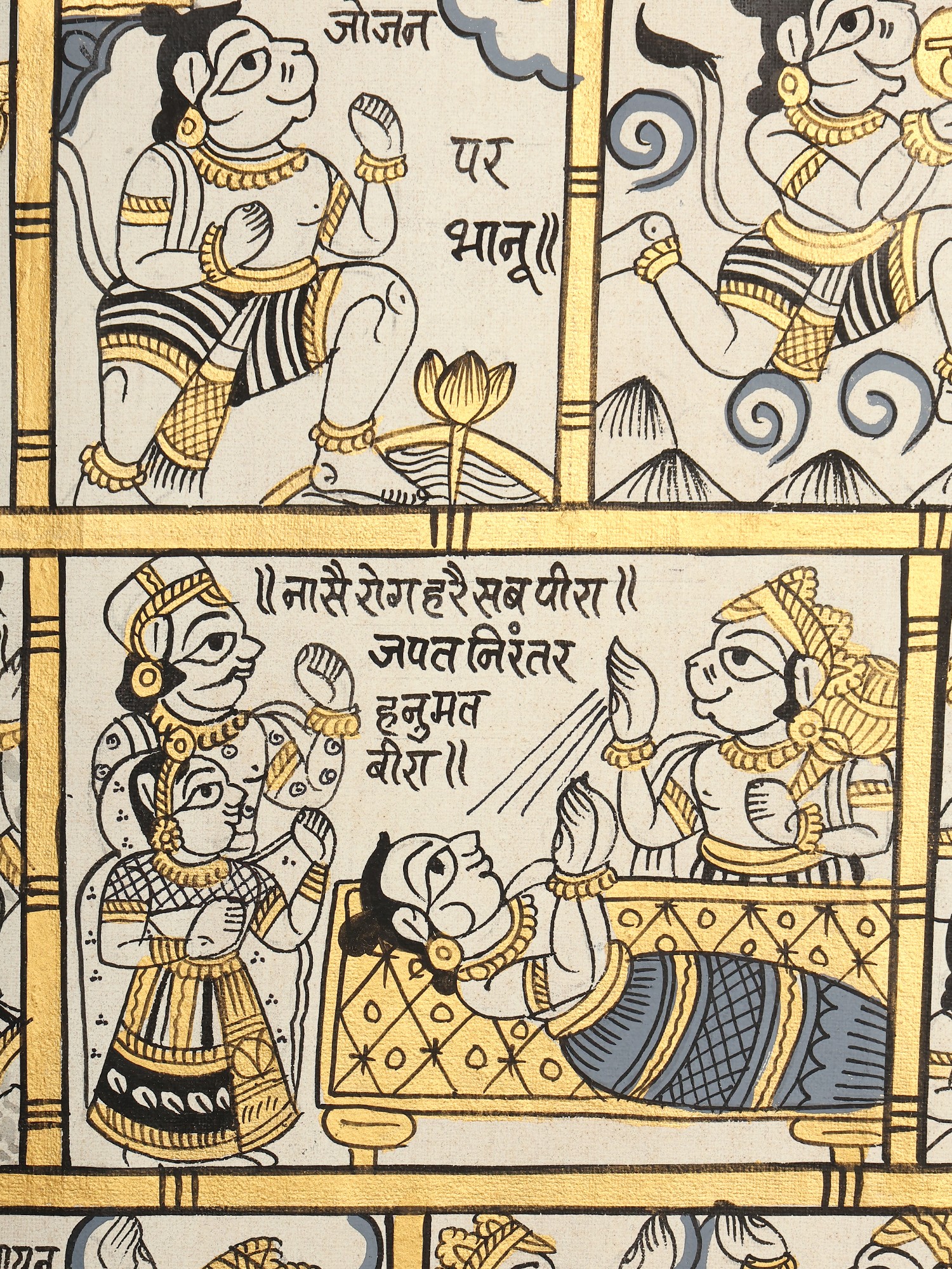 Step into a world of profound faith and epic narrative with this magnificent hand-painted rendition of the Hanuman Chalisa. More than just a decorative piece, this artwork is a visual symphony, meticulously capturing each verse of the revered devotional hymn that extols the virtues and exploits of Lord Hanuman, the steadfast devotee of Lord Rama. Each panel unfolds like a page from an ancient manuscript, inviting the viewer to embark on a visual journey through the sacred verses. The artistry employed here draws inspiration from the rich tradition of folk painting, specifically echoing the intricate storytelling and vibrant aesthetics often found in Pichhwai art. Natural colors, rendered on a cloth canvas, lend an authentic, earthy feel to the composition, imbuing it with a timeless quality. The fine brushstrokes and attention to detail bring to life a multitude of characters and scenes, from the divine birth of Hanuman to his awe-inspiring feats of strength and devotion. ––––––––––