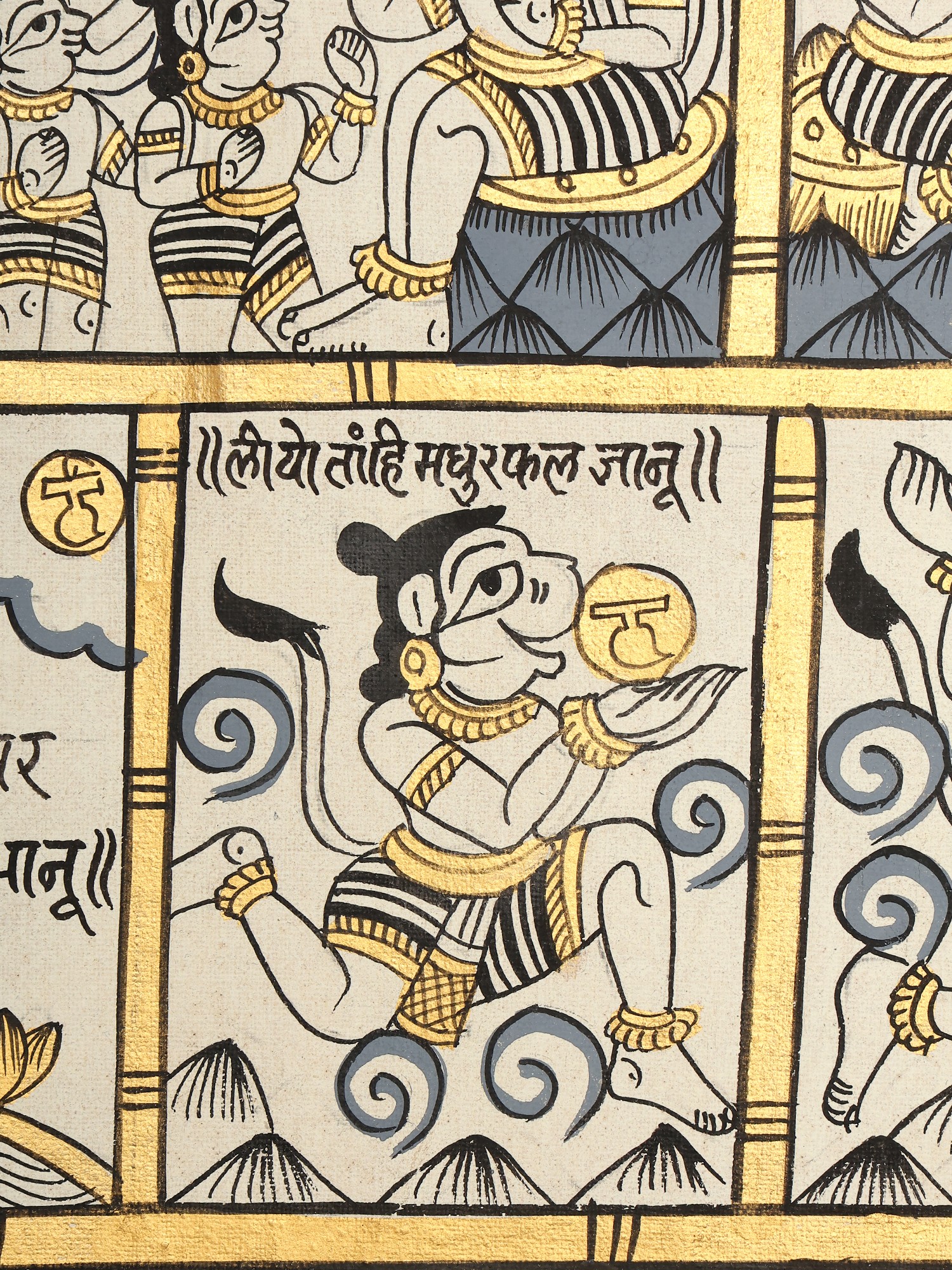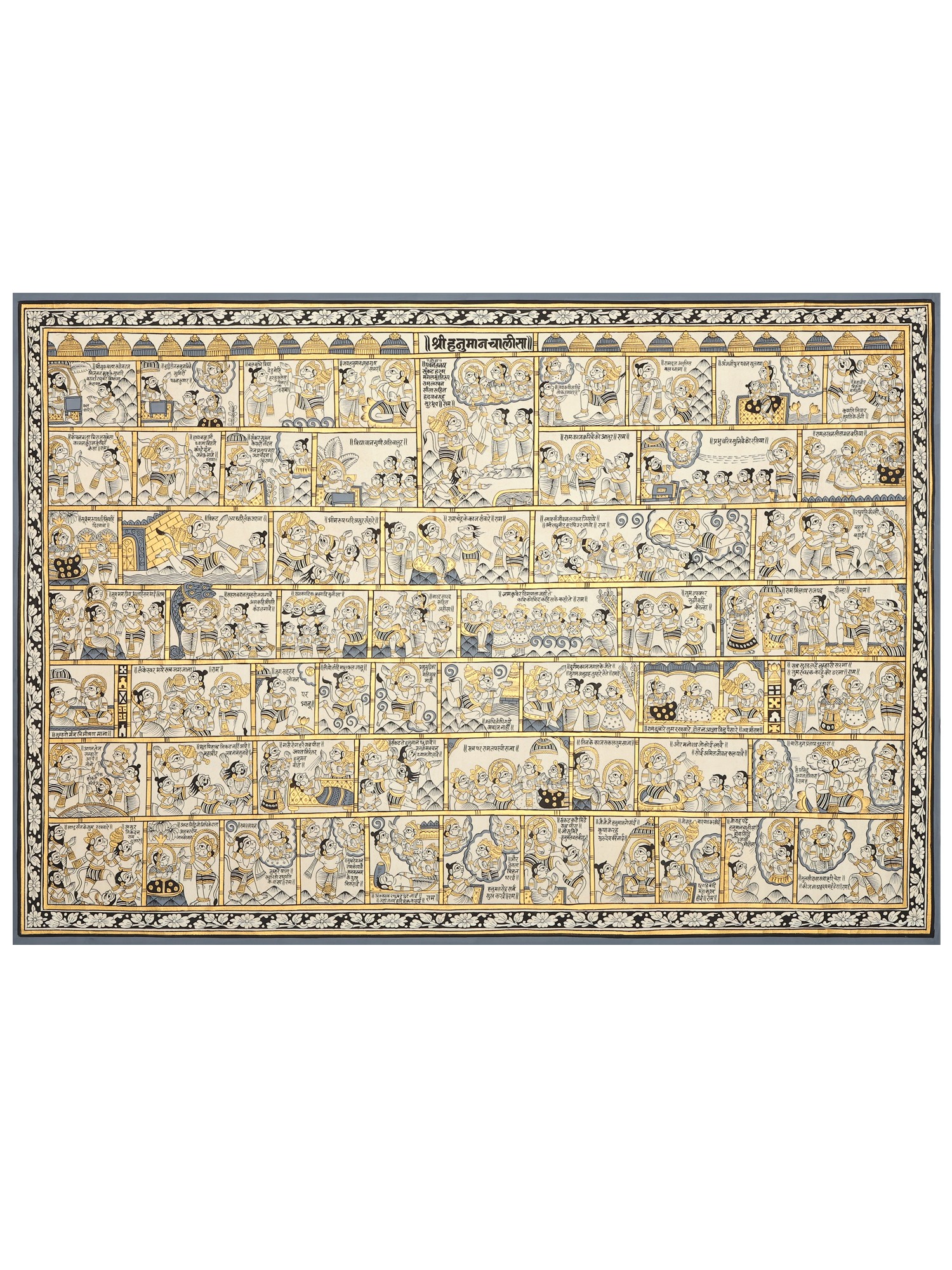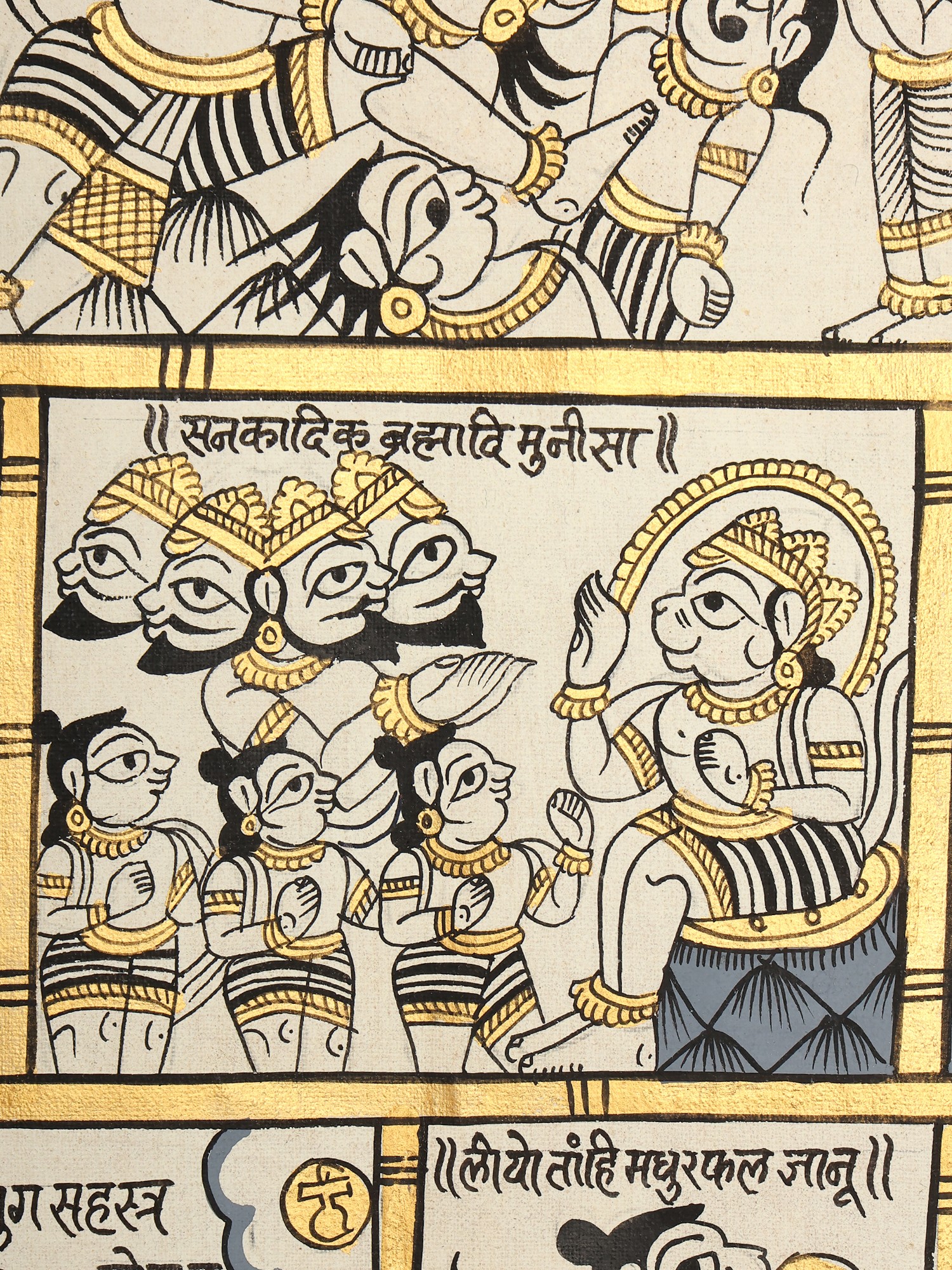 Step into a world of profound faith and epic narrative with this magnificent hand-painted rendition of the Hanuman Chalisa. More than just a decorative piece, this artwork is a visual symphony, meticulously capturing each verse of the revered devotional hymn that extols the virtues and exploits of Lord Hanuman, the steadfast devotee of Lord Rama. Each panel unfolds like a page from an ancient manuscript, inviting the viewer to embark on a visual journey through the sacred verses. The artistry employed here draws inspiration from the rich tradition of folk painting, specifically echoing the intricate storytelling and vibrant aesthetics often found in Pichhwai art. Natural colors, rendered on a cloth canvas, lend an authentic, earthy feel to the composition, imbuing it with a timeless quality. The fine brushstrokes and attention to detail bring to life a multitude of characters and scenes, from the divine birth of Hanuman to his awe-inspiring feats of strength and devotion. ––––––––––