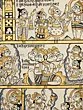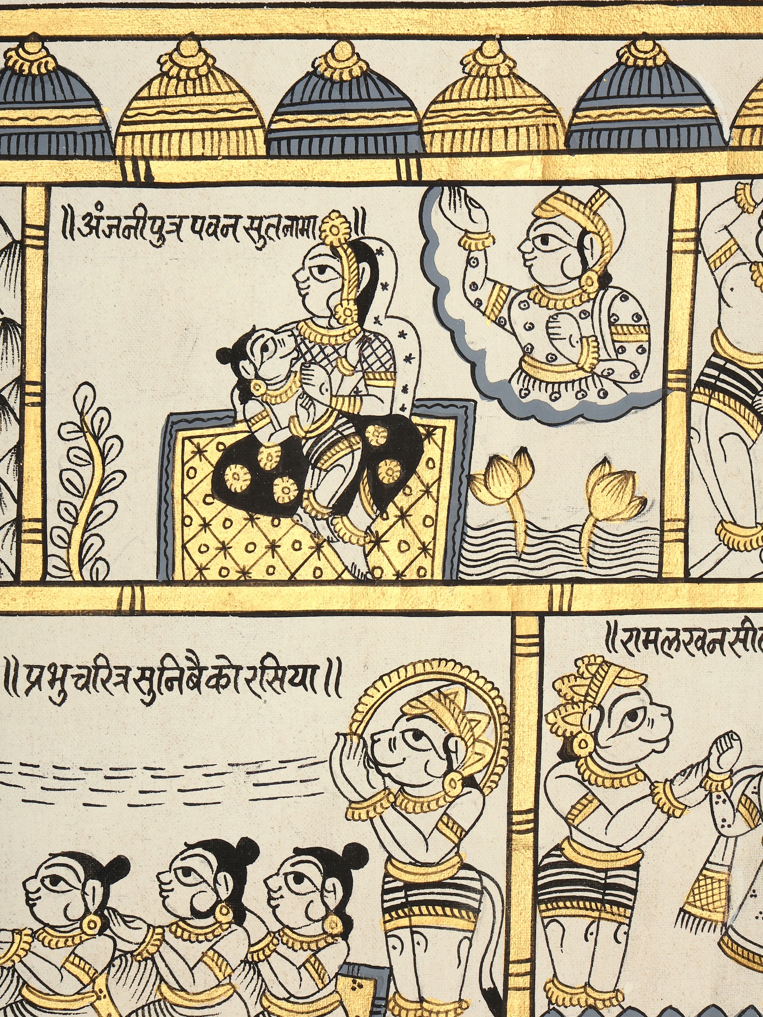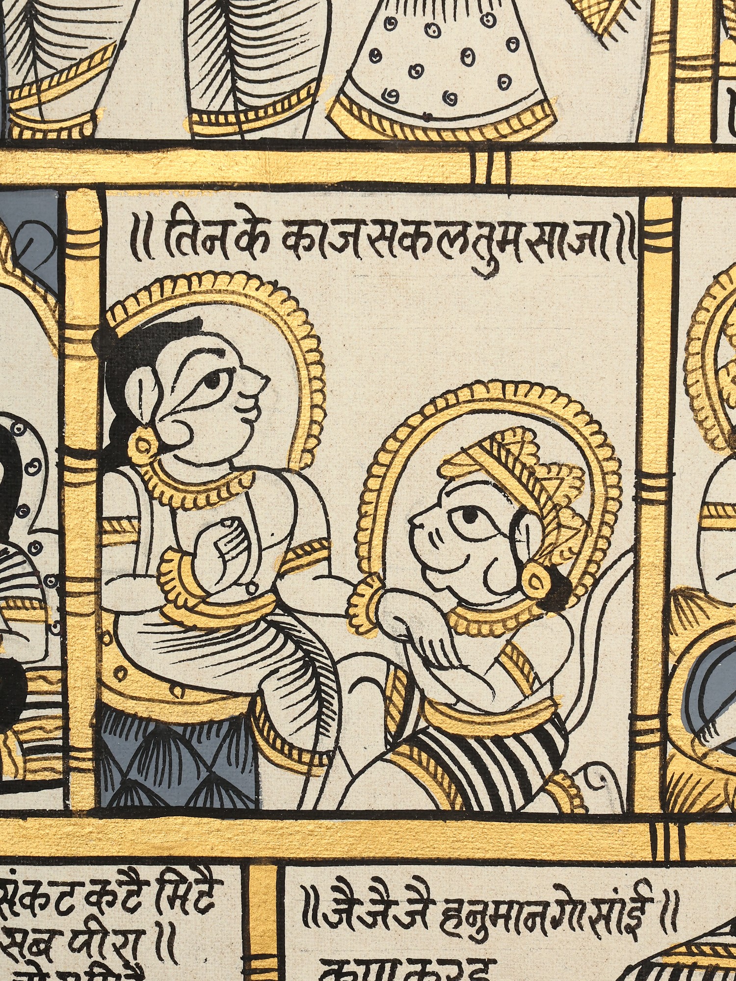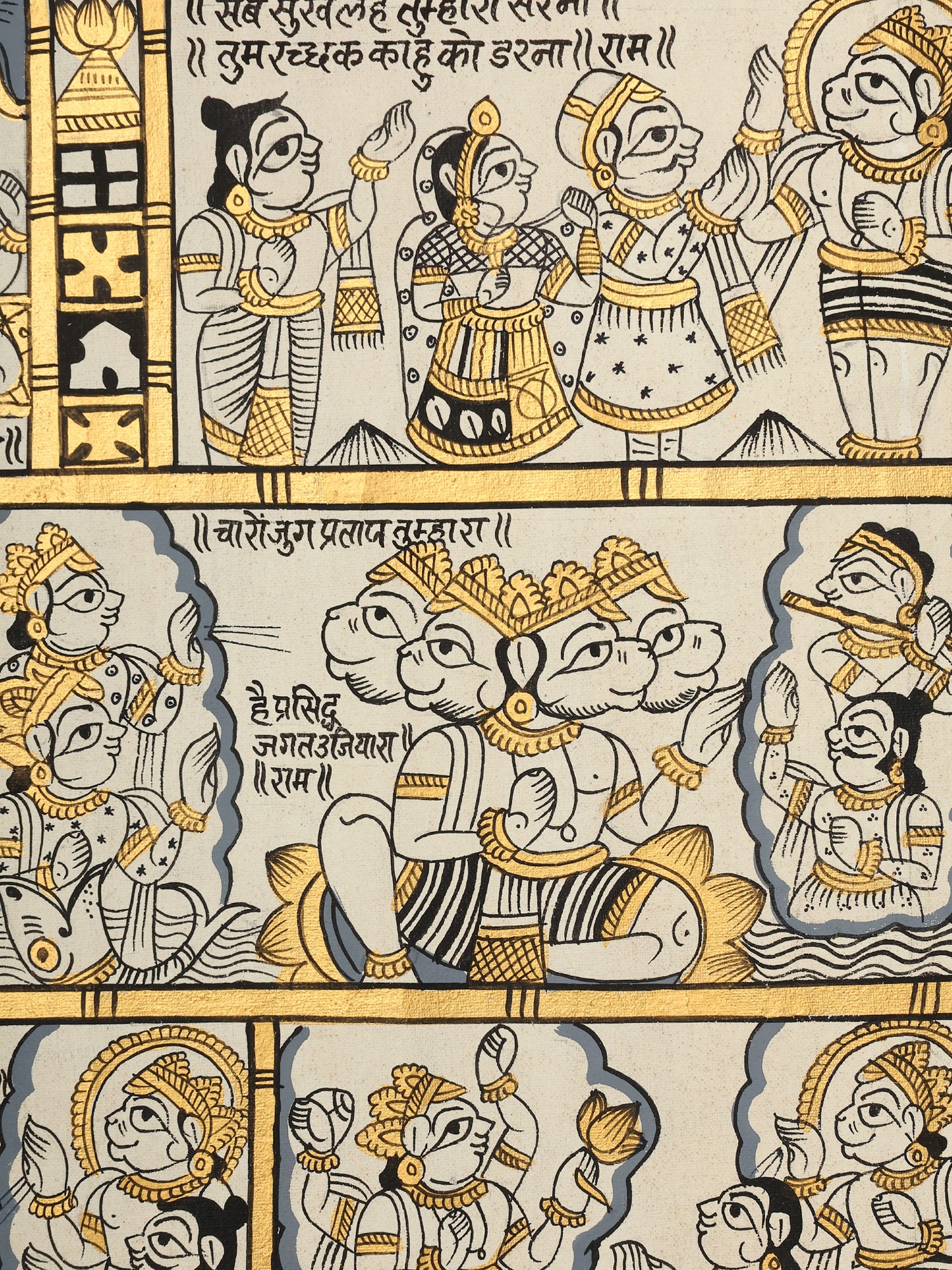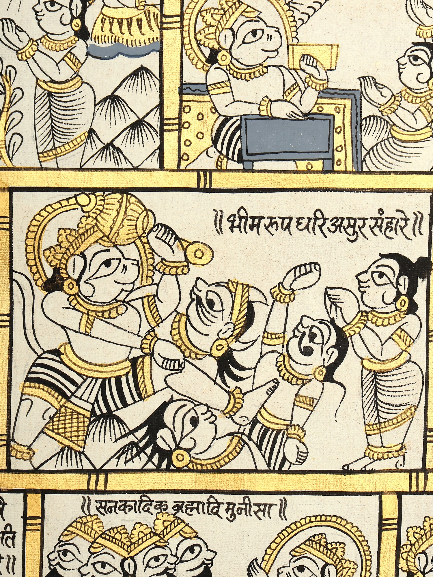 Step into a world of profound faith and epic narrative with this magnificent hand-painted rendition of the Hanuman Chalisa. More than just a decorative piece, this artwork is a visual symphony, meticulously capturing each verse of the revered devotional hymn that extols the virtues and exploits of Lord Hanuman, the steadfast devotee of Lord Rama. Each panel unfolds like a page from an ancient manuscript, inviting the viewer to embark on a visual journey through the sacred verses. The artistry employed here draws inspiration from the rich tradition of folk painting, specifically echoing the intricate storytelling and vibrant aesthetics often found in Pichhwai art. Natural colors, rendered on a cloth canvas, lend an authentic, earthy feel to the composition, imbuing it with a timeless quality. The fine brushstrokes and attention to detail bring to life a multitude of characters and scenes, from the divine birth of Hanuman to his awe-inspiring feats of strength and devotion. ––––––––––