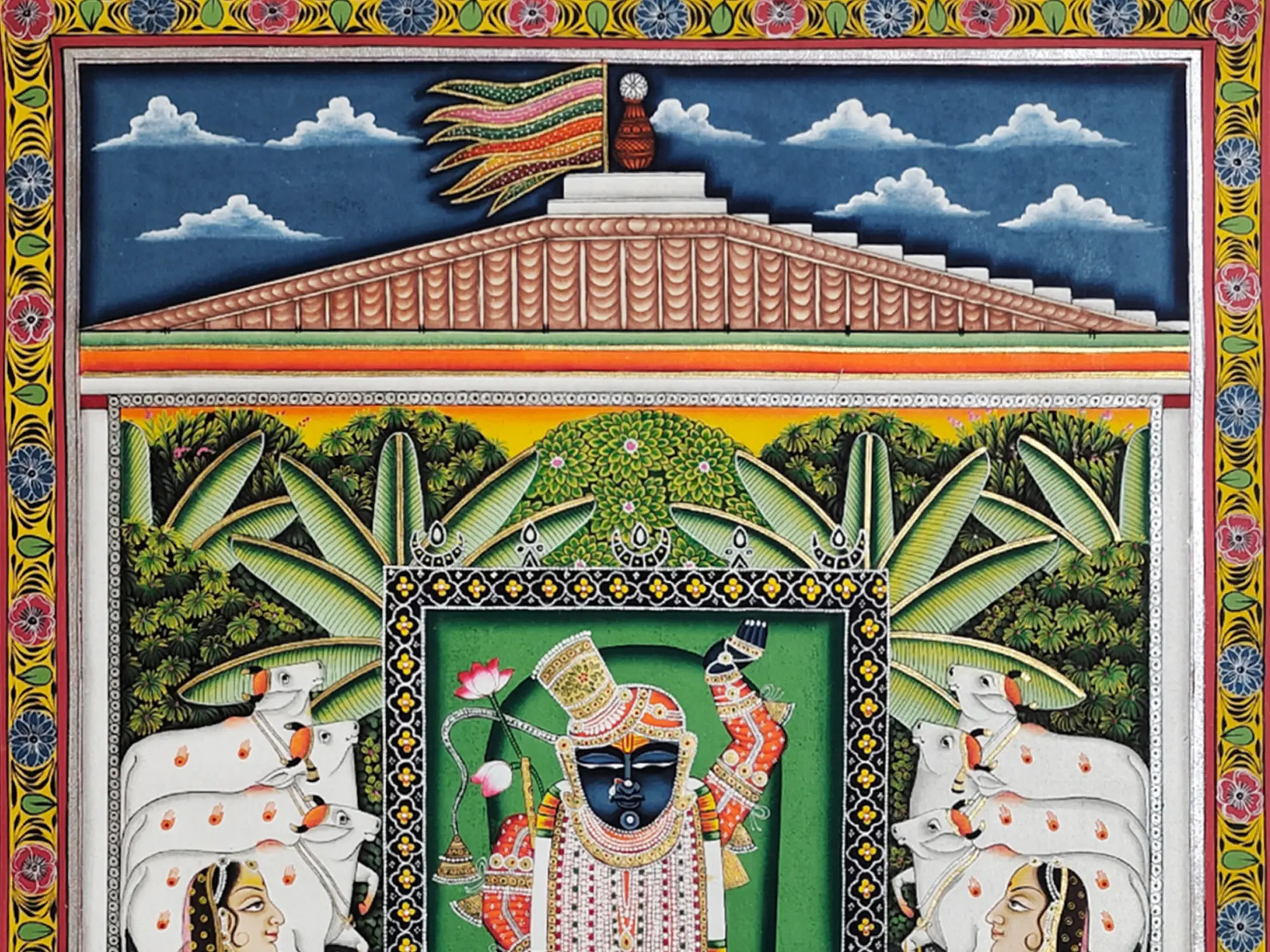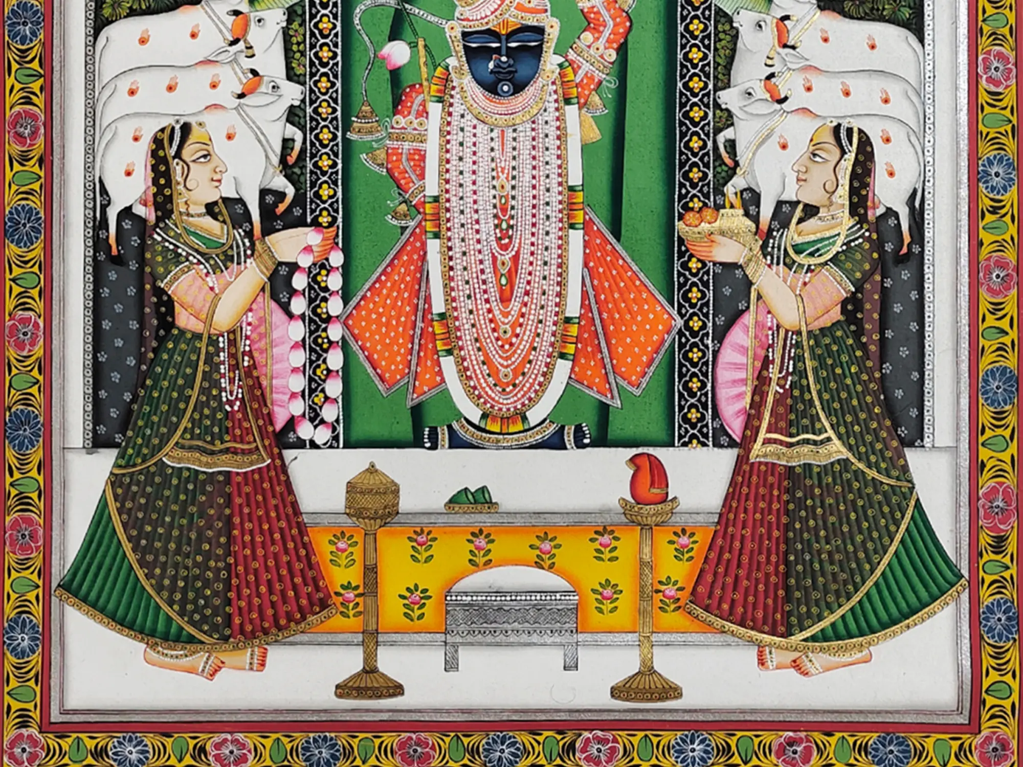 The composition is a symphony of color and form, measuring eighteen inches wide by twenty-four inches in height. Vibrant hues of emerald green, saffron orange, and deep indigo create a striking visual impact, balanced by delicate floral motifs and intricate bordering. The central figure, adorned with elaborate jewelry and garments, radiates an aura of divine presence. Notice the serene expressions of the attendants and the gentle presence of the sacred cows, each element contributing to the overall narrative and aesthetic appeal.
