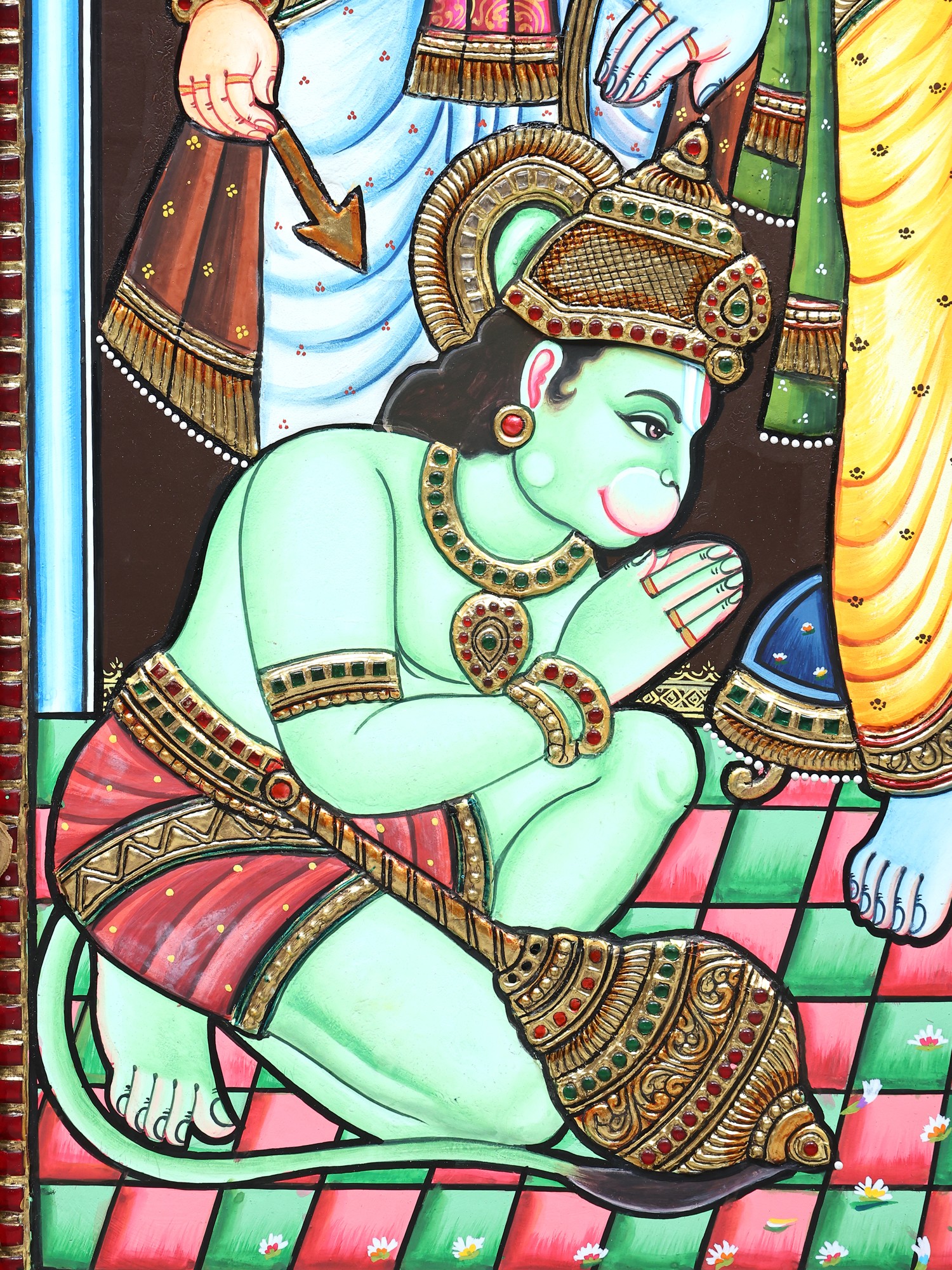 Immerse yourself in the divine presence of Lord Rama and his revered family with this exquisite Tanjore painting. This masterpiece, rendered in the traditional Tanjore style, captures a moment of profound serenity and devotion, depicting the central figures of the Ramayana. Lord Rama, the epitome of righteousness and virtue, stands tall, his serene blue complexion radiating a celestial aura. Adorned in vibrant silks and regal ornaments, he embodies the perfect king and a divine avatar. Beside him stands his devoted consort, Sita, whose gentle gaze and graceful posture speak volumes of her unwavering love and strength. Her hand is raised in a blessing gesture, a symbol of her compassionate nature. To Rama's left stands Lakshmana, his loyal brother and steadfast companion, depicted with an alert yet respectful demeanor, ever ready to serve. At the feet of the divine couple, the devoted Hanuman kneels in humble adoration. His iconic green form, a testament to his strength and devotion, is rendered with meticulous detail, his clasped hands a prayerful offering. The checkered floor beneath their feet, a traditional element in Tanjore art, symbolizes order and harmony. ––––––––––––––––––––