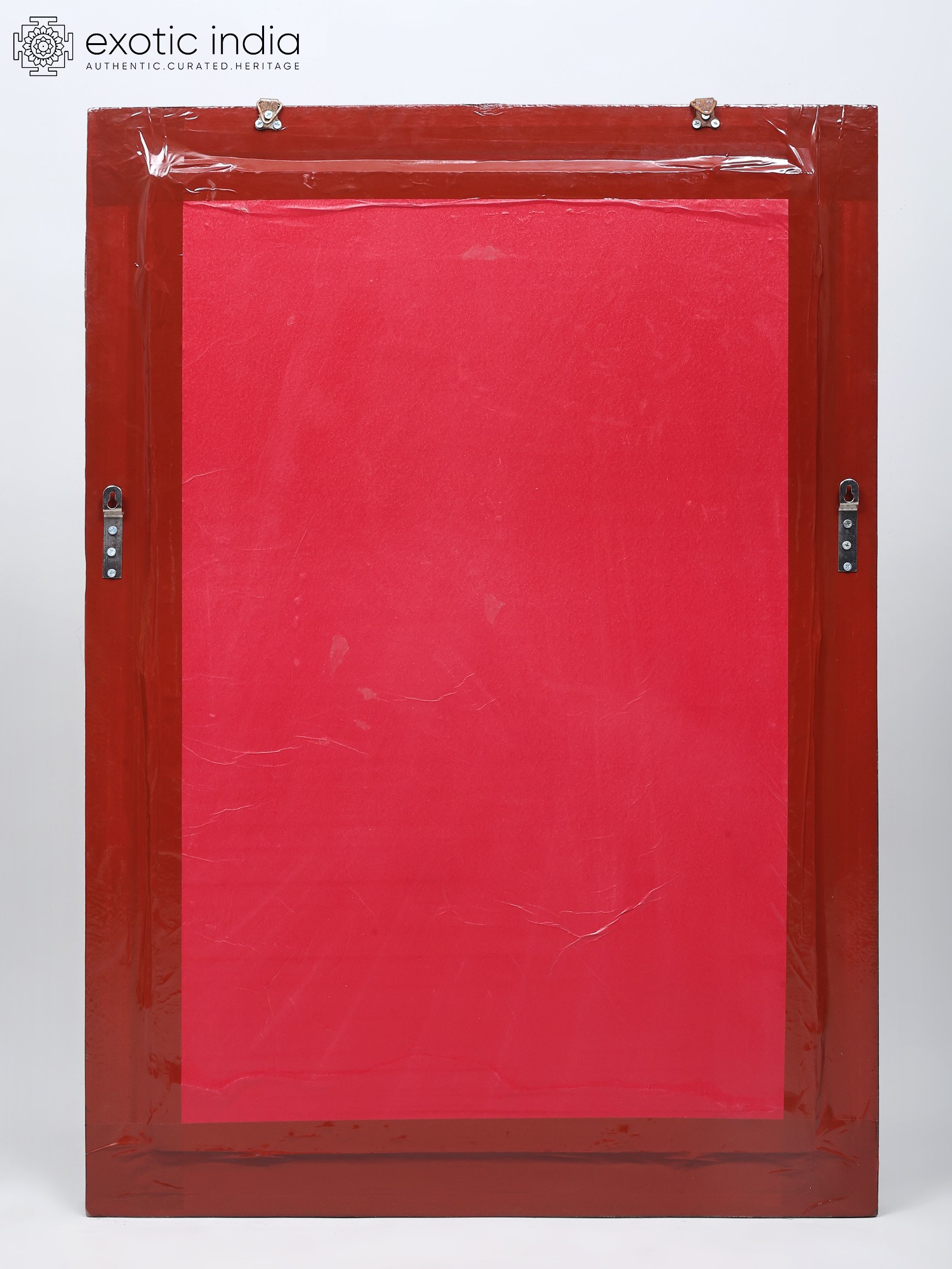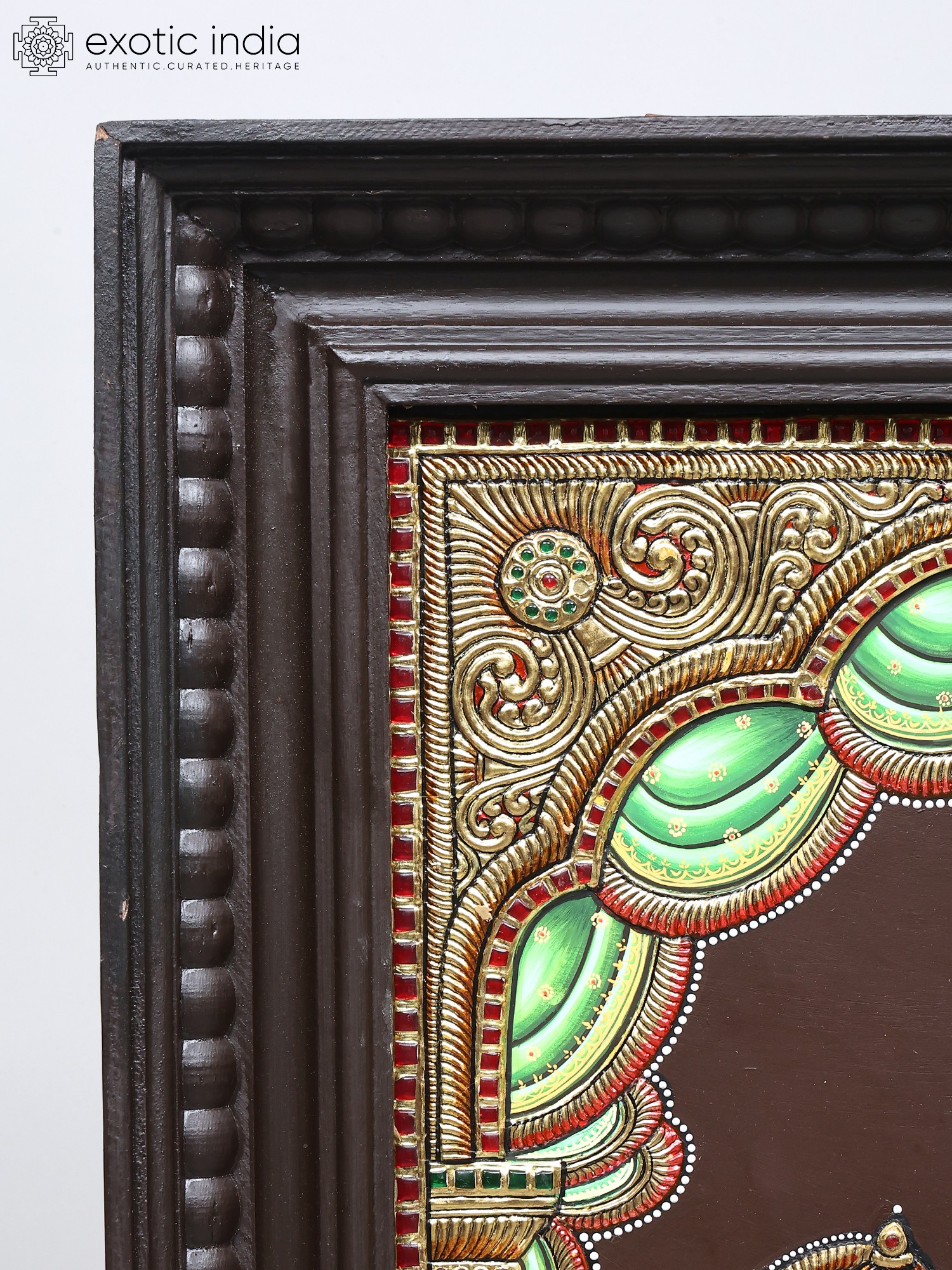 Tanjore paintings, originating from the ancient town of Thanjavur in Tamil Nadu, are renowned for their rich colors, intricate detailing, and the liberal use of gold leaf. This particular artwork exemplifies the finest traditions of this art form. The use of vibrant, natural pigments brings the divine figures to life, while the meticulously applied 24-karat gold work lends an unparalleled luminescence and depth to the composition. The shimmering gold adorns the crowns, jewelry, and the very essence of the deities, evoking a sense of opulence and sacredness. The arched canopy above the figures, intricately designed with patterns and semi-precious stone embellishments, further enhances the regal setting. This architectural element is a hallmark of Tanjore paintings, often symbolizing a divine court or a sacred space. The frame itself, a sturdy and ornate border, complements the painting, providing a sense of completeness and readying it for display in a place of honor. This framed Tanjore painting is not merely a decorative piece; it is a portal to spiritual devotion, a testament to timeless epic tales, and an heirloom that can be cherished for generations. It serves as a constant reminder of the virtues of dharma, loyalty, and unwavering faith, as exemplified by the lives of Lord Rama and his divine retinue.