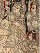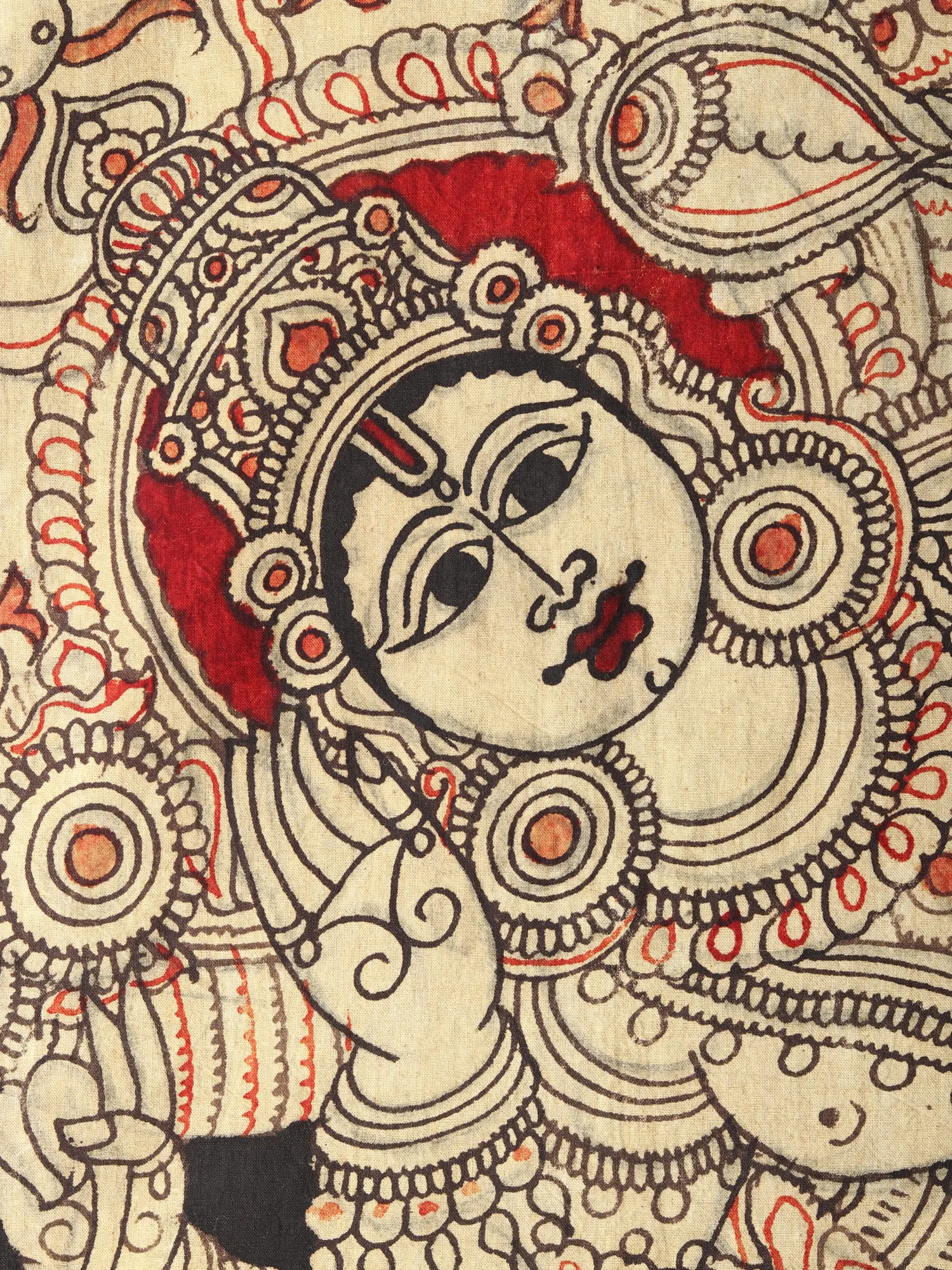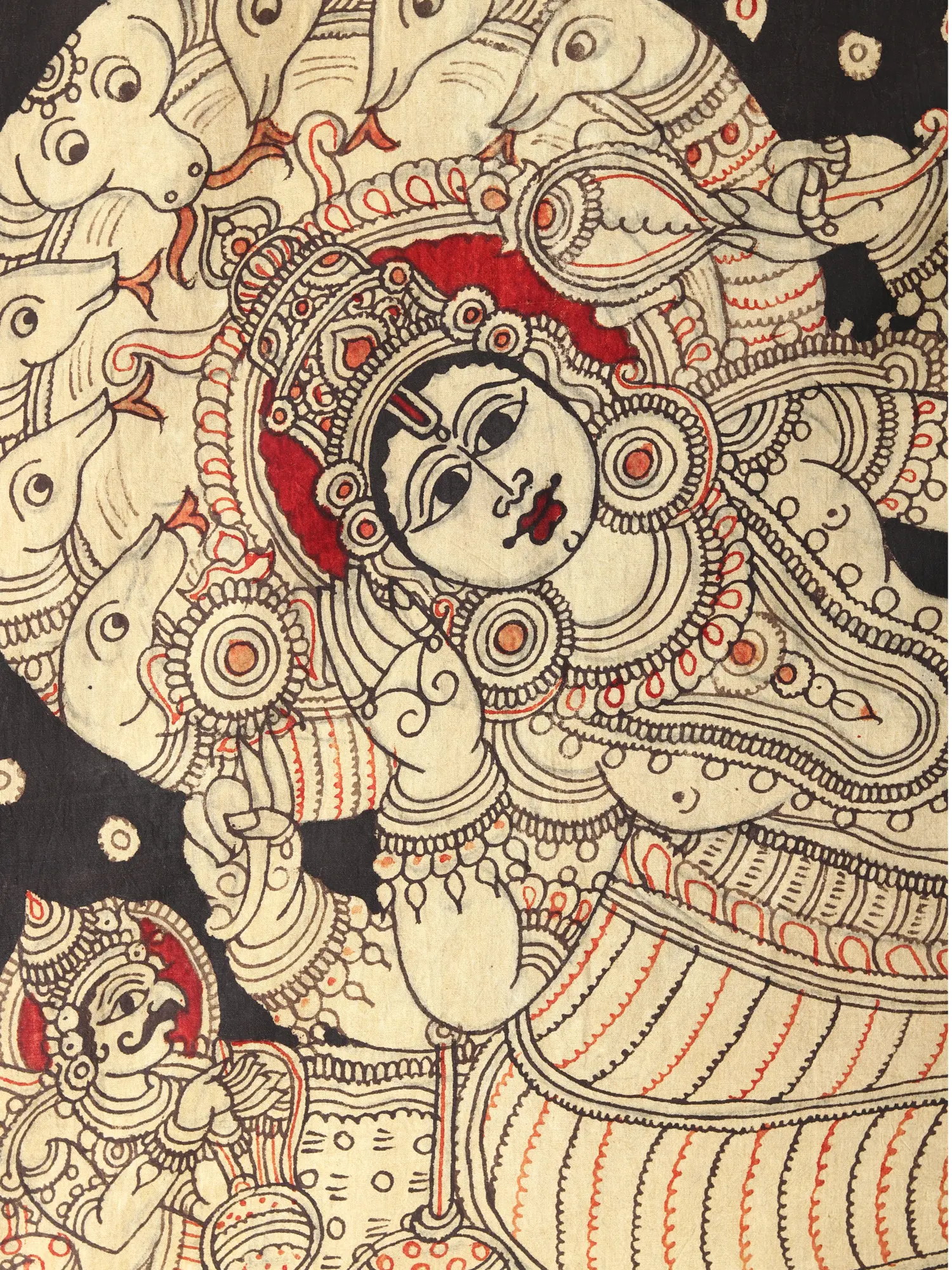 The image of Sri Ranganatha Swami holds profound significance, depicting the divine grace of Lord Vishnu in repose. In this Kalamkari painting on cotton, the celestial scene unfolds with intricate details, Sri Ranganatha Swami reclining on Shesh Naag, Goddess Lakshmi at his feet, Lord Garuda worshipping, and Lord Narada in adoration.