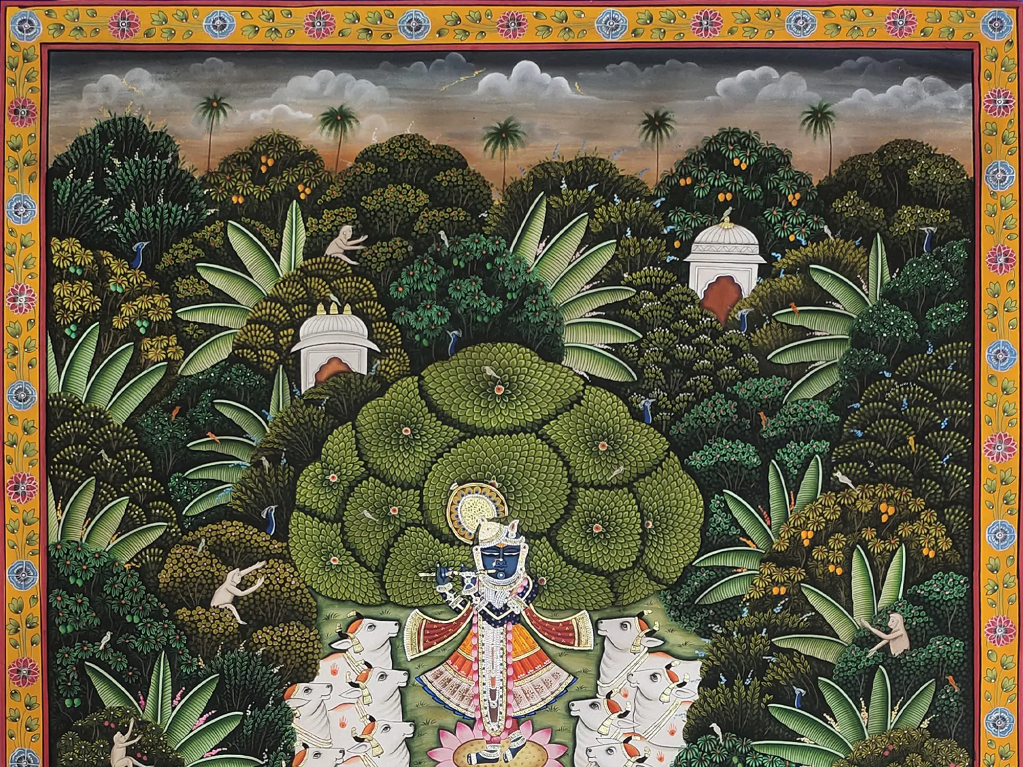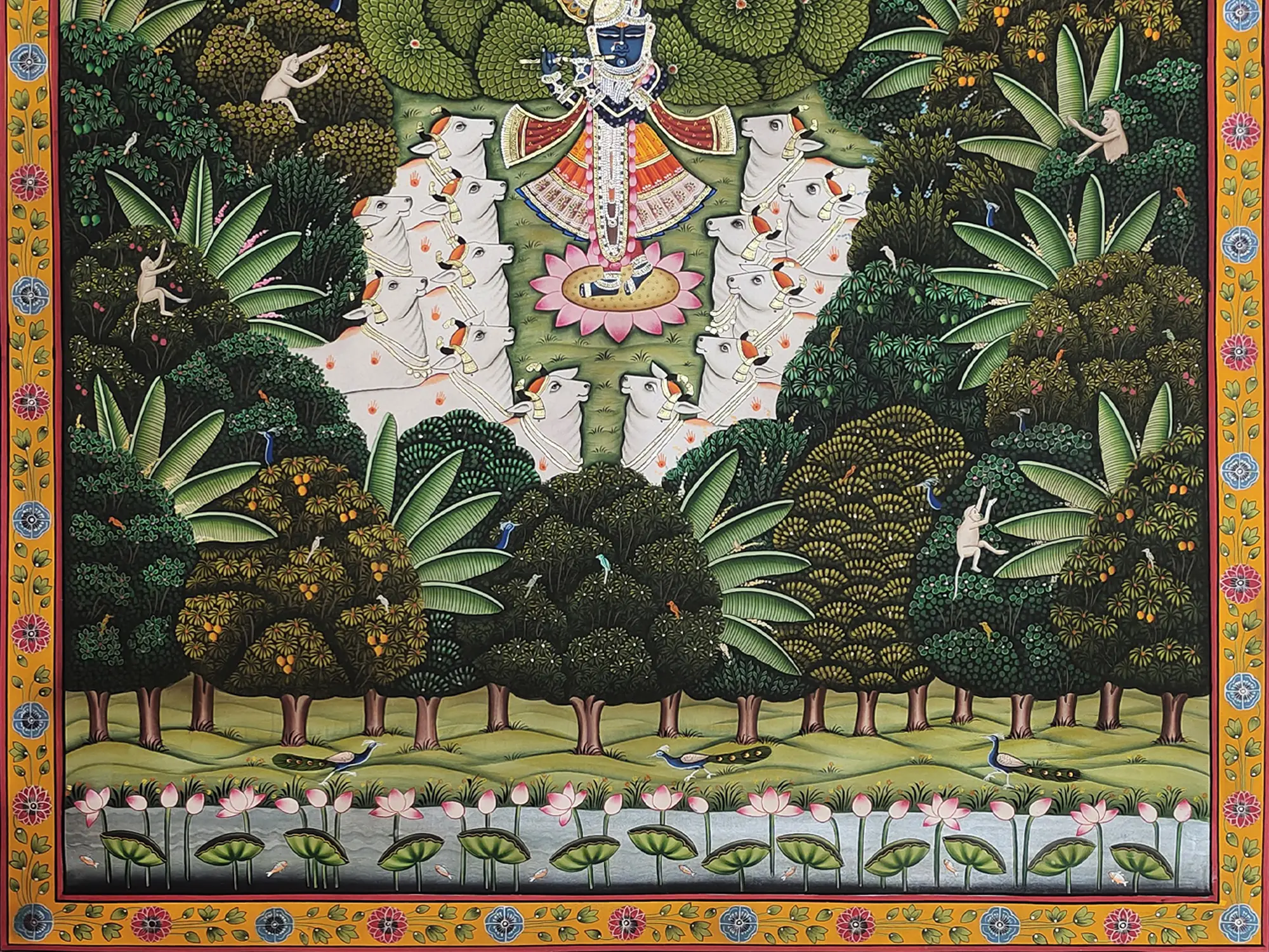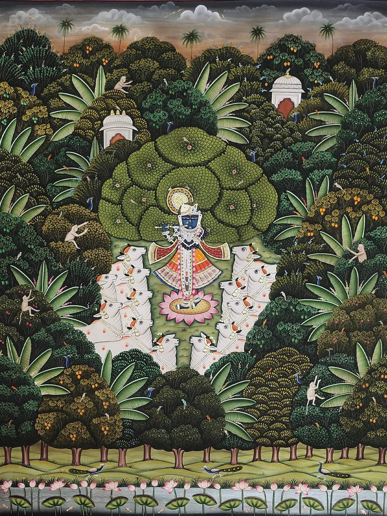 Witness the captivating depiction of Shrinathji, radiant in his traditional attire, amidst a verdant landscape teeming with life. Lush foliage forms a natural canopy, interspersed with exotic trees laden with fruit and graceful palm fronds reaching towards a softly clouded sky. The scene is further enlivened by playful monkeys and diverse birdlife, with the majestic peacock gracing the foreground pond. The composition, measuring a generous 48 inches in height and 36 inches in width, commands attention, drawing you into its enchanting narrative.