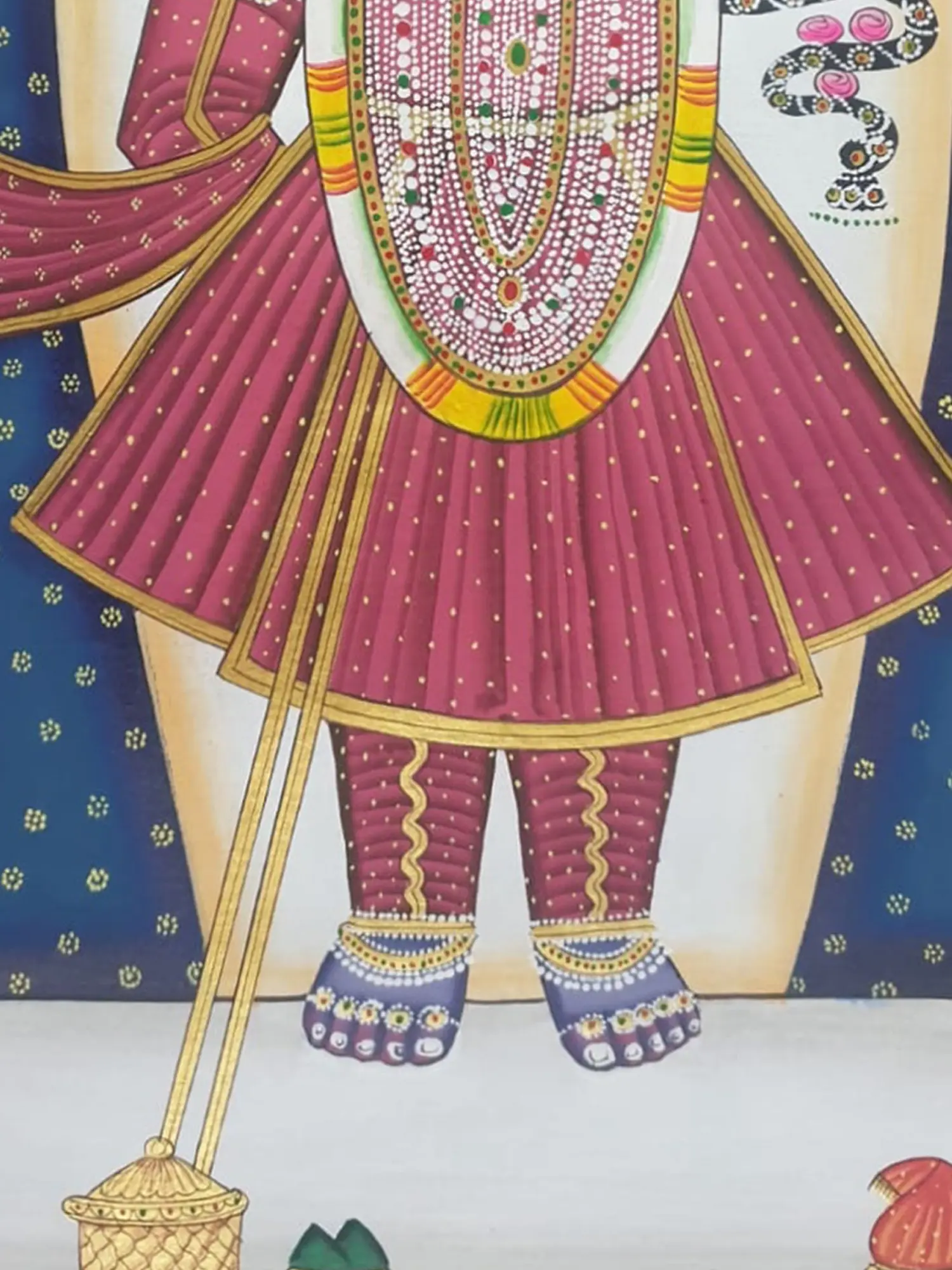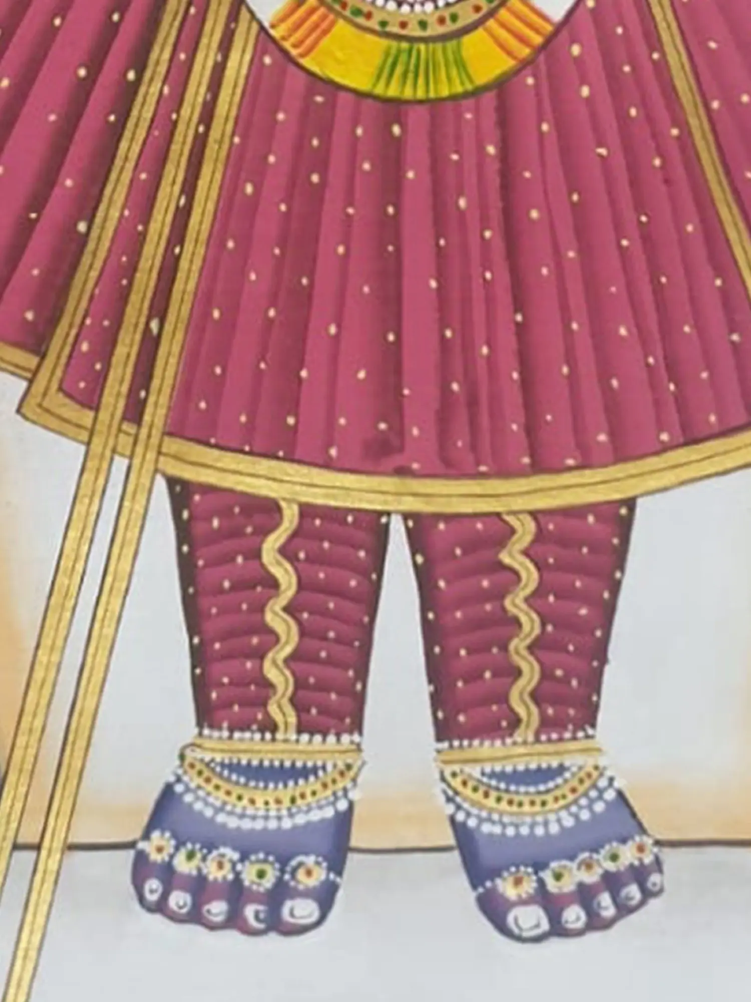 This depiction evokes the revered deity Shrinathji, a prominent manifestation of Lord Krishna in Indian Hinduism. Originating from the Nathdwara school of painting, this style is known for its devotional fervor and rich visual storytelling. You'll appreciate the way the artistry captures the divine essence, connecting the viewer to centuries of spiritual heritage and artistic expression.