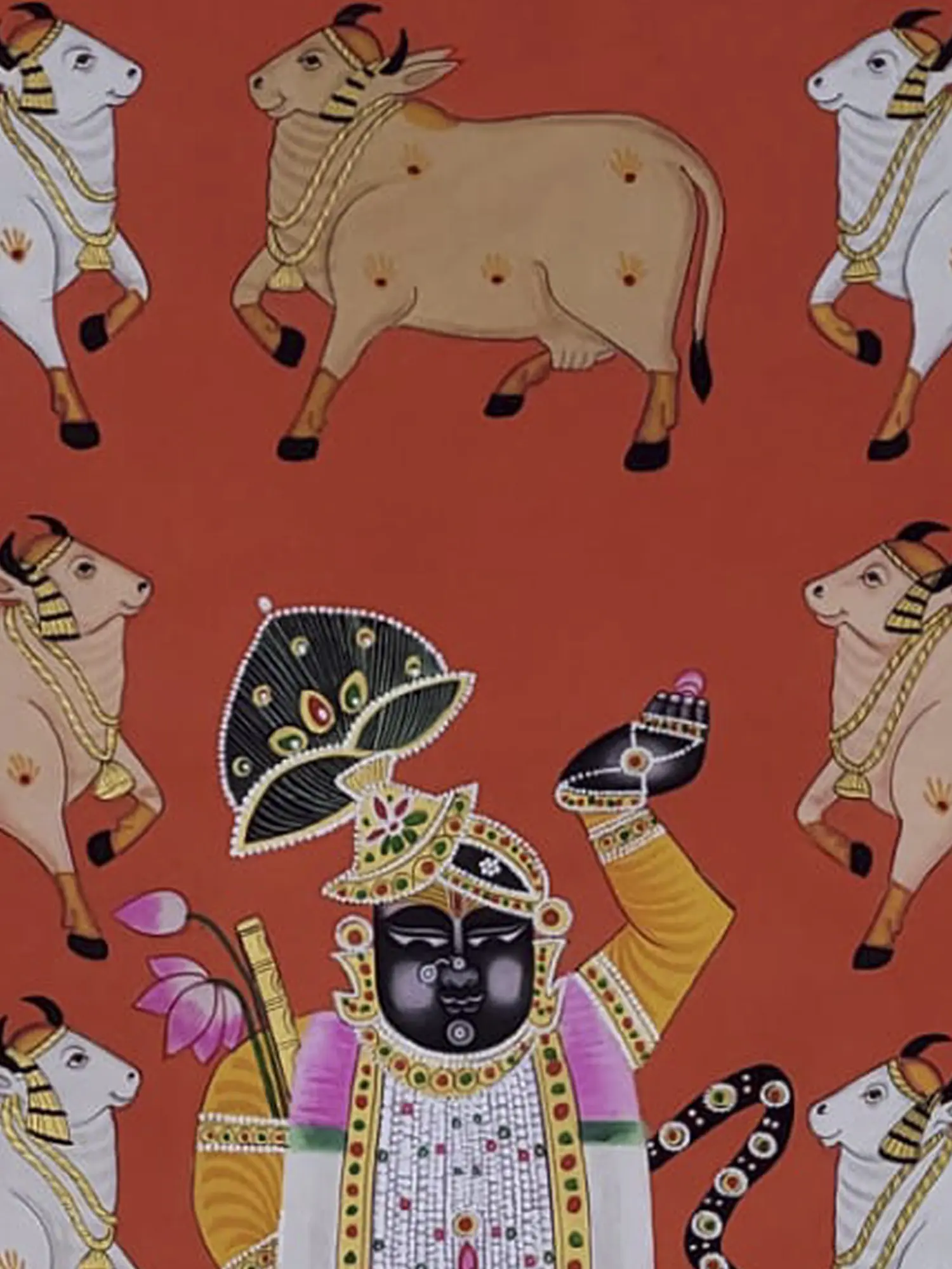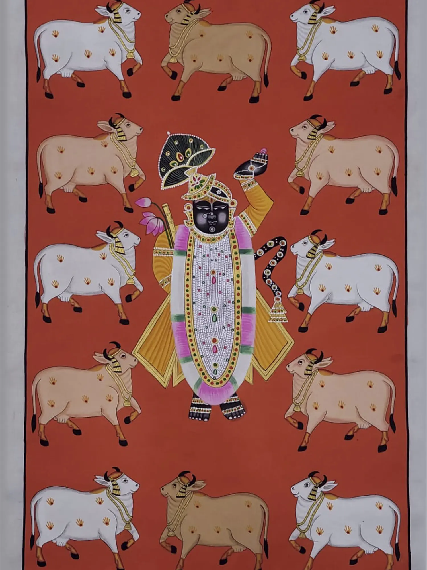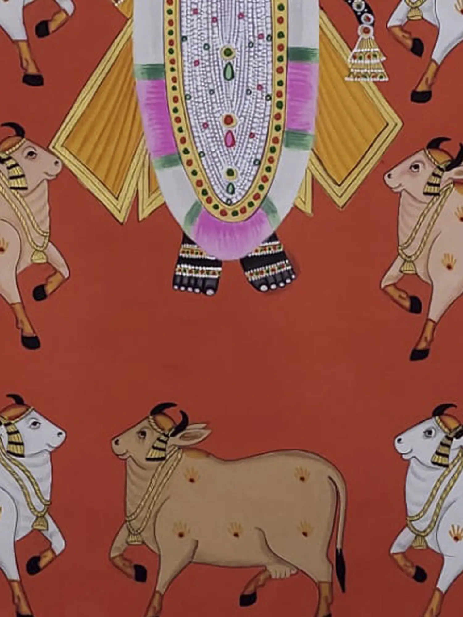 With reverence and devotion, the painting of Shrinathji celebrates the divine communion between the beloved deity and his devoted devotees. Each brushstroke carries the essence of devotion and surrender, as the celestial presence of Shrinathji radiates with transcendent grace. The artwork resonates with the sacred rhythms of devotion, inviting viewers to immerse themselves in the timeless rituals of worship and adoration.