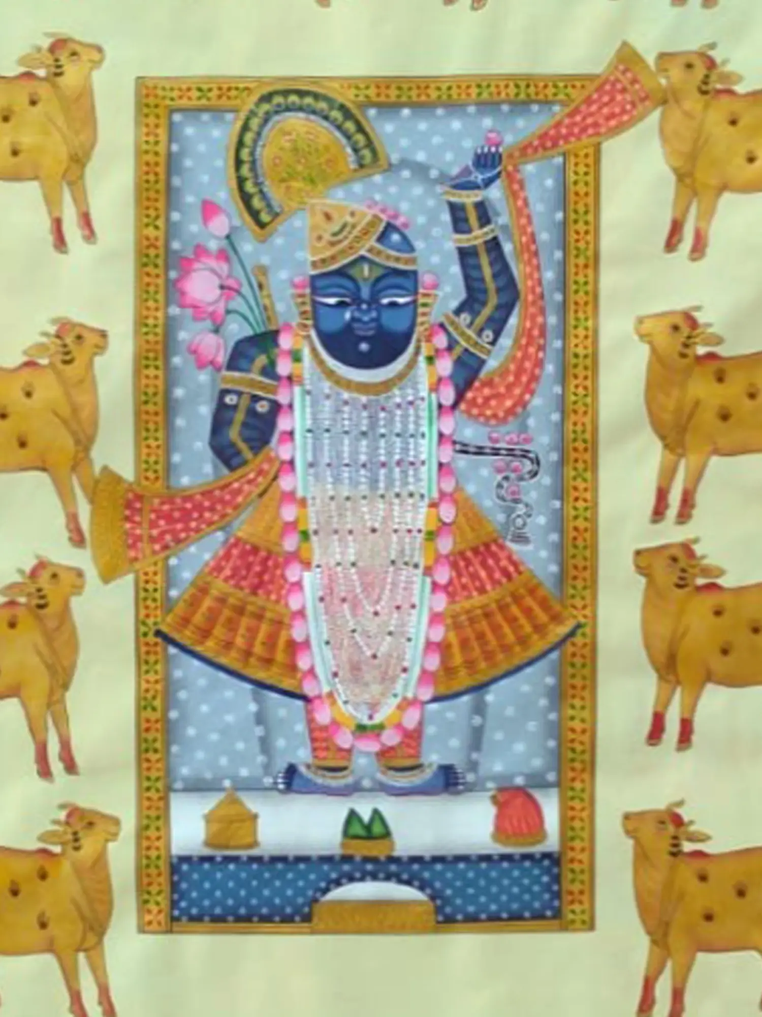 This depiction draws inspiration from the beloved tales of Shrinathji, a form of Lord Krishna revered in the Nathdwara region of Rajasthan. The presence of the cows evokes the pastoral landscapes of Gokul, where Krishna spent his childhood tending to cattle, highlighting themes of nurture, protection, and divine abundance. It’s a visual narrative steeped in Hindu mythology and devotional practices.