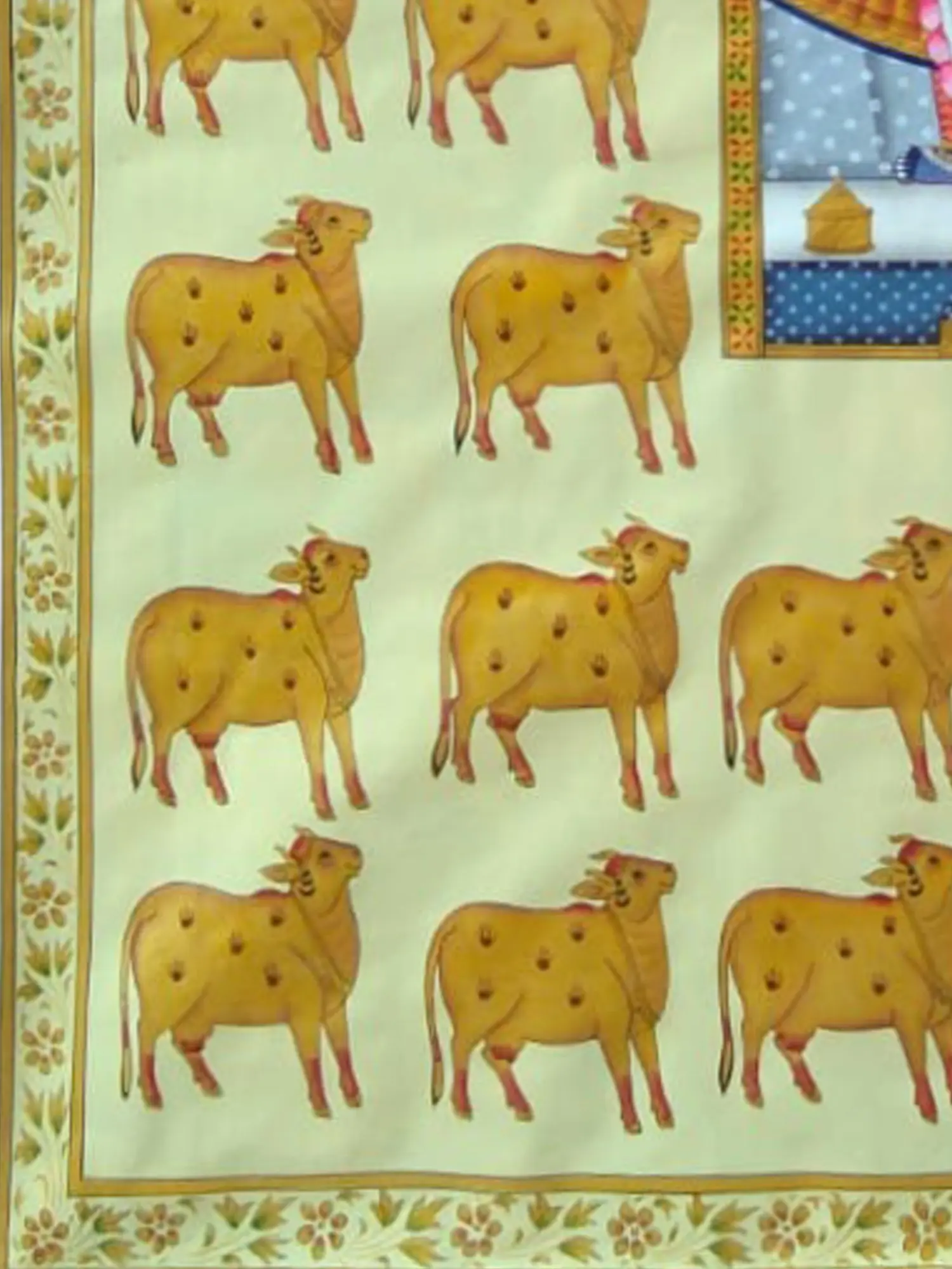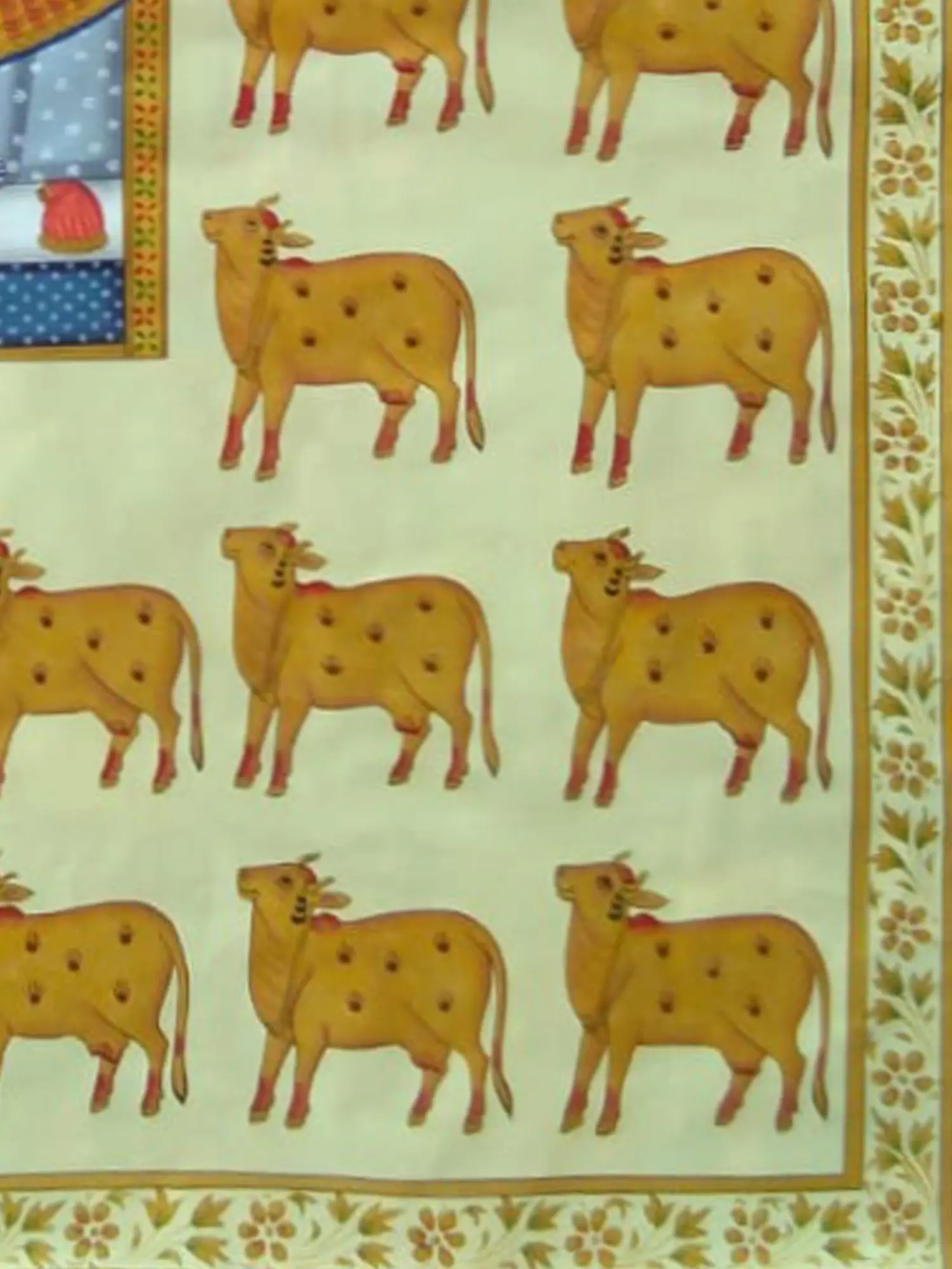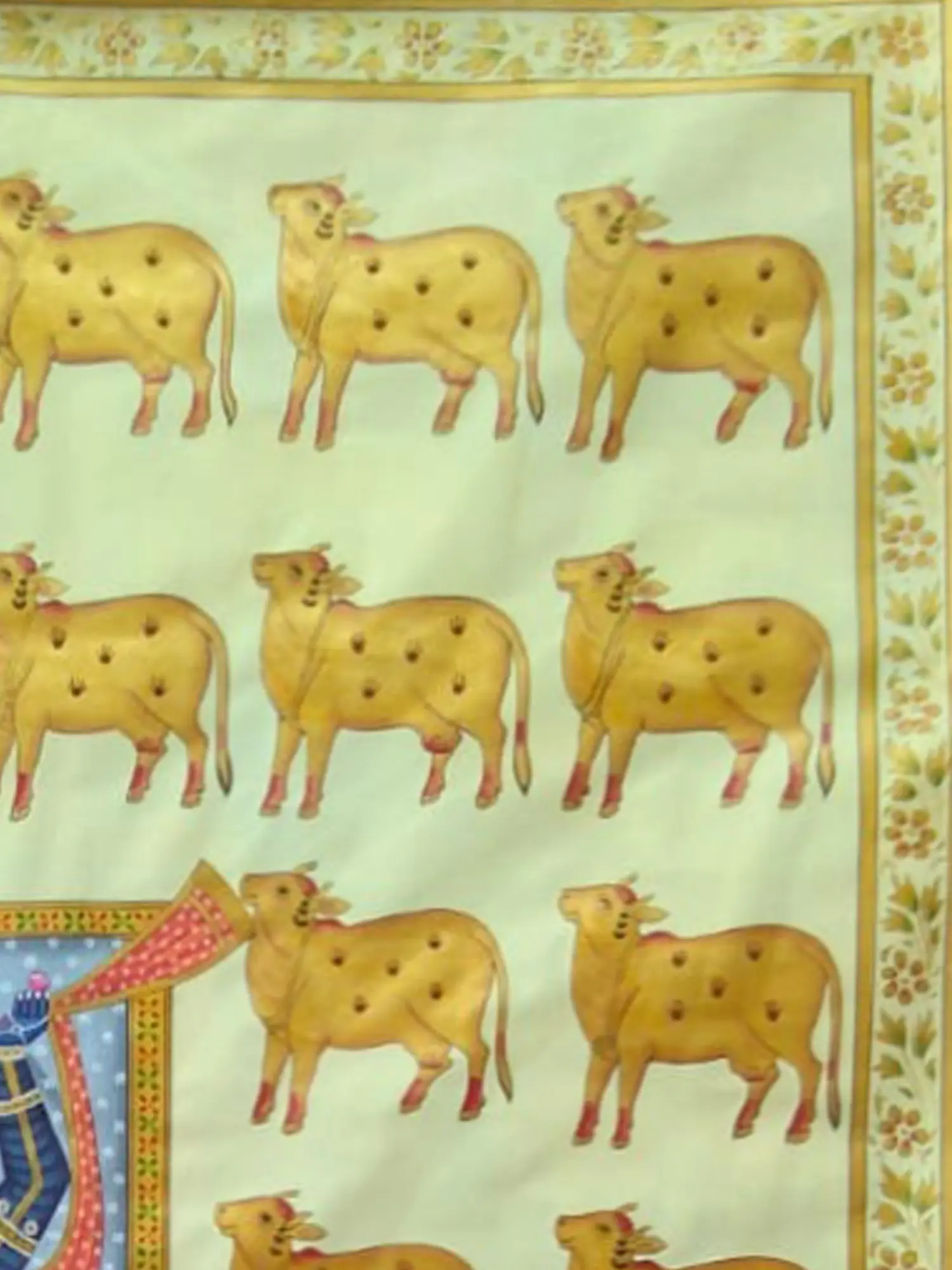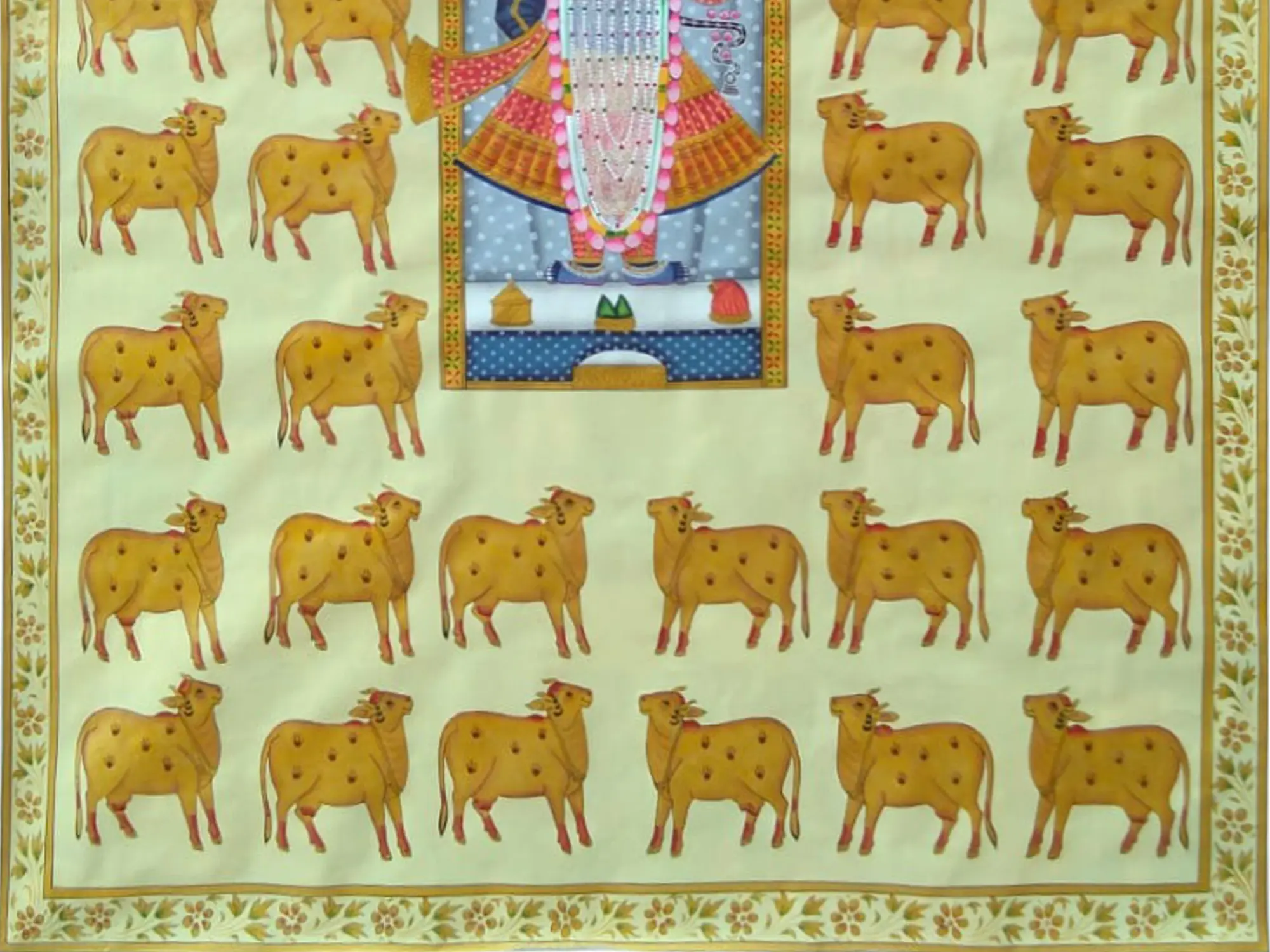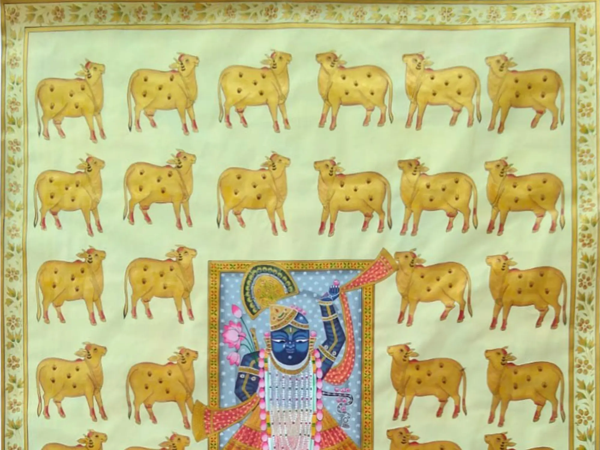 The central figure, depicted in rich blues and adorned in opulent traditional attire, radiates a gentle aura. Surrounding him, a procession of golden cows, each with subtle dot patterns, exemplifies the sacred relationship between the divine and nature. The surrounding border, adorned with delicate floral motifs, frames the artwork with an elegance that complements its devotional subject. The large scale of this masterpiece, standing 48 inches tall and 36 inches wide, ensures its commanding presence.