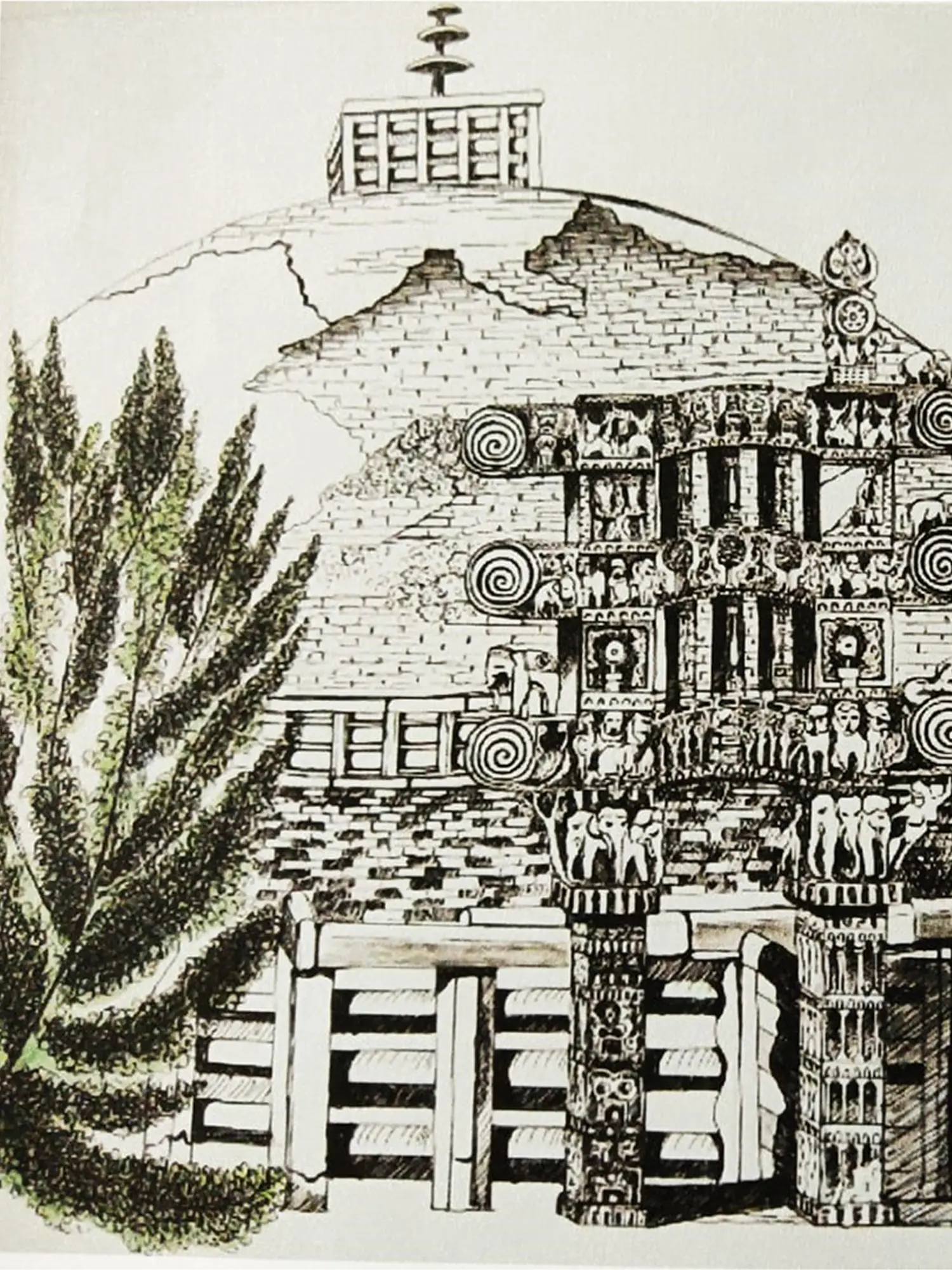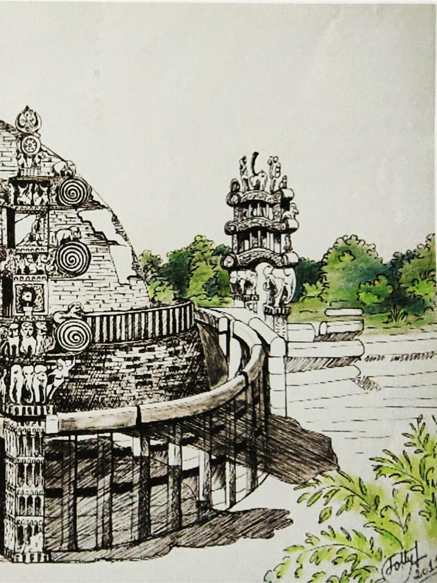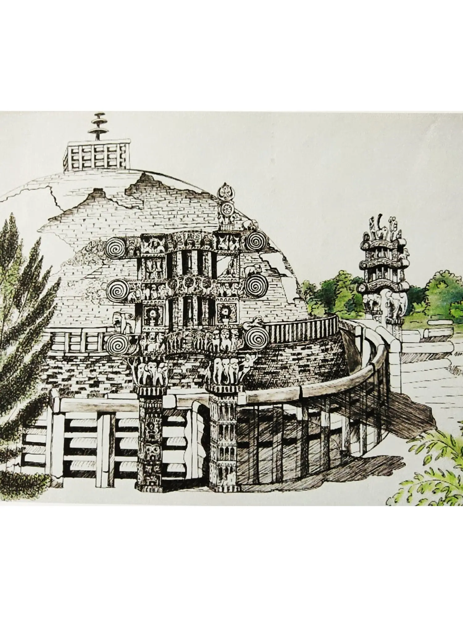 Jolly Agarwal's ink-on-paper sketch of Sanchi Stupa holds significant importance due to its preservation of cultural heritage and historical architecture. As a visual representation, it captures intricate details and architectural nuances, providing insights into the design and craftsmanship of ancient Indian stupas. This sketch serves as a valuable educational resource, allowing viewers to study the structure's form, ornamentation, and symbolism.