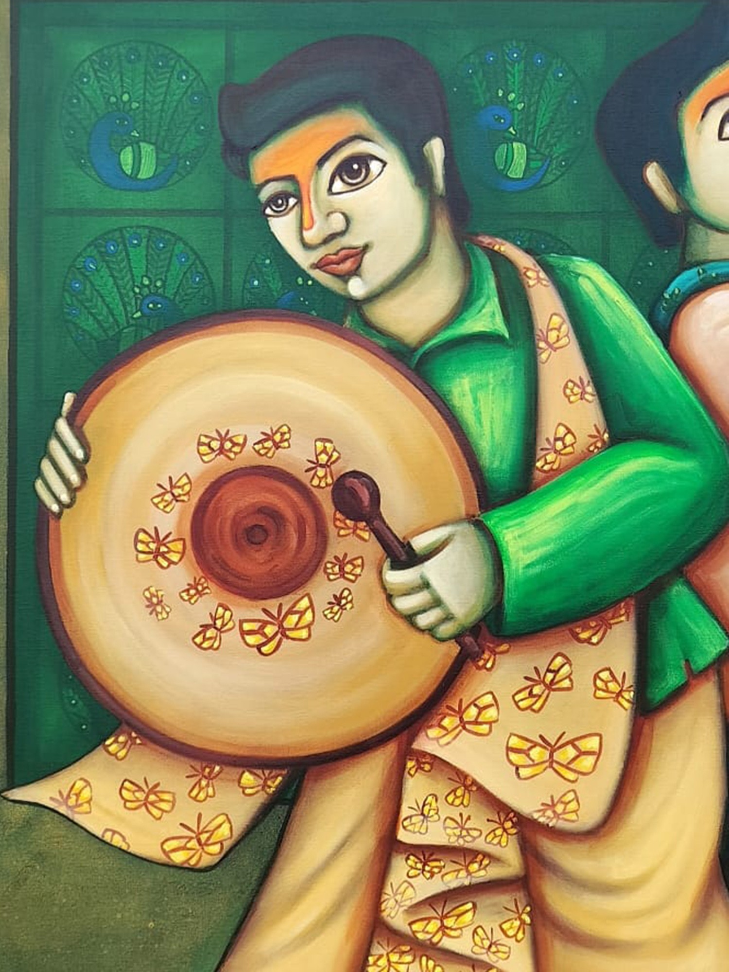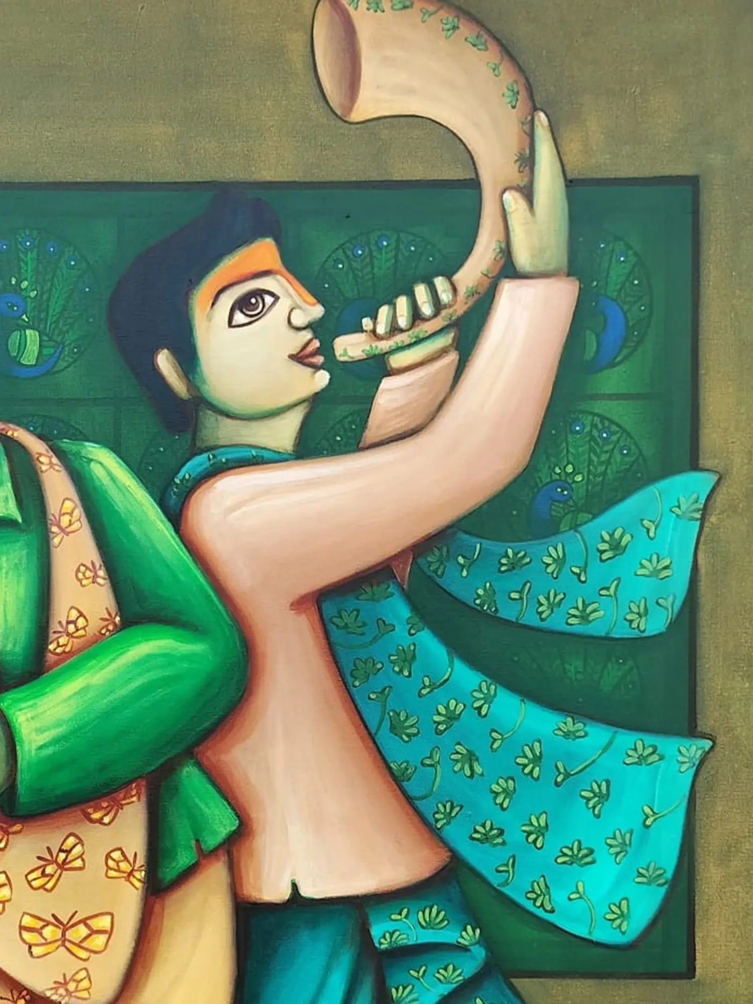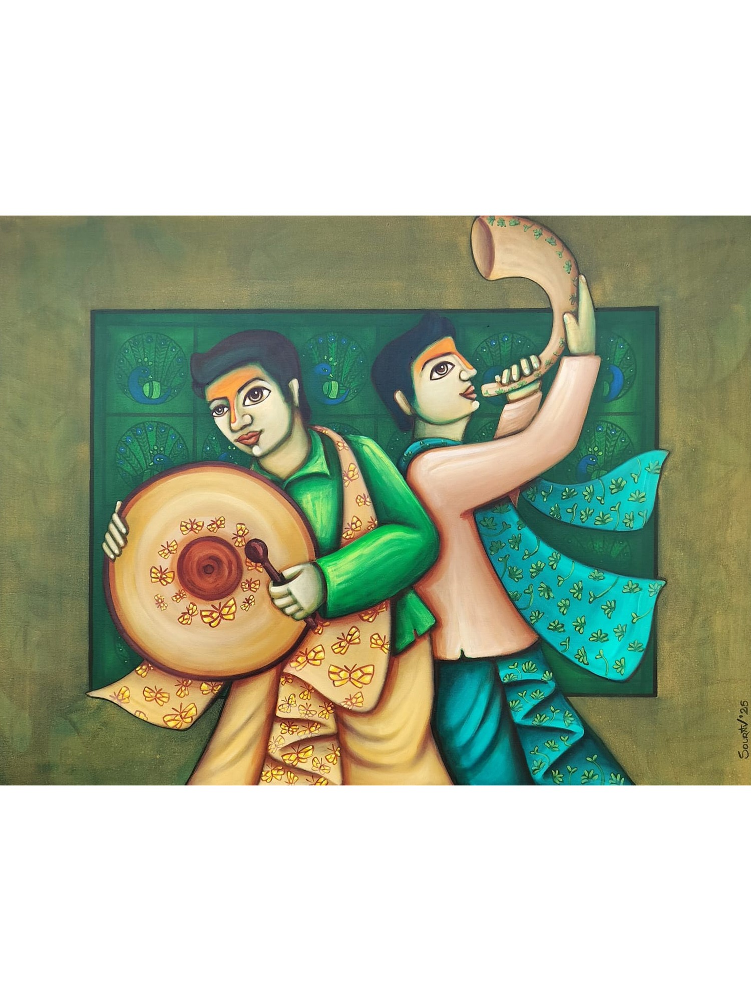 This work is a testament to the artist's unique style and vision. Sourav Sinha brings to life the spirit of celebration through his bold color choices and stylized figures. The painting, created with acrylic on canvas, captures a moment in time, freezing the energy and joy of the musicians' performance. The butterflies on the drummer's instrument add an element of whimsy and lightness, reinforcing the feeling of happiness that permeates the artwork. The peacock feather motifs in the background, a symbol of beauty, royalty, and love, complement the central figures and amplify the painting's overall message of joy and celebration. This artwork offers more than just a visual experience; it is an invitation to embrace life's joyful moments.
