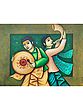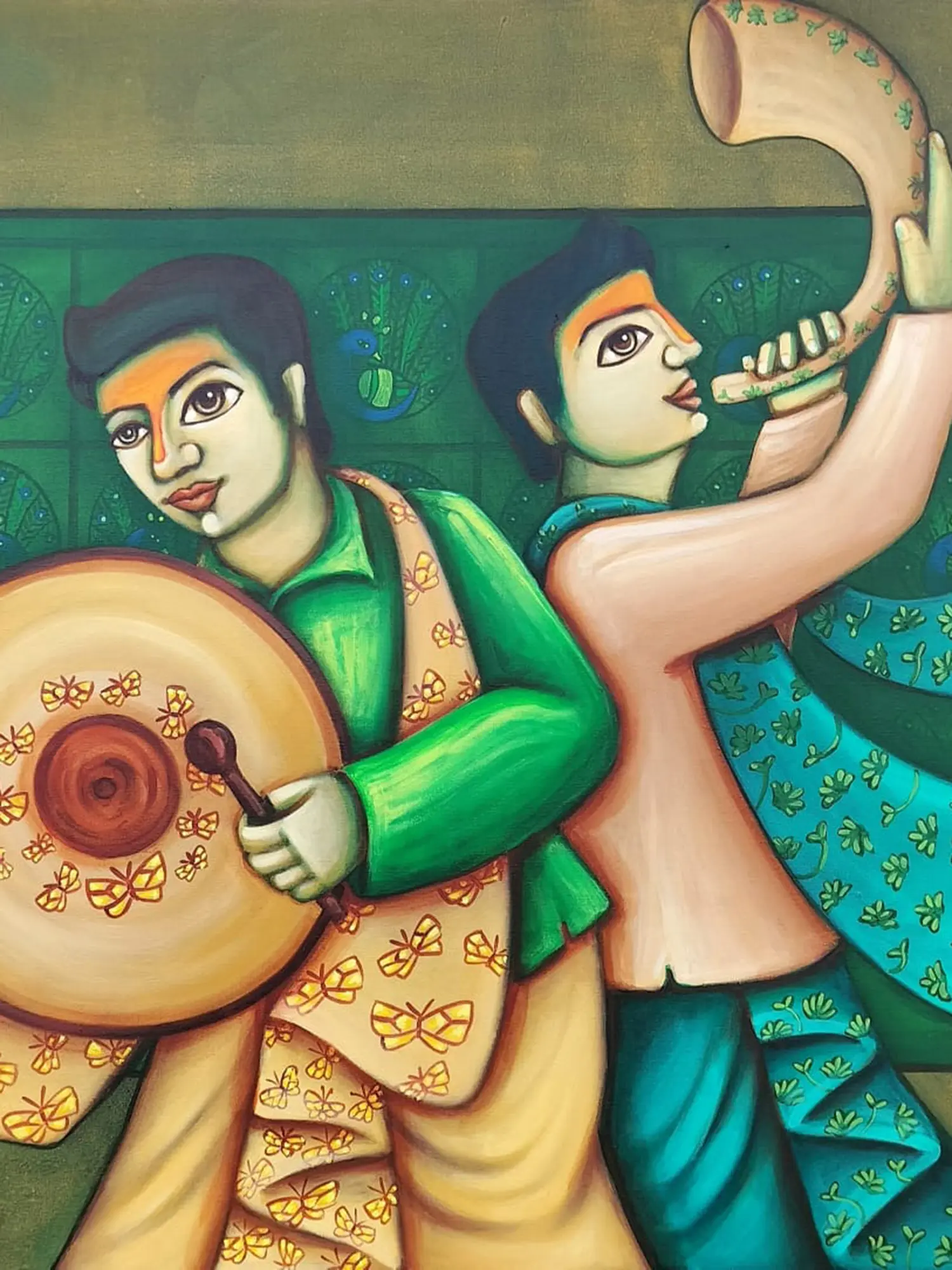 This captivating canvas presents a vibrant scene, capturing the essence of joyous celebration. Two musicians are rendered with a unique artistic flair, their forms stylized and imbued with a folk-art sensibility. The artist employs a rich palette of colors, each stroke contributing to the overall feeling of exuberance. The painting seems to pulse with the energy of the music it depicts, inviting the viewer to partake in the merrymaking. The background, adorned with stylized peacock feathers, adds a layer of cultural richness and symbolic depth. The overall effect is one of infectious happiness, a visual representation of pure, unadulterated joy.