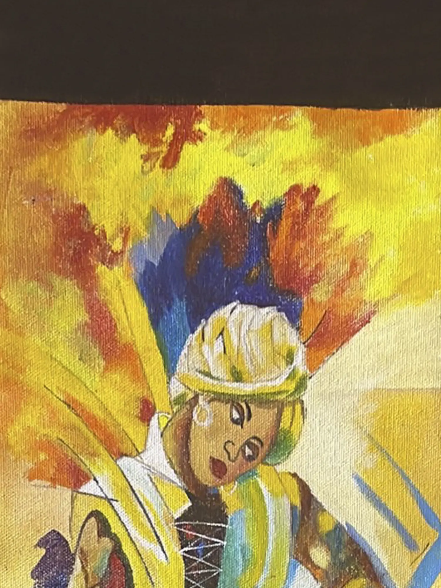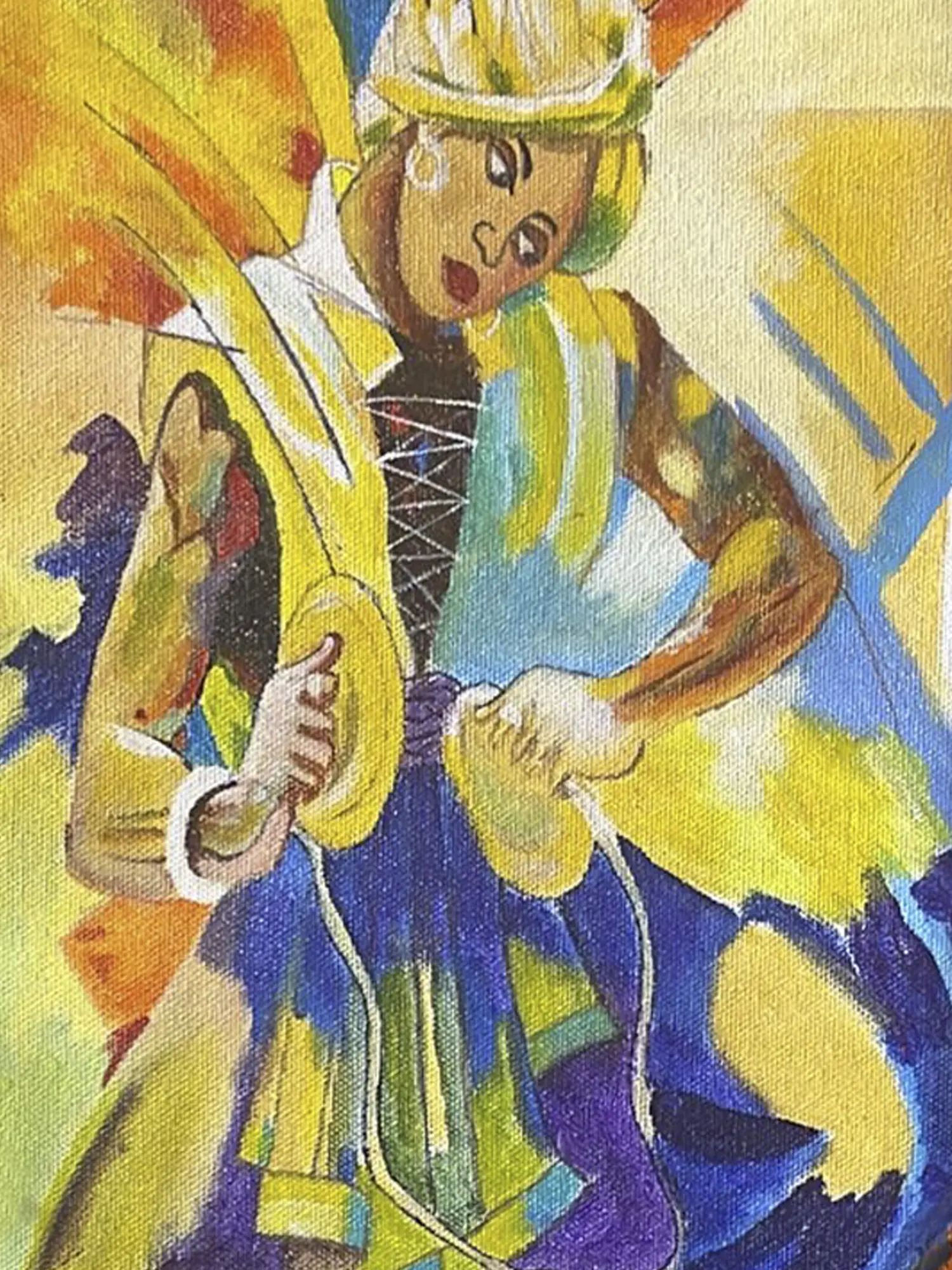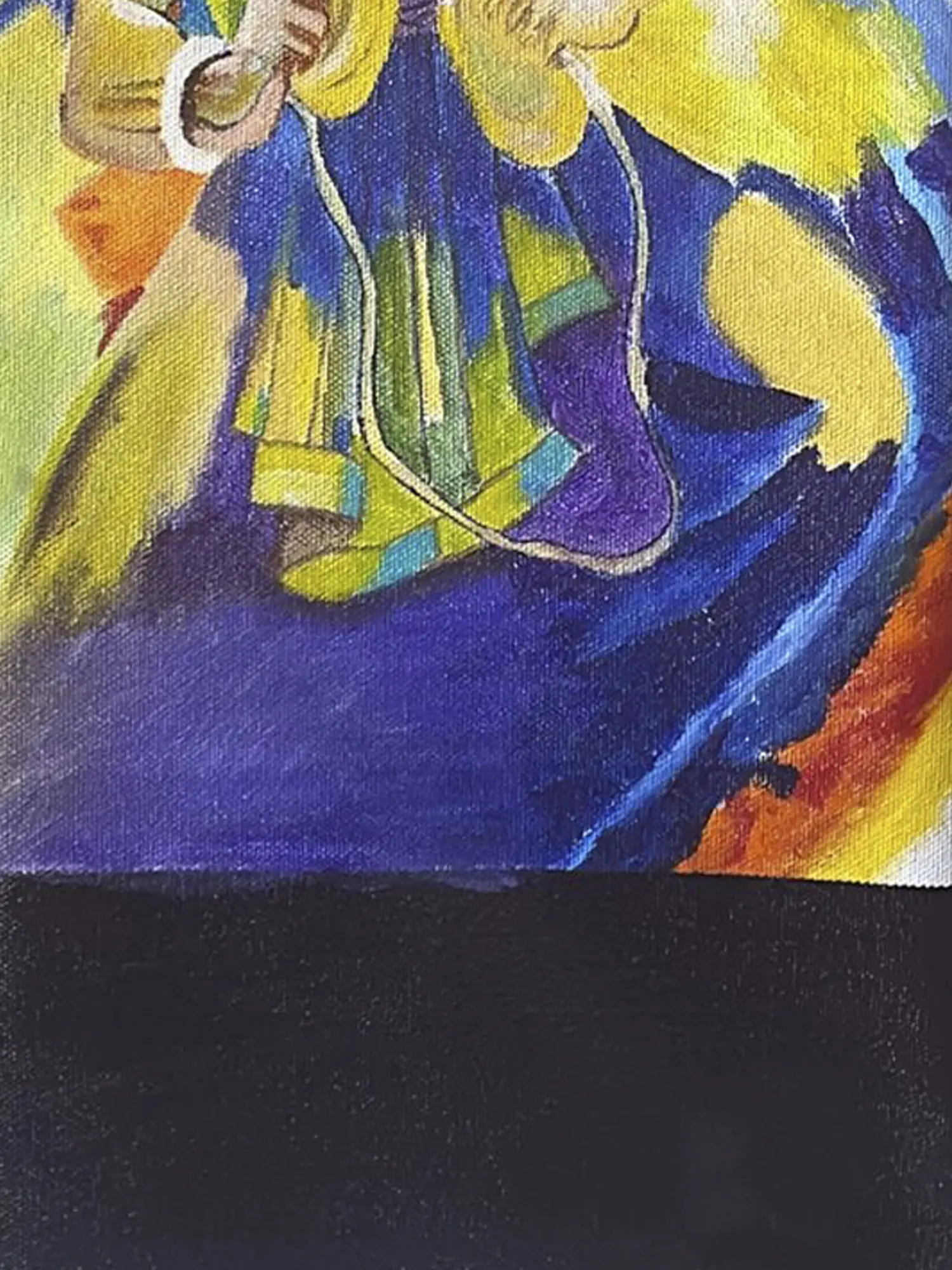 This painting, named Sound of Majeera, appears to depict the Sattriya dance. Ravi Upadhyay created this acrylic painting on canvas. Ravi's painting depicts a Sattriya dancer playing the Manjeera and dancing. With a skillful interplay of colors, Upadhyay masterfully captures the essence of dance that occurs while playing the manjeera, an Indian percussion instrument. The rhythmic vibrations seem to emanate from the artwork itself, visually translating the melodic sound into a vibrant visual composition.