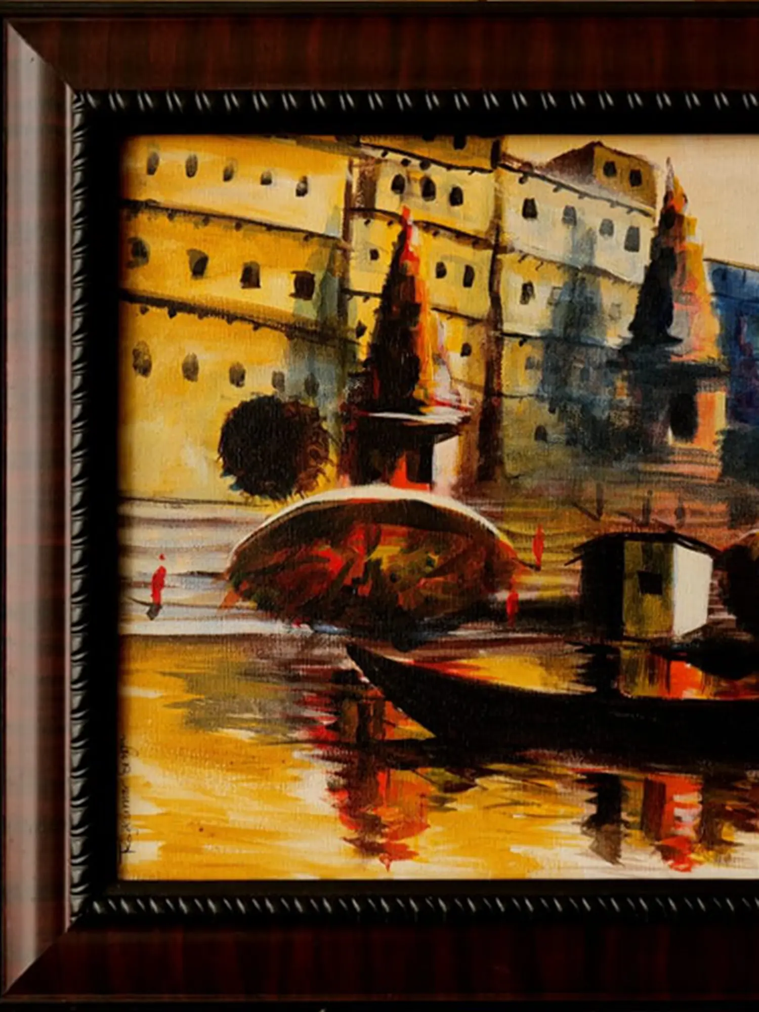 Measuring 12 inches in height by 20 inches in width, this artwork offers a captivating panoramic view. The interplay of light and shadow is masterfully depicted, with warm, golden tones reflecting on the water's surface, creating a mesmerizing spectacle. You'll discover subtle details in the architecture and the solitary boatman, each stroke contributing to the narrative of life unfolding along the riverbanks.
