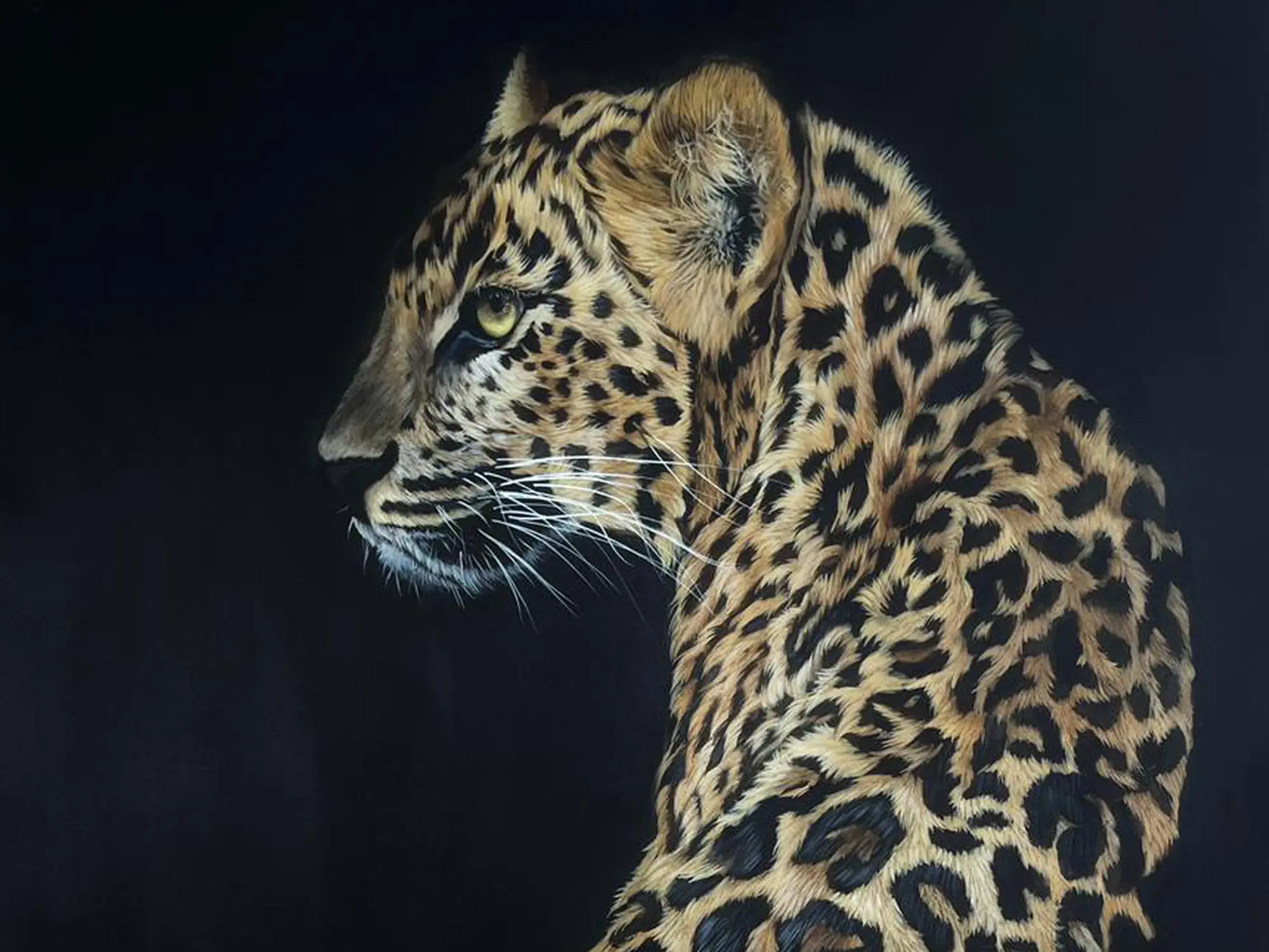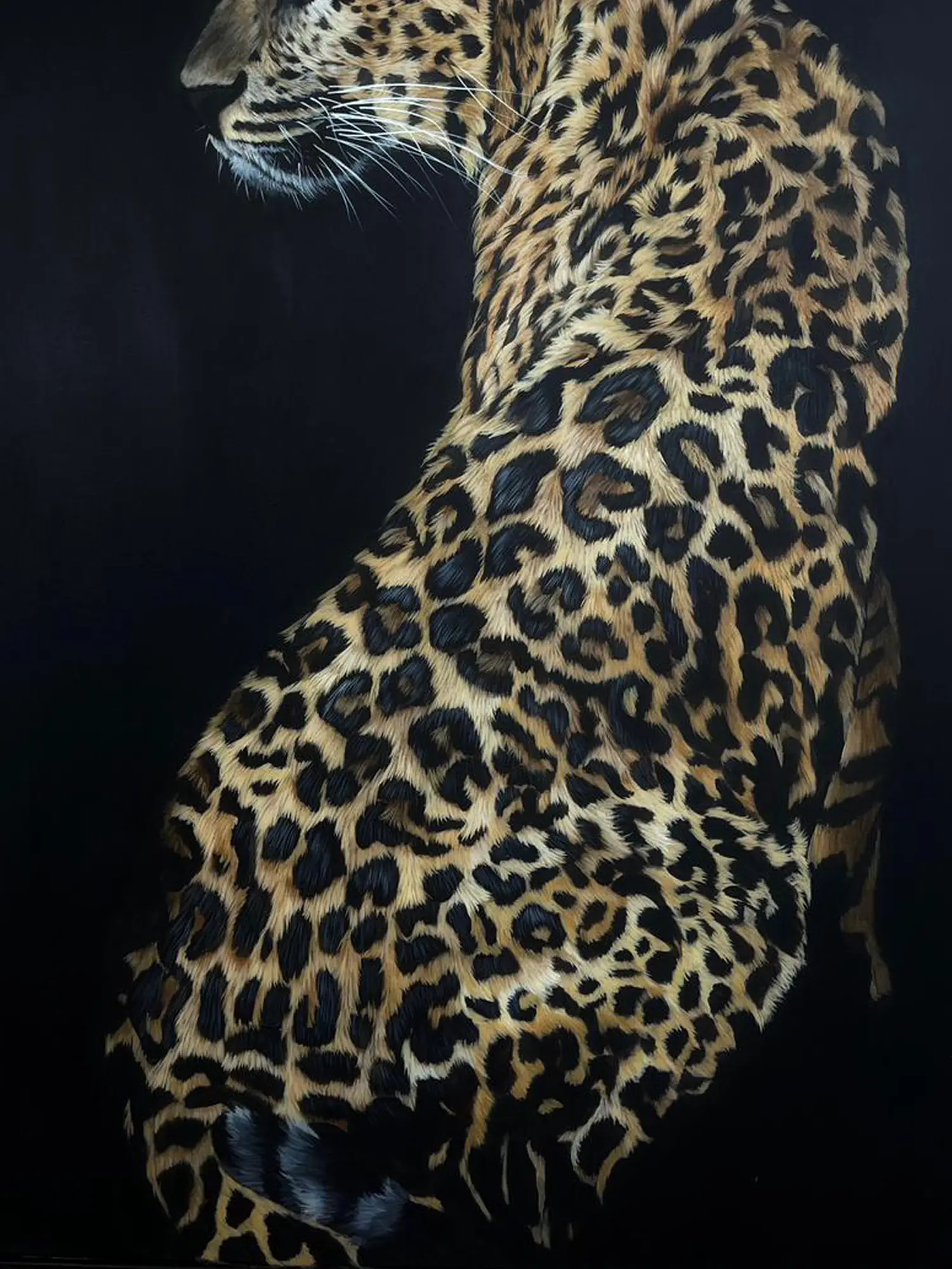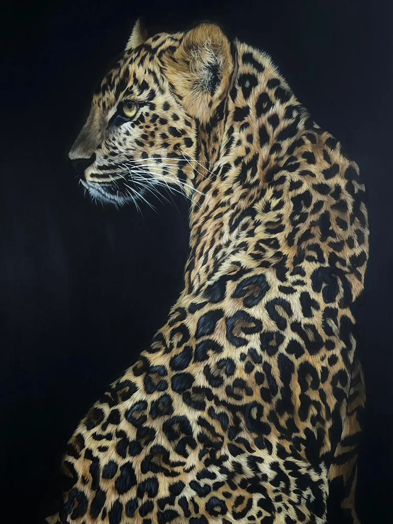 The interplay of light and shadow is masterfully executed, highlighting the intricate rosettes of the leopard's coat and the keen intelligence in its eyes. The expansive 36-inch height by 24-inch width creates a commanding presence, drawing the viewer into the scene. You'll be captivated by the subtle variations in fur color and the delicate rendering of whiskers, all contributing to an immersive visual experience that feels both dramatic and intimate. The dark background further accentuates the subject's form.