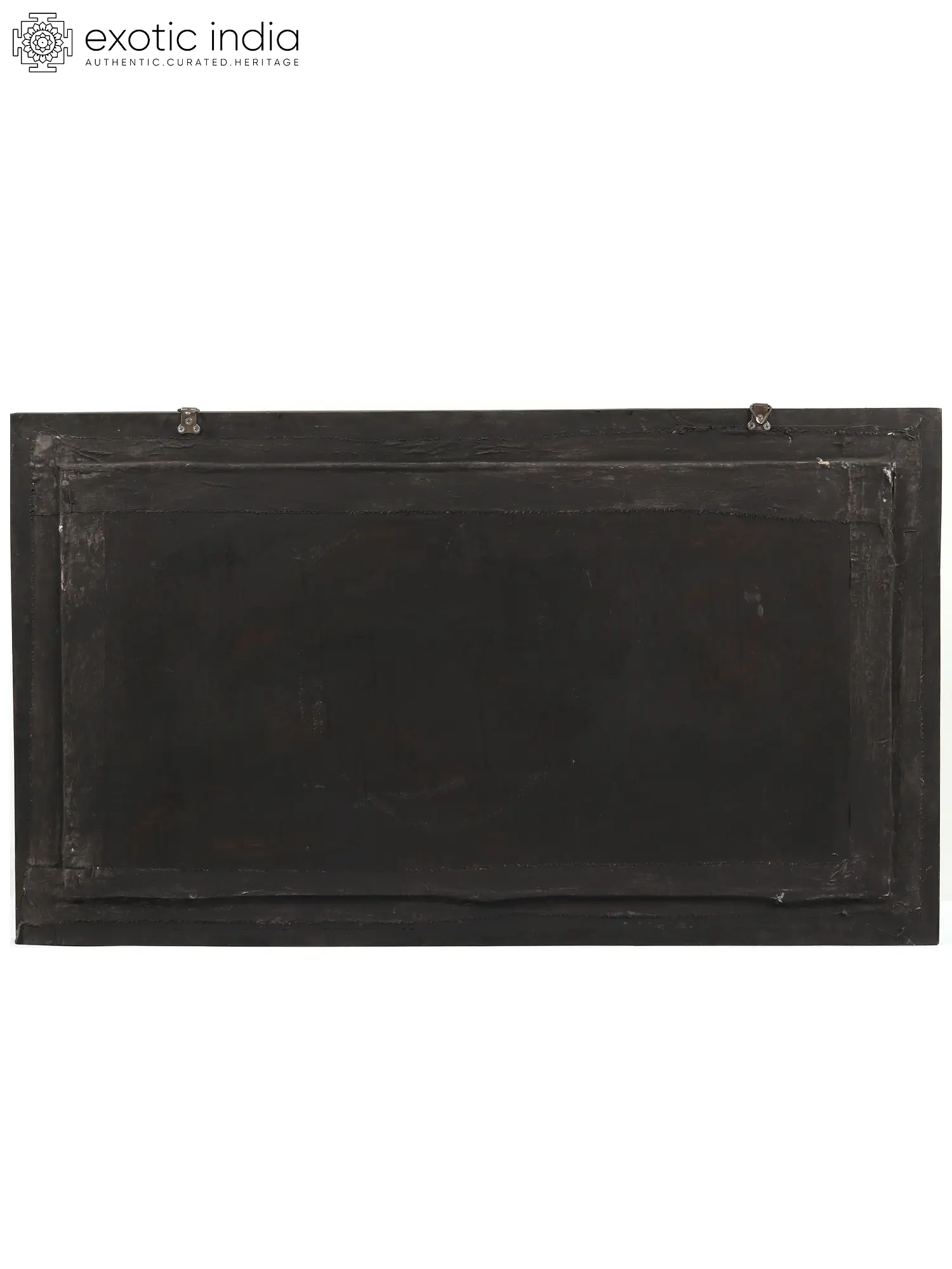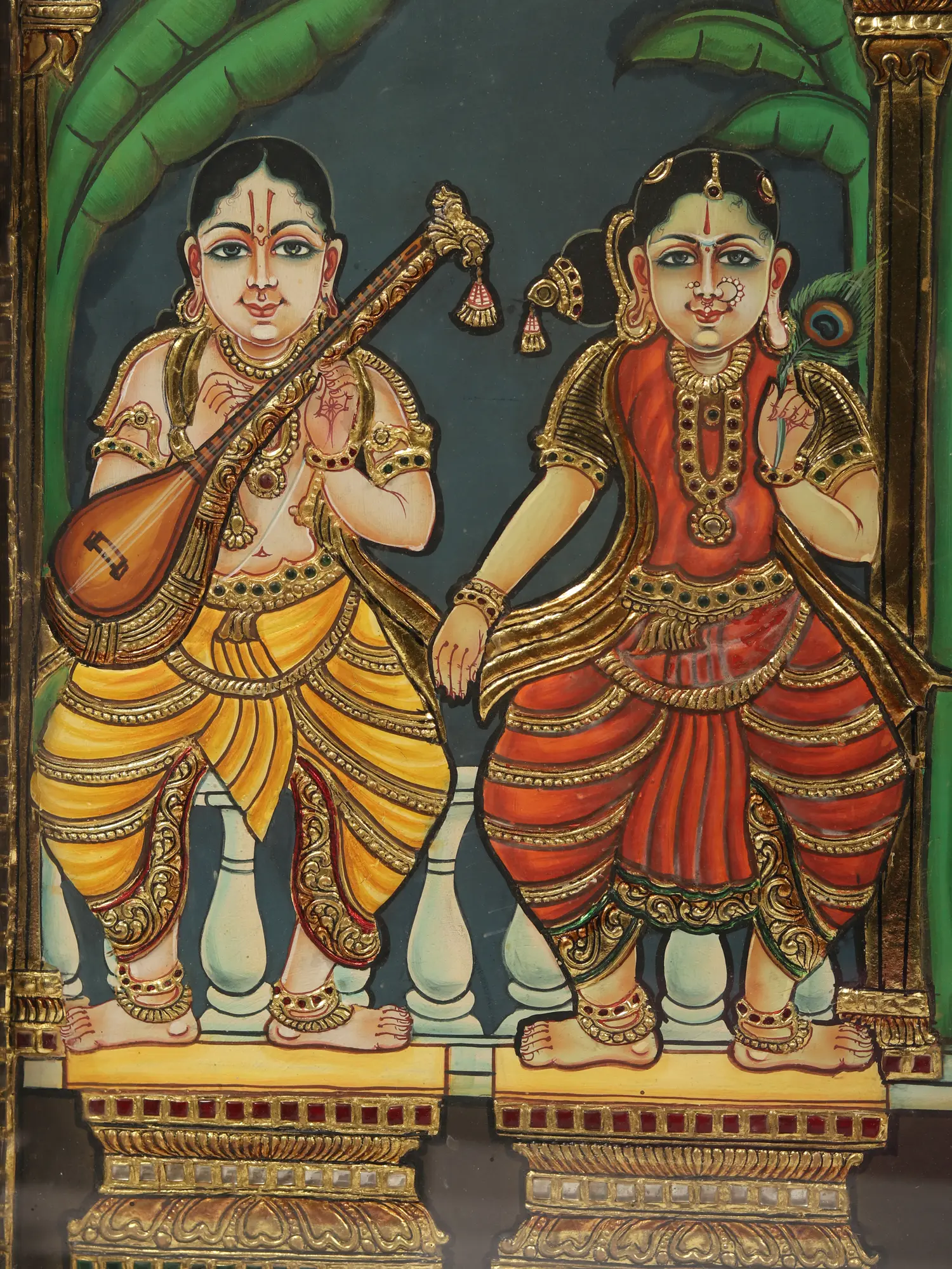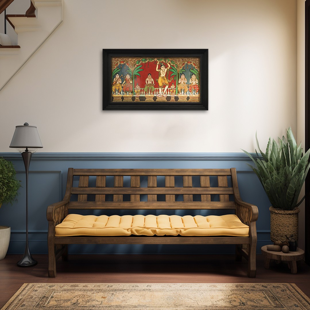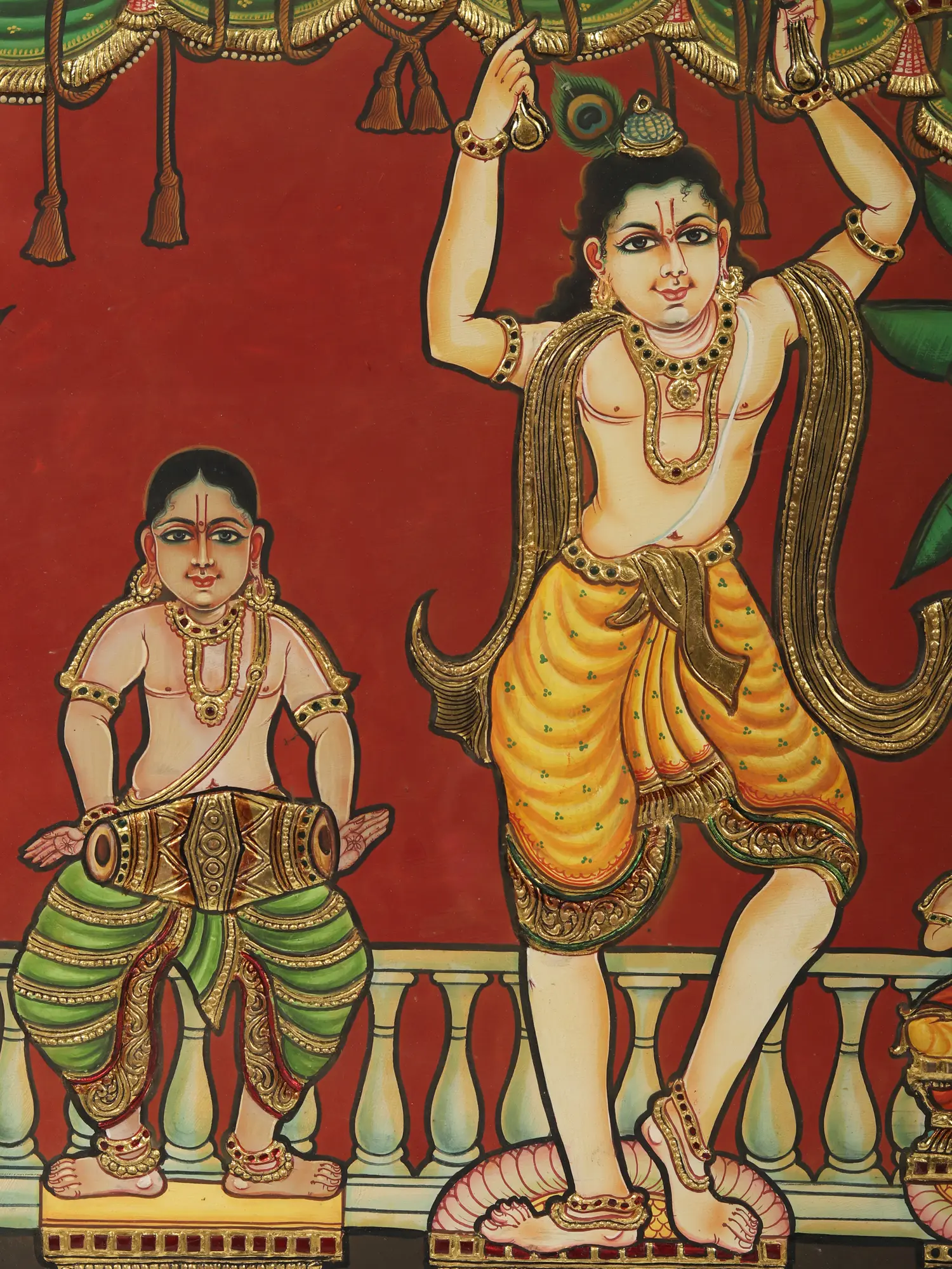 A rare 3-feet wide depiction of the elements of Bhakti (devotion) as embodied by the Bhakta, this Tanjore painting showcases the ecstasy of Sri Pancha Tattva- Sri Chaitanya, Nityananda, Advaita, Gadadhara, and Srivasa, the five core elements of achieving Krishna, according to Gaudiya Vaishnavism.
