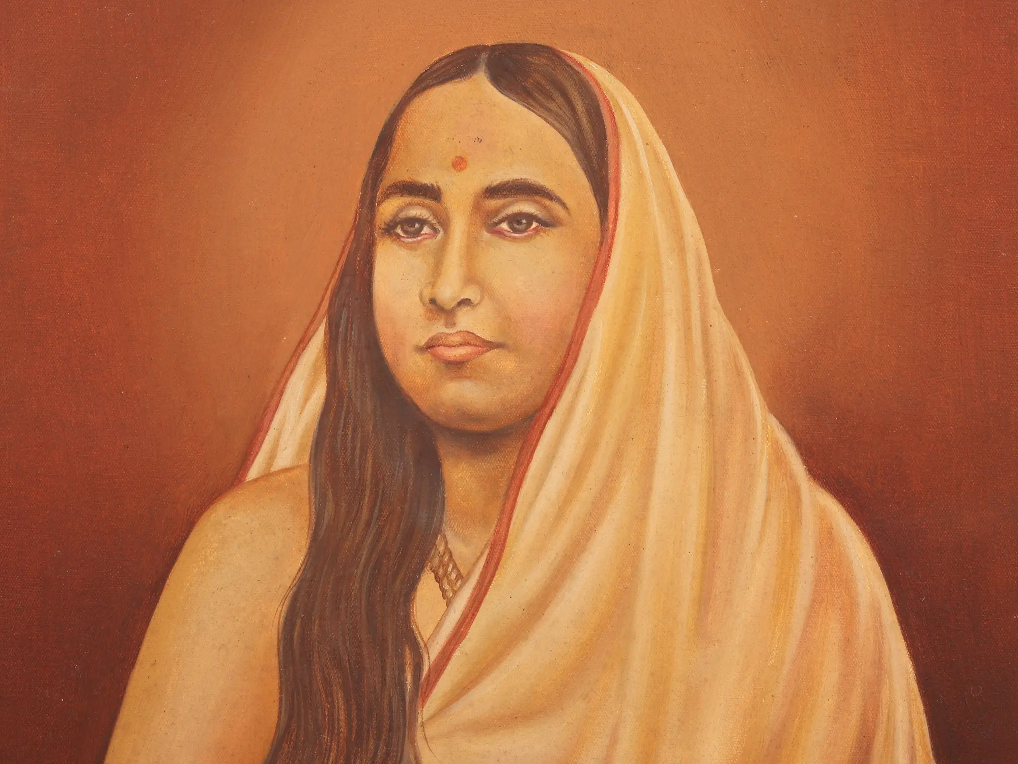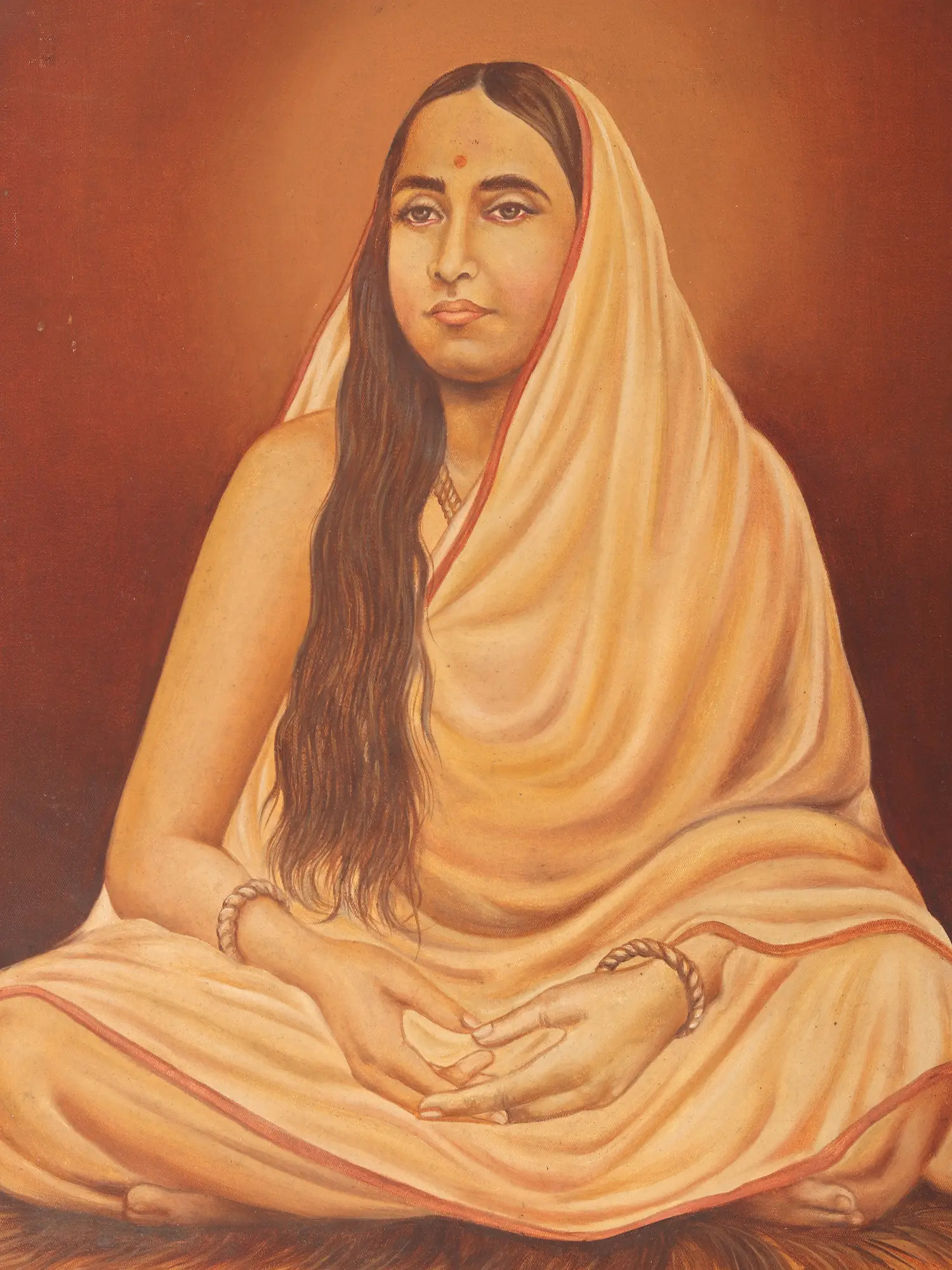 The expression, which exhibits her concentrated stare on the beholder, demonstrates her ever-present concern for her children. Her posture in the Dhyani Mudra is indicative of her meditative lifestyle. The subtle interplay of similar colors accentuates the serene aura surrounding Sri Sarada Devi, emphasizing both spiritual essence and earthly grace. This artwork not only captures the physical likeness but also delves into the spiritual and emotional facets of portraiture, transcending mere visual representation.