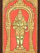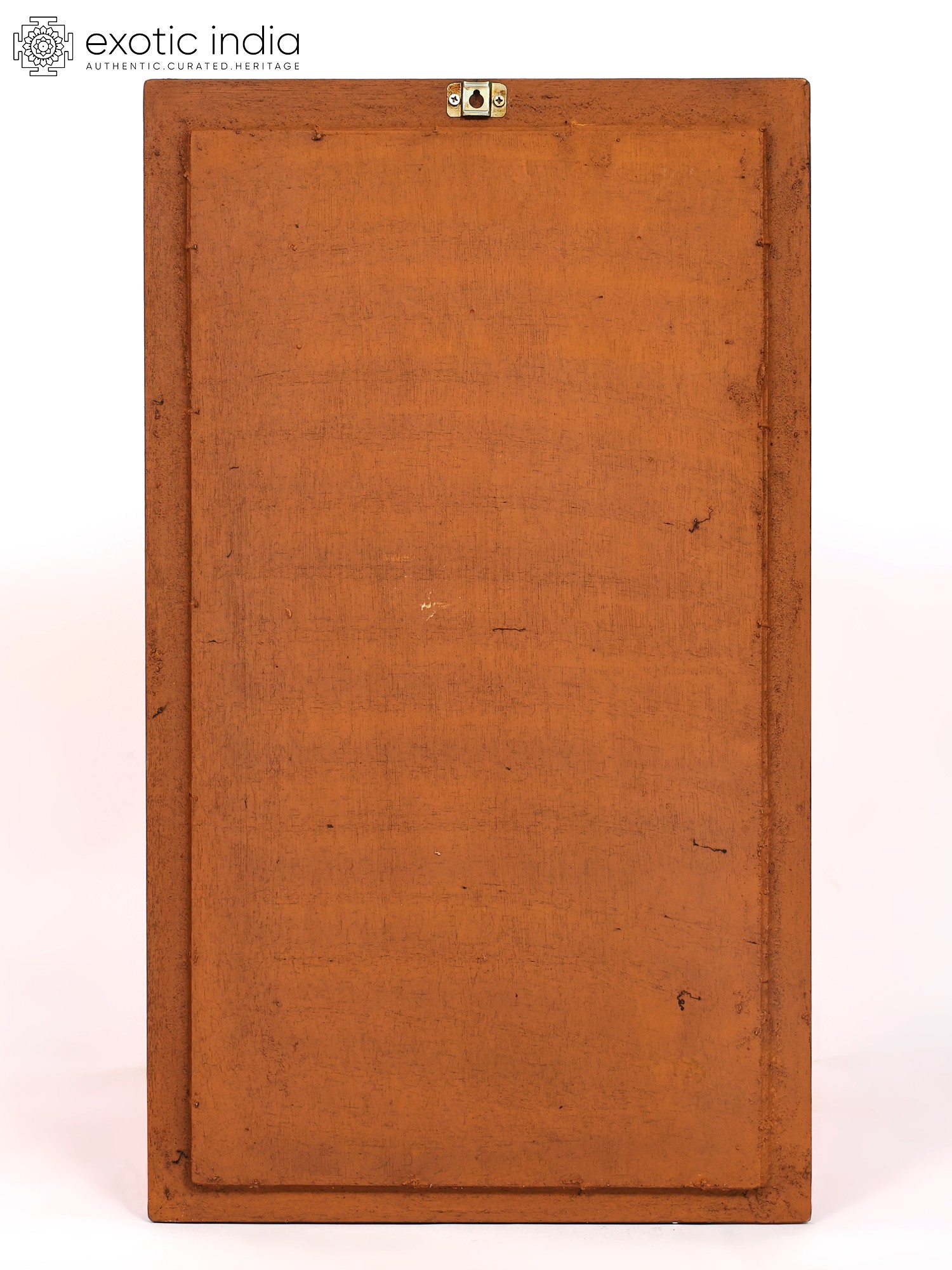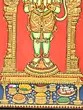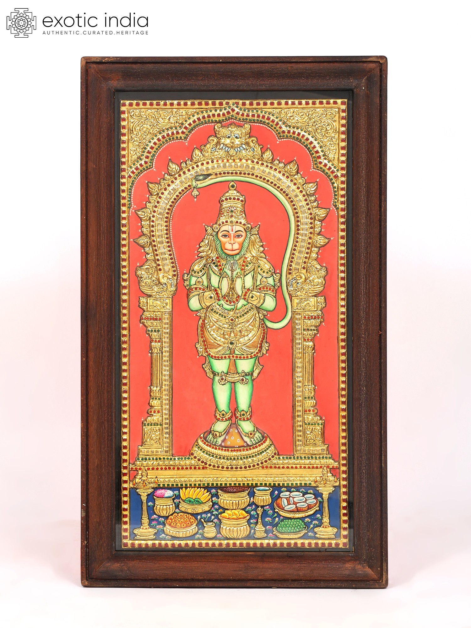 Lord Hanuman is a central figure in the epic Ramayana, celebrated for his unparalleled devotion, immense courage, and extraordinary feats. He is revered as a symbol of loyalty, strength, knowledge, and selfless service. In the Ramayana, Hanuman's leap across the ocean to Lanka to find Sita, his heroic battles, and his carrying of the Sanjeevani herb are legendary. His unwavering faith in Lord Rama and his dedication to righteousness have made him an embodiment of the ideal devotee, inspiring countless individuals across generations. The Namaskar Mudra, as depicted here, is a universal symbol of greeting, respect, and humility, further emphasizing Hanuman's devotion. This posture is often seen in Indian art and culture as a sign of acknowledging the divine and showing deep respect. The archway surrounding Hanuman in the painting is a typical element in Tanjore art, symbolizing a sacred space or a divine gateway. The detailed embellishments on the arch, including miniature deities or auspicious symbols, add to the sacredness and grandeur of the composition. The base of the painting features a vibrant tableau of offerings, including fruits, sweets, and a traditional oil lamp (Diya). This depiction of offerings underscores the devotional aspect, signifying the reverence and worship offered to the deity. The intricate patterns and the liberal use of gold create a rich tapestry that not only pleases the eye but also evokes a spiritual aura. This painting is a profound representation of faith, strength, and the divine connection that Lord Hanuman represents, making it a captivating addition to any sacred space or art collection.